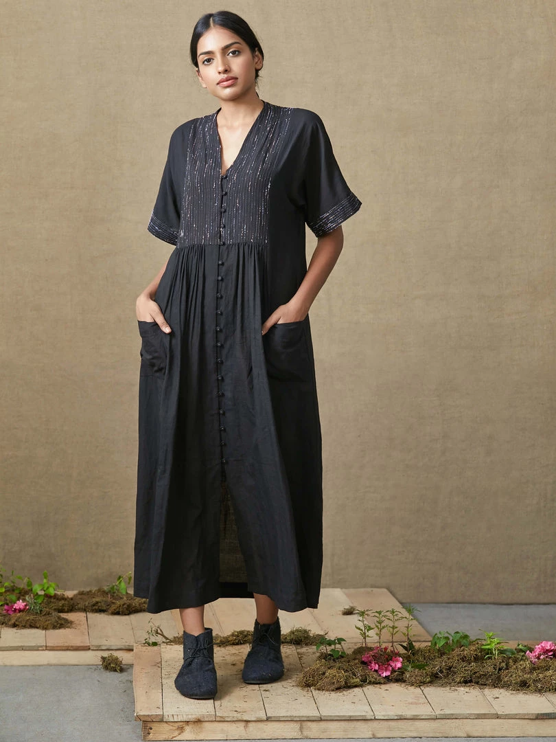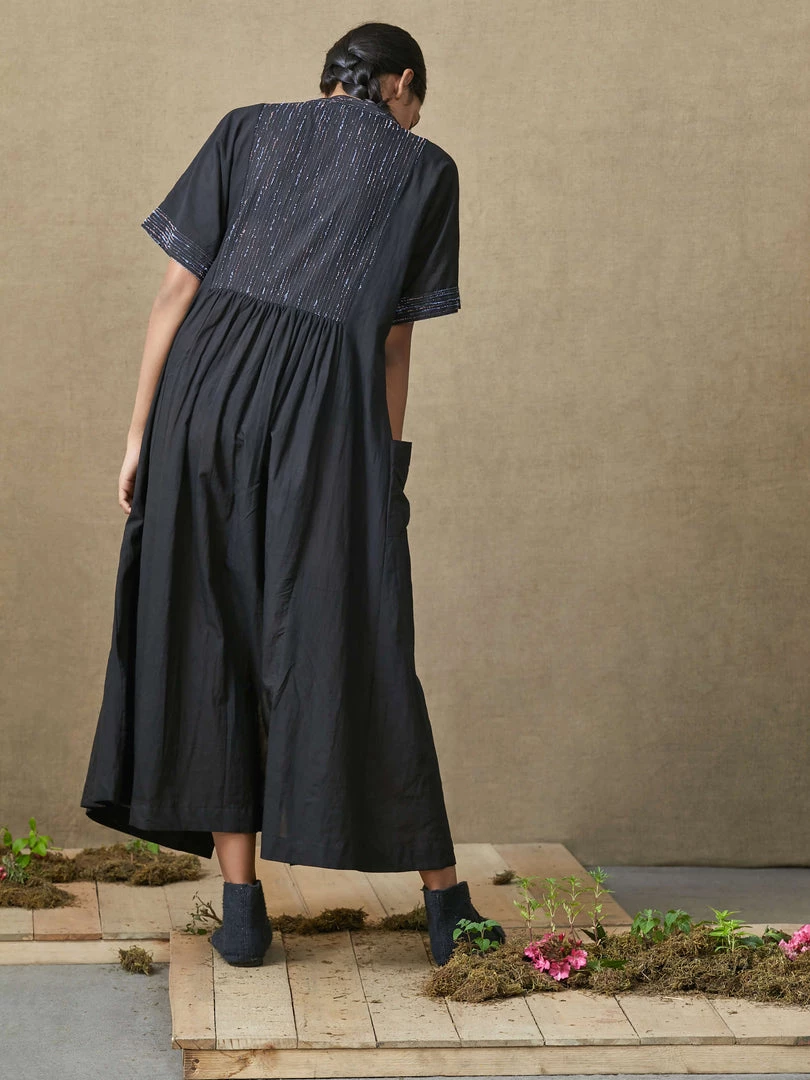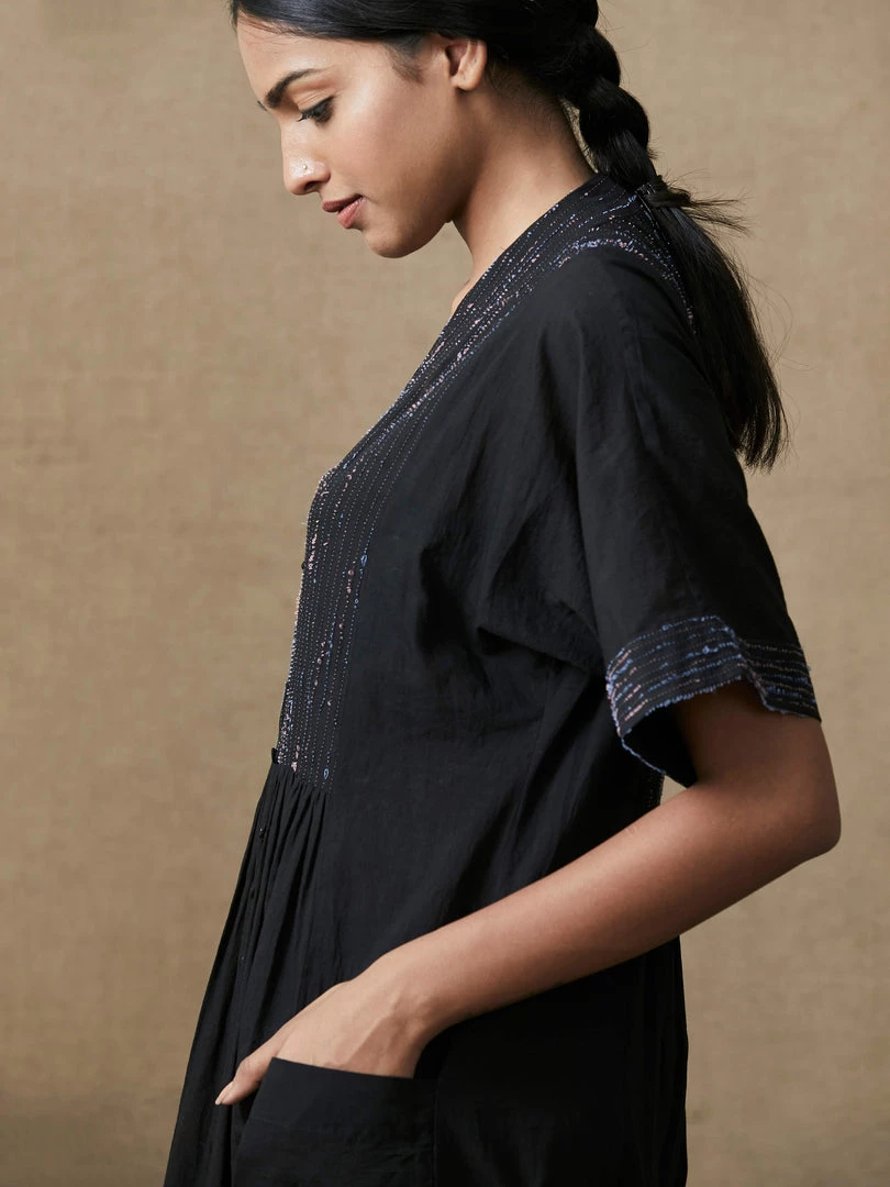 Reflecting on the beauty of imperfections in nature, this black dress comes with broken thread work on the yoke, back and selvedges of the sleeves. The comfortable fit and snug cotton fabric would tempt you to make it your live-in companion! Â