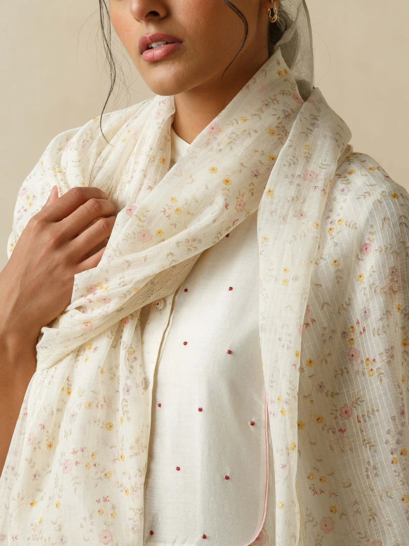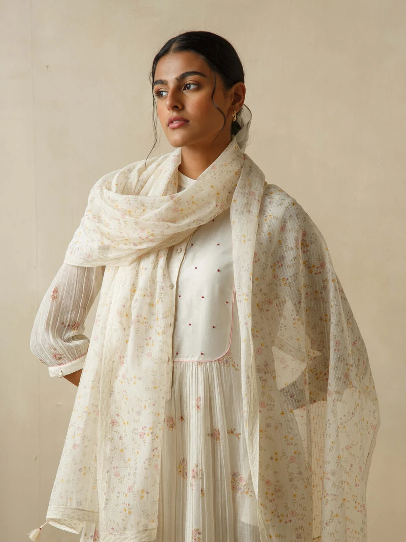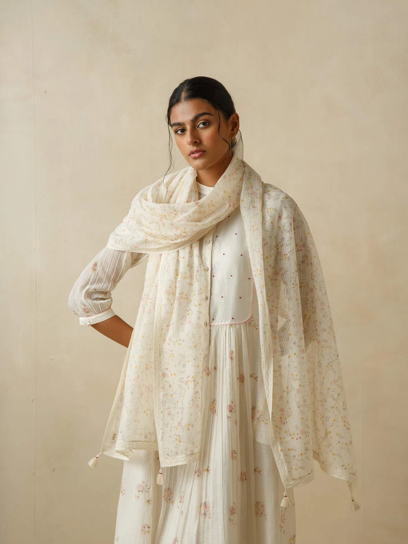 Accessorize or layer up our dresses and tops from Buna with this sheer hand block printed scarf made in cotton silk fabric with lace edgings and tassels.