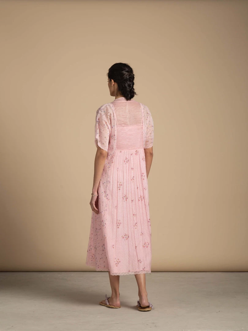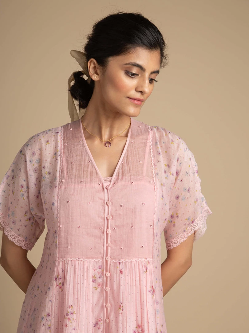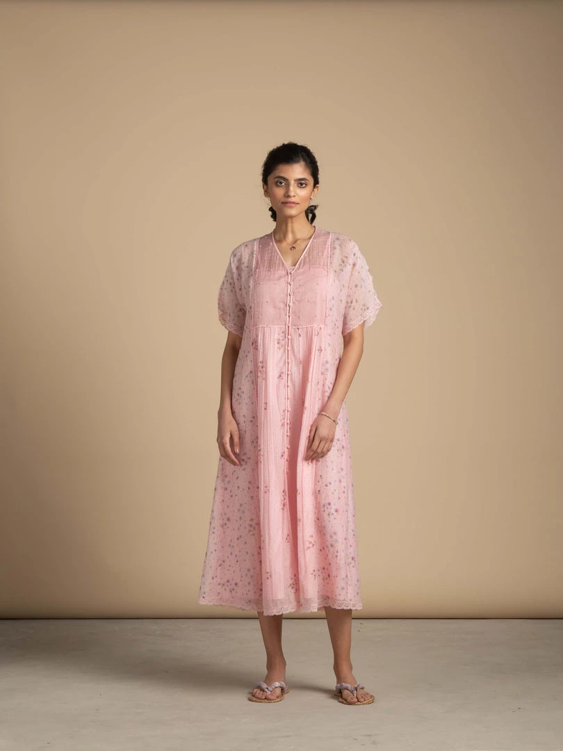 Our long line front open dress features dropped sleeves, fabric covered buttons, and a beaded tissue yoke in our signature garden prints.