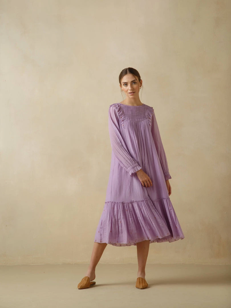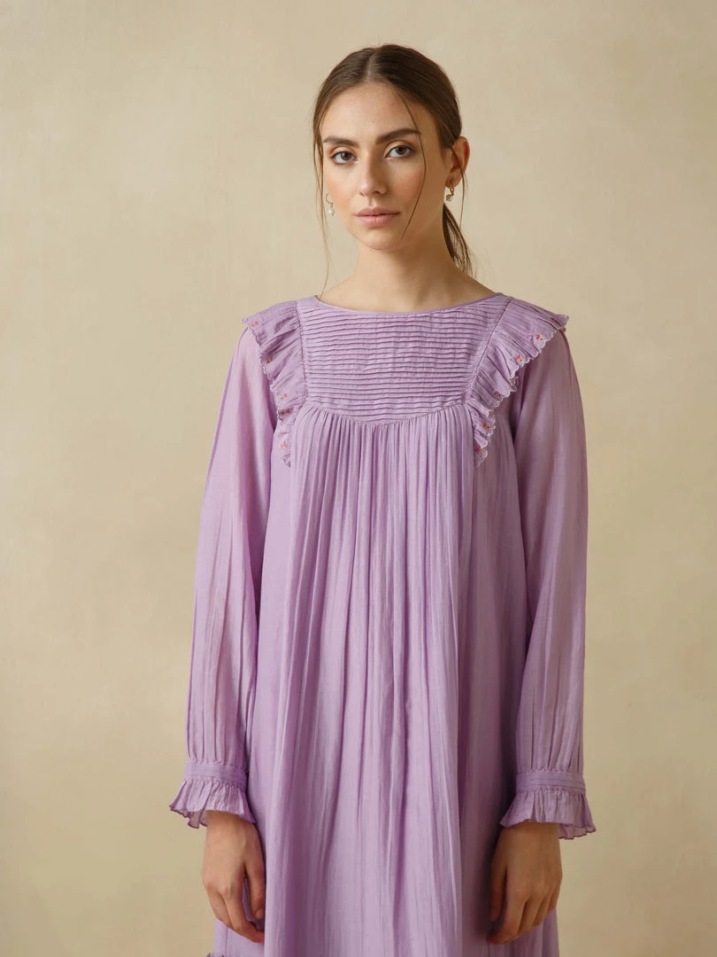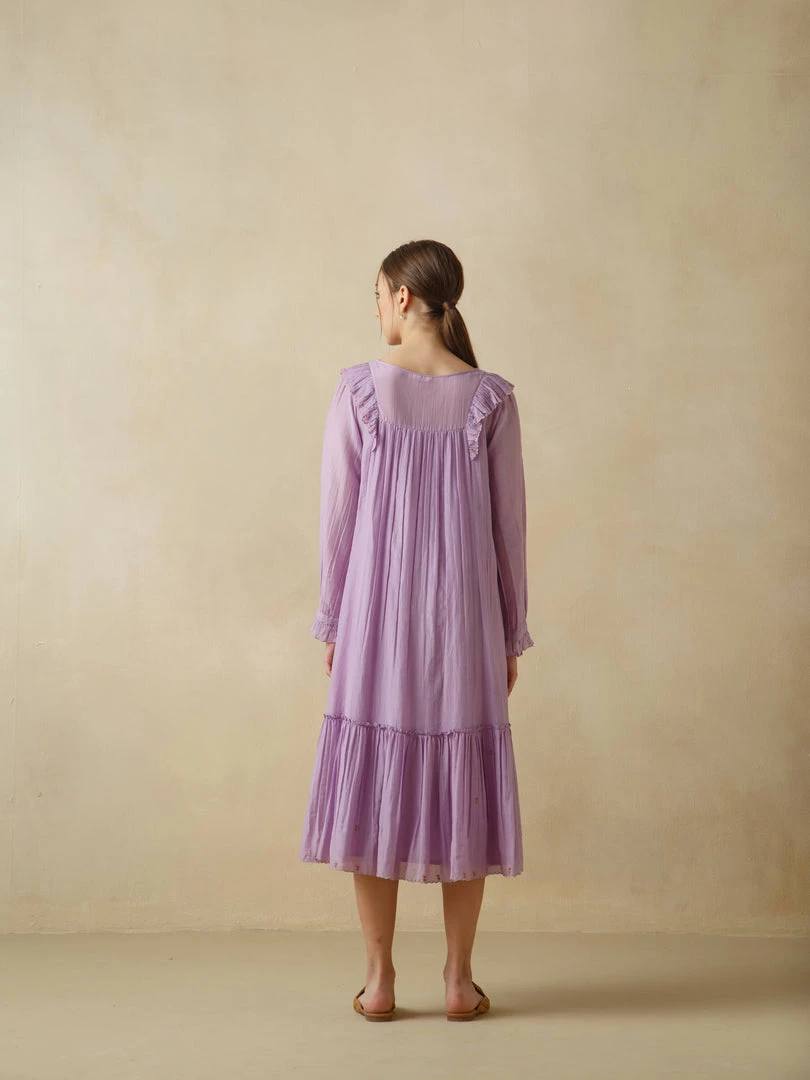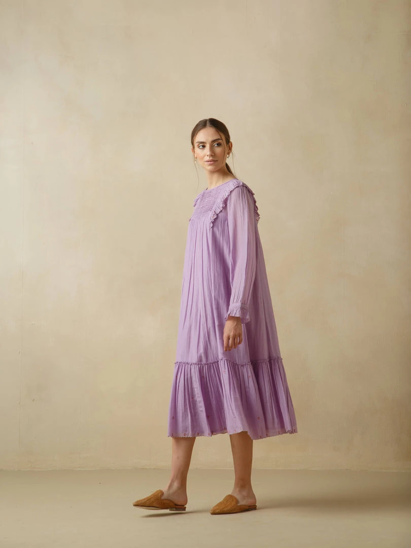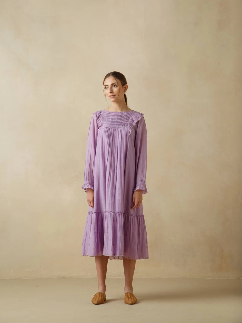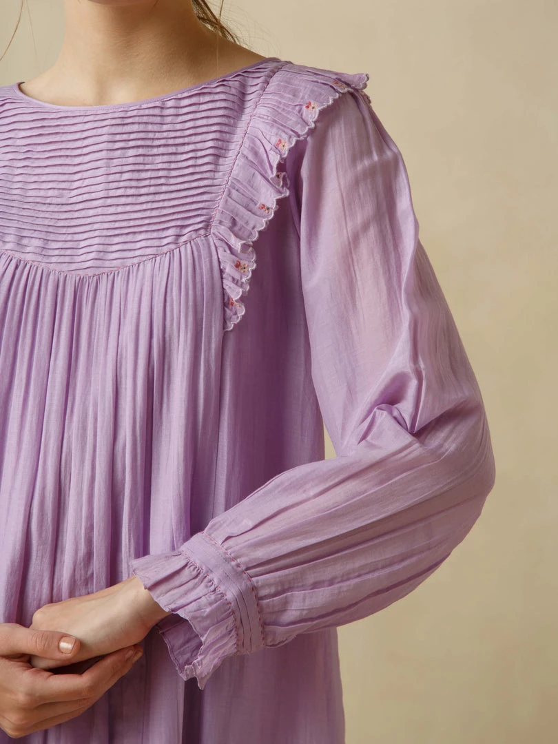 Evocative of laidback summer days, our pleated Mayfield Geranium ruffle dress comes with playful volume and delicate floral embroidery. Made in fine cotton silk fabric in a soft shade of lavender, this dress is a summer staple.Â