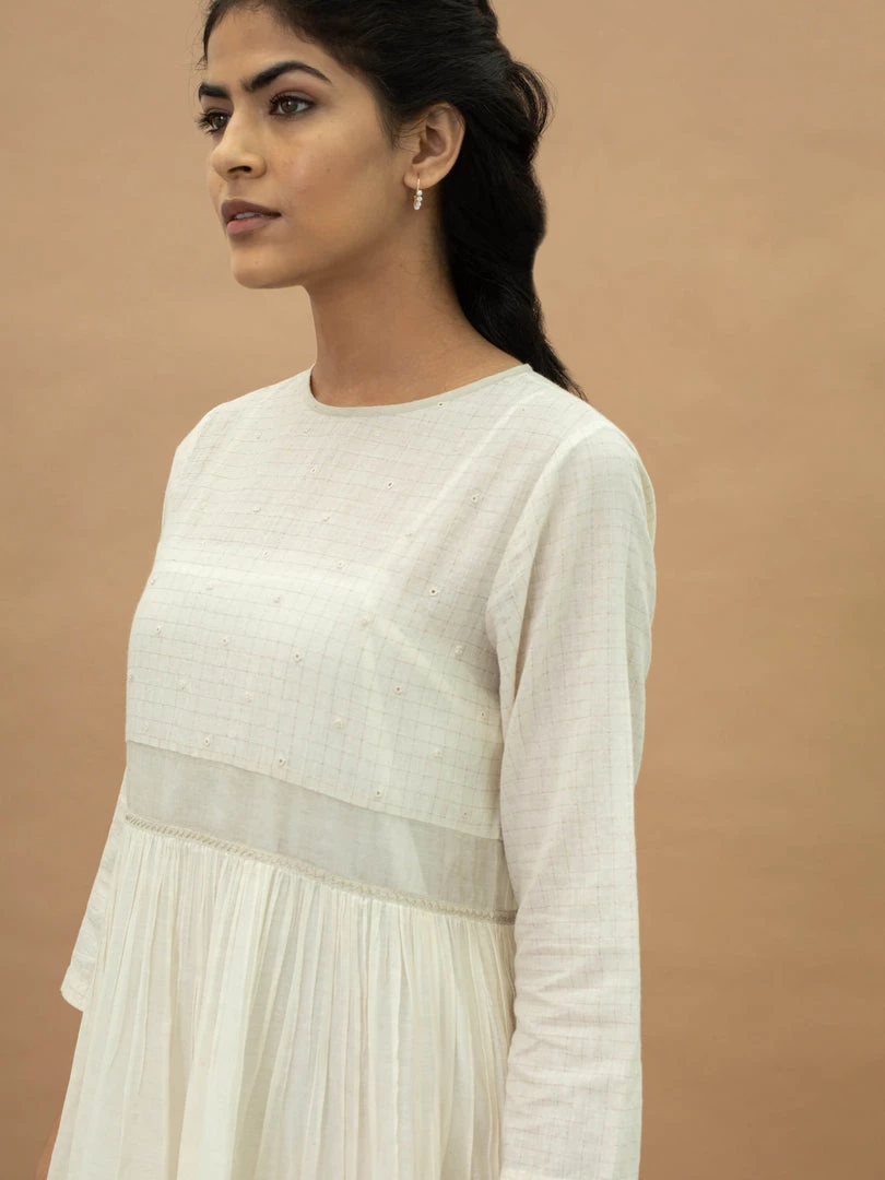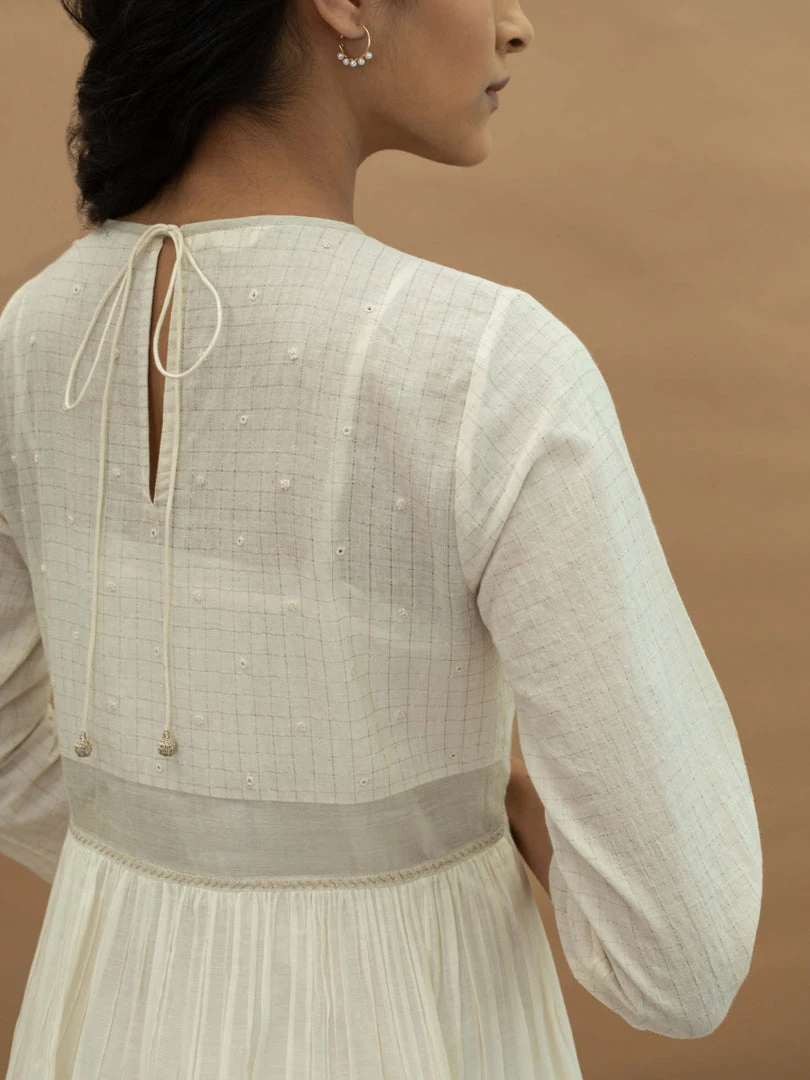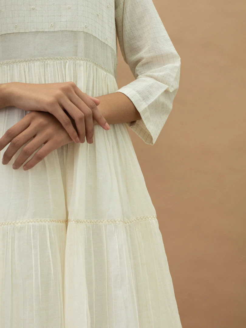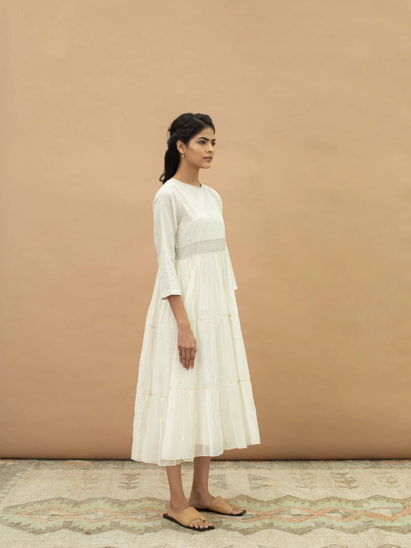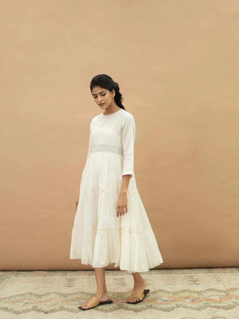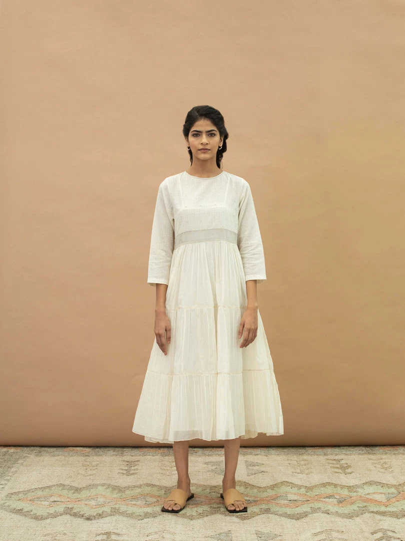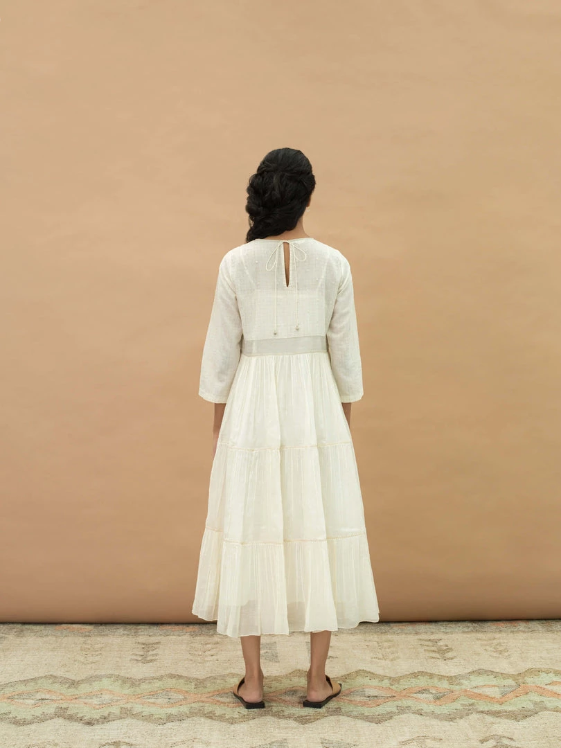 Slip into this feminine midi dress with traditional Indian vibes. It features a round neck, hand embroidery on yoke and a tiered skirt. Understated and minimal with luxurious details, wear it for afternoon brunches or evenings out with friends.