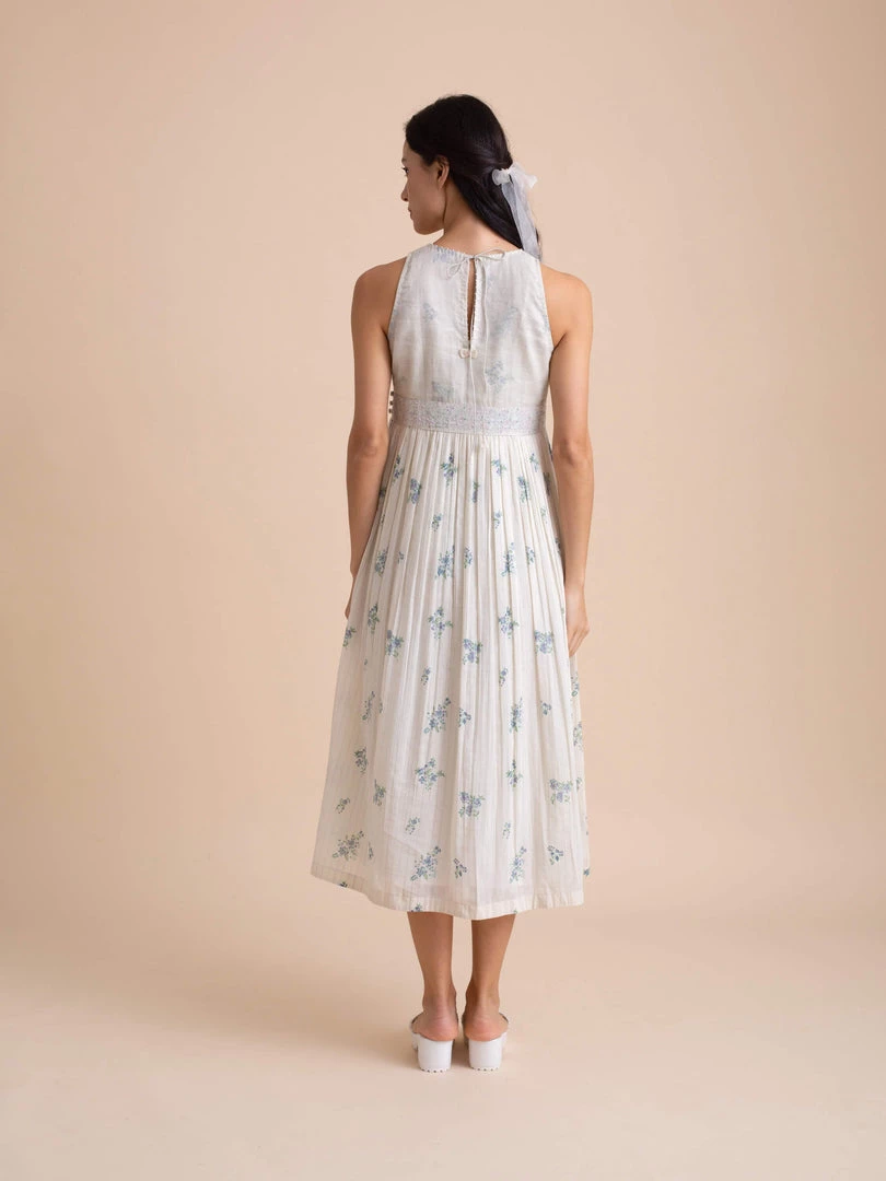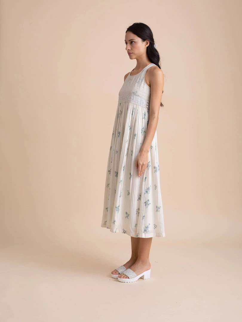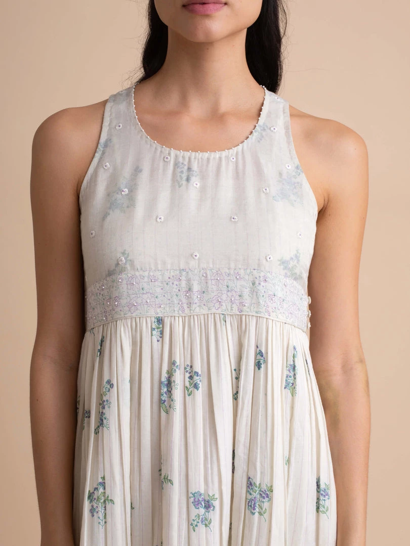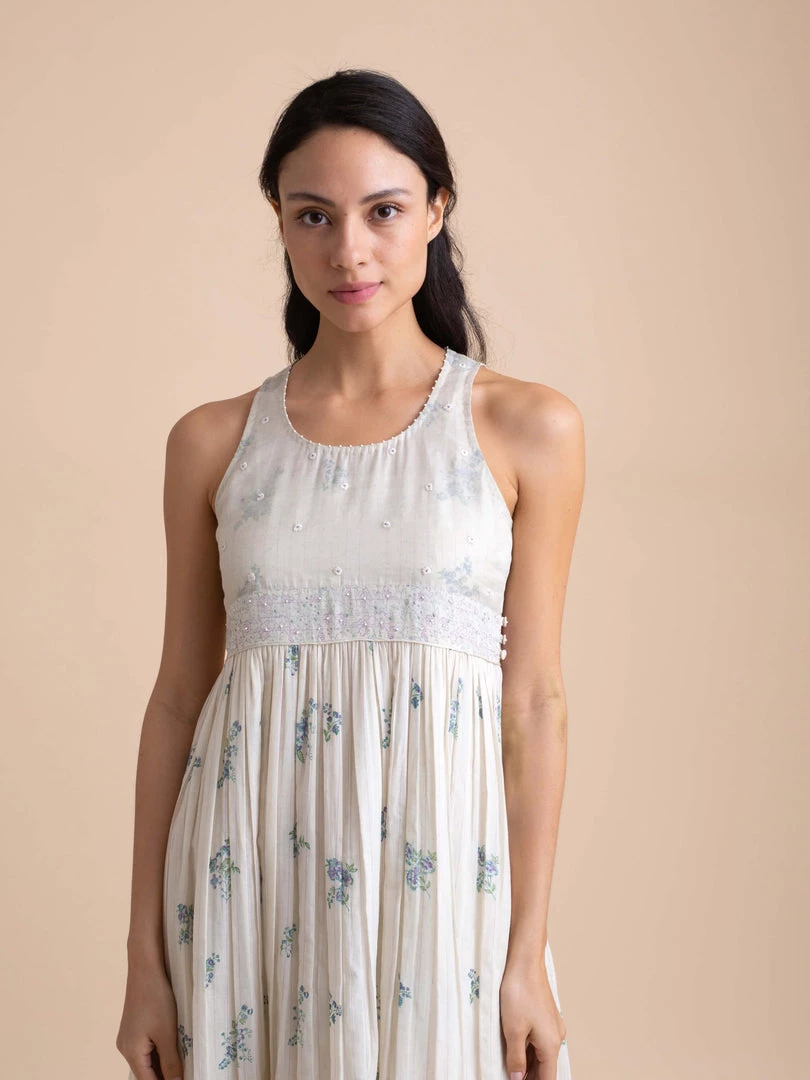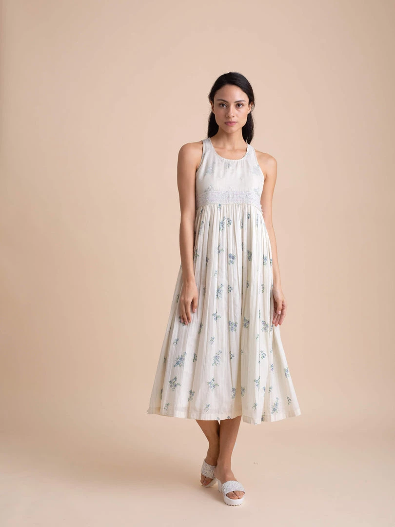Our round neck sleeveless dress with organza yoke and empire waistline is a dream in detail! It features delicate bead work on neck and is hand block printed with motifs of blue and violet flowers.