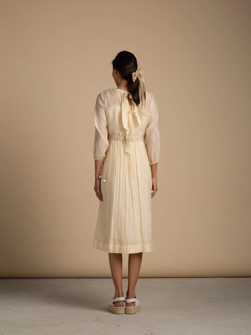Strewn with cutwork flowers on the yoke, this romantic dress is laden with soft details such as back bow tie-ups and tassel hangings on sleeves. Invoking a feminine dreamscape, this dress is a timeless addition to the wardrobe. Â