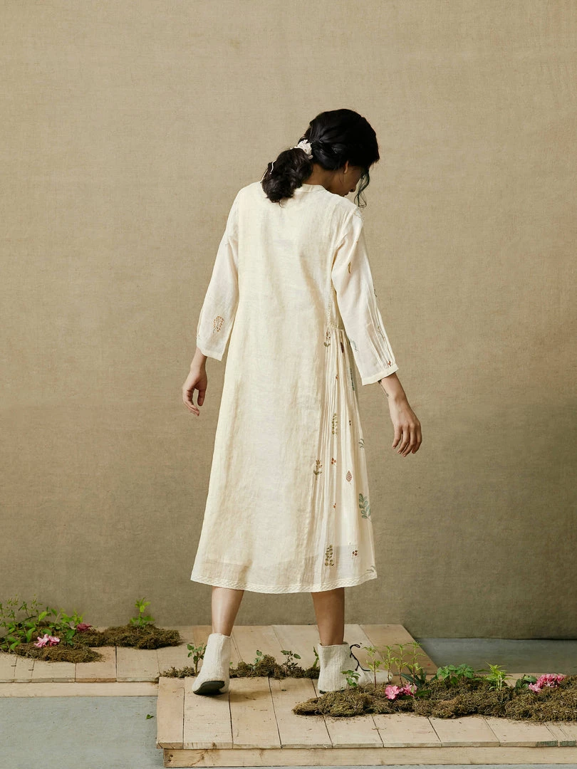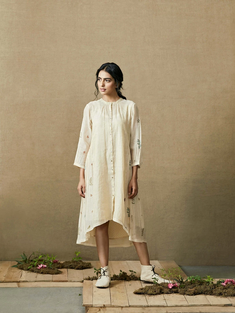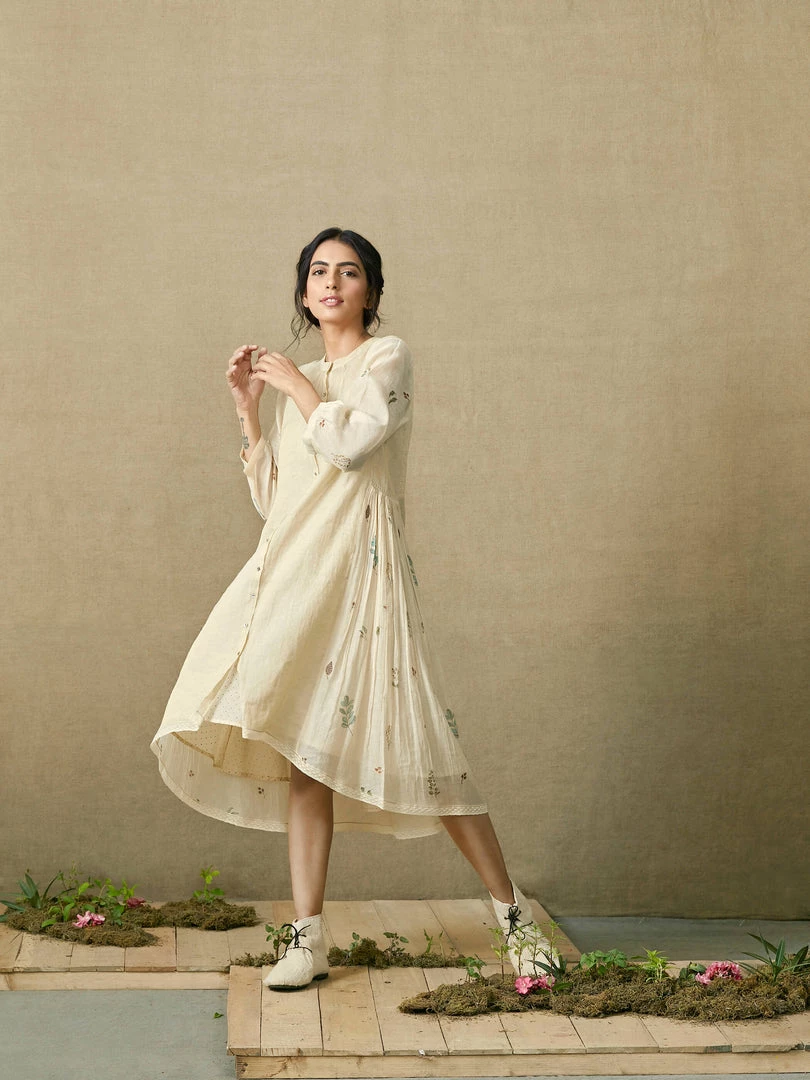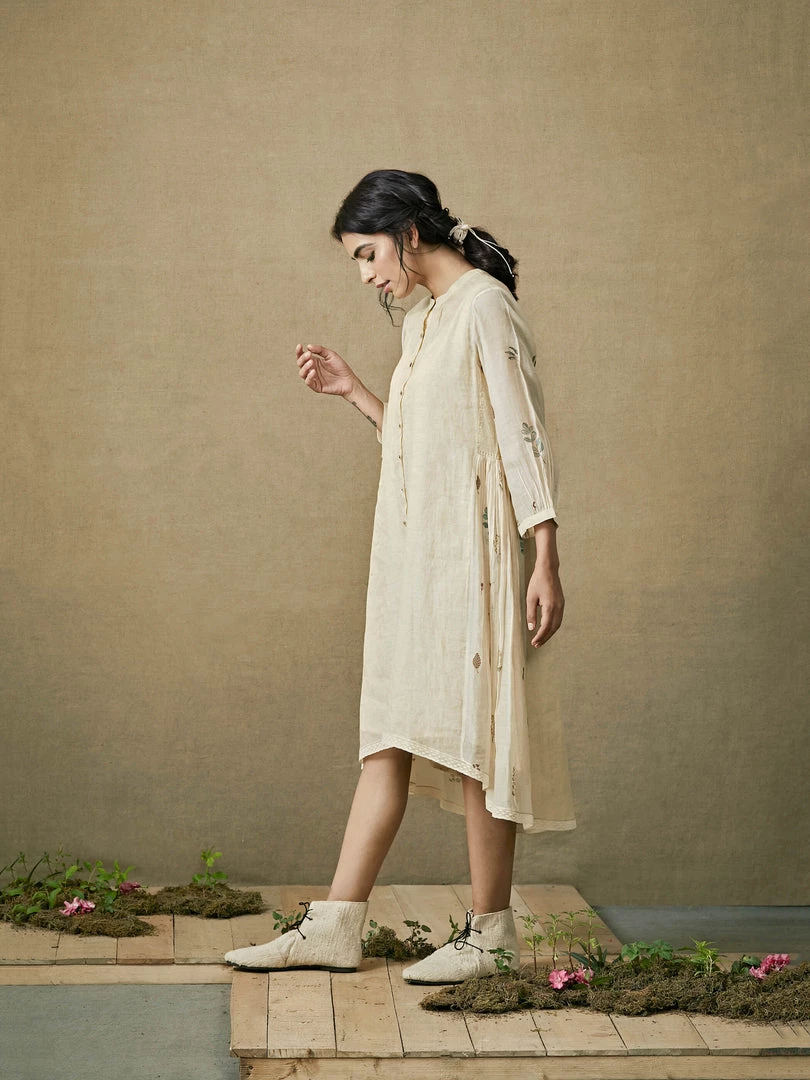 An understated festive addition to the wardrobe, this dress has a high low hem, block printed gathers on the sides and lace edgings. It comes with a dotted slip and can be paired with any of our fawn pants in this collection.