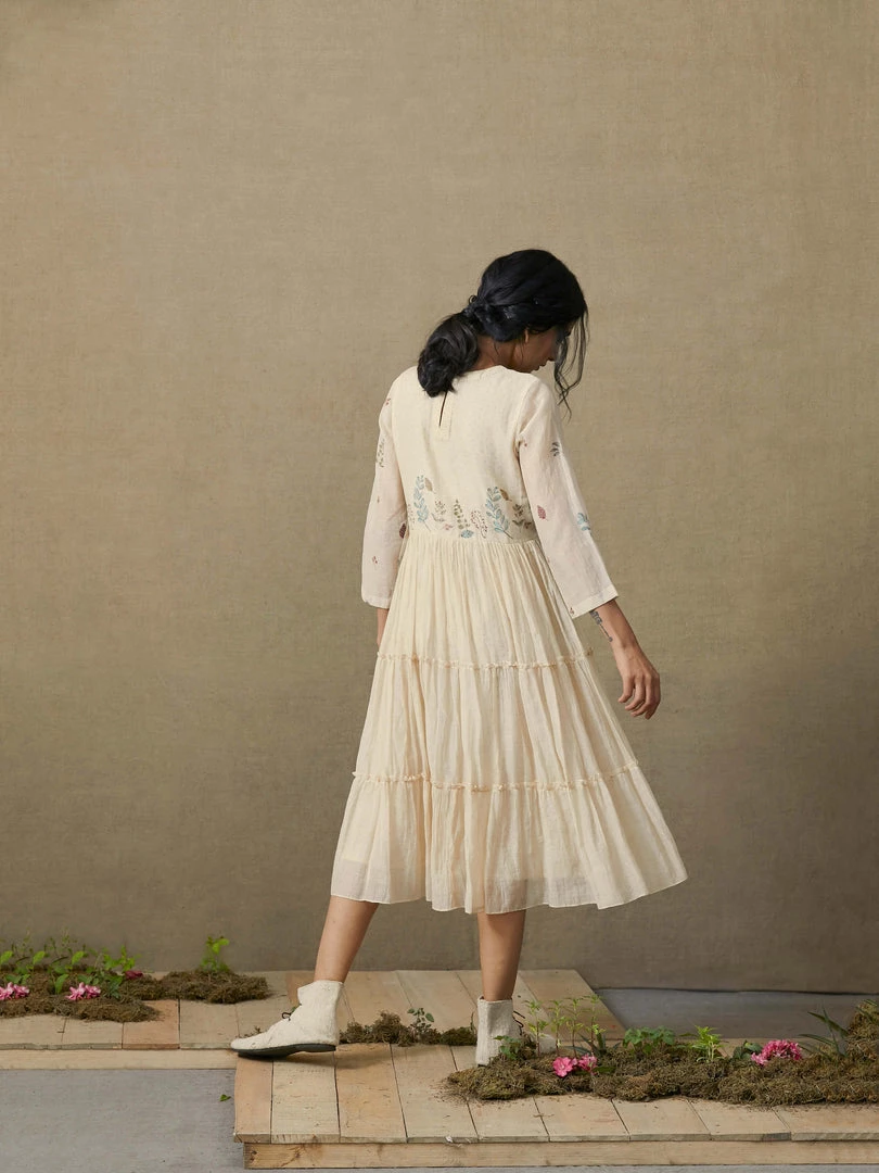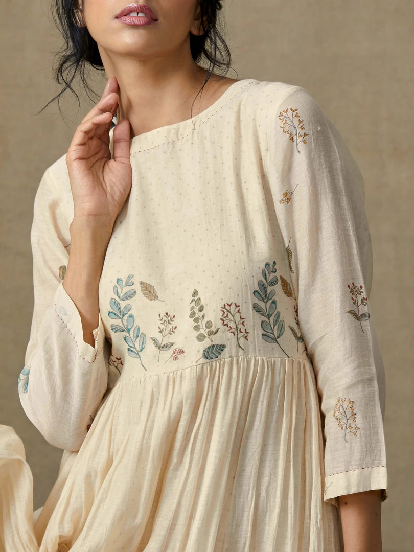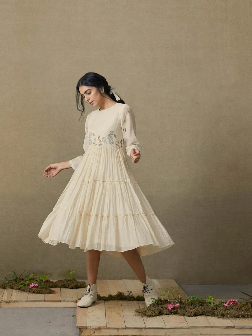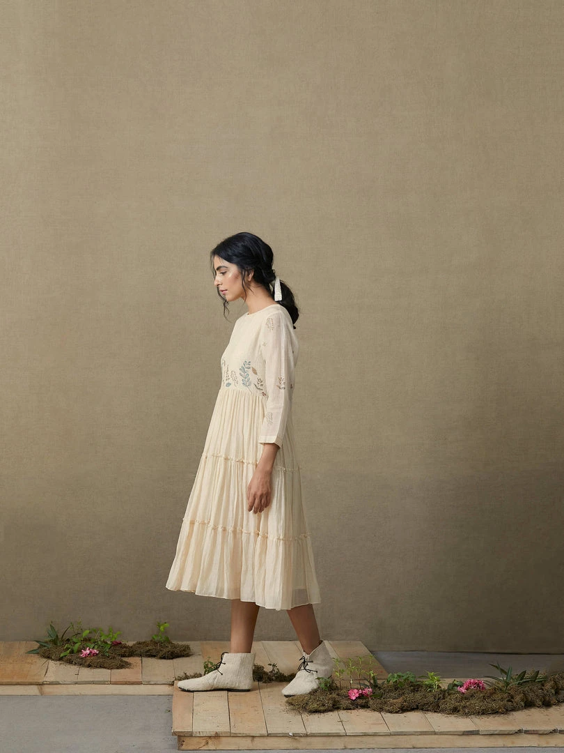 This one piece dress features a semi fitted upper bodice and delicate billowy tiers and gathers. The yoke beams genially with placement hand block printed flora motifs. Apt for casual or festive occasions.