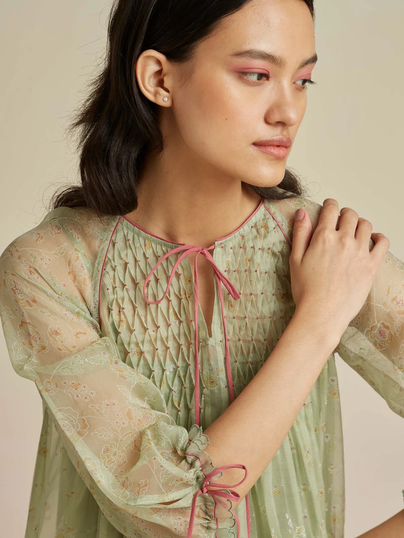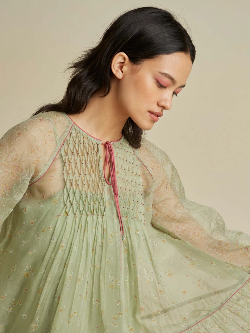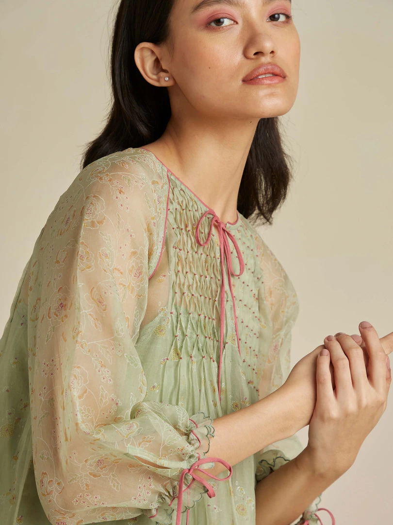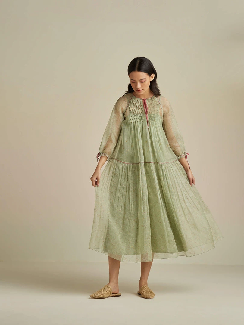 Our Calla Flounce Organza Dress is made from a whimsical silk organza fabric and features handblock printed painterly roses and vines and falls freely below the knees. Playful tiers, contrast piping and the delicate smoking details on yoke add to the charisma and romantic allure of the dress. Don it on festive gatherings to add a nifty swing to your steps!
