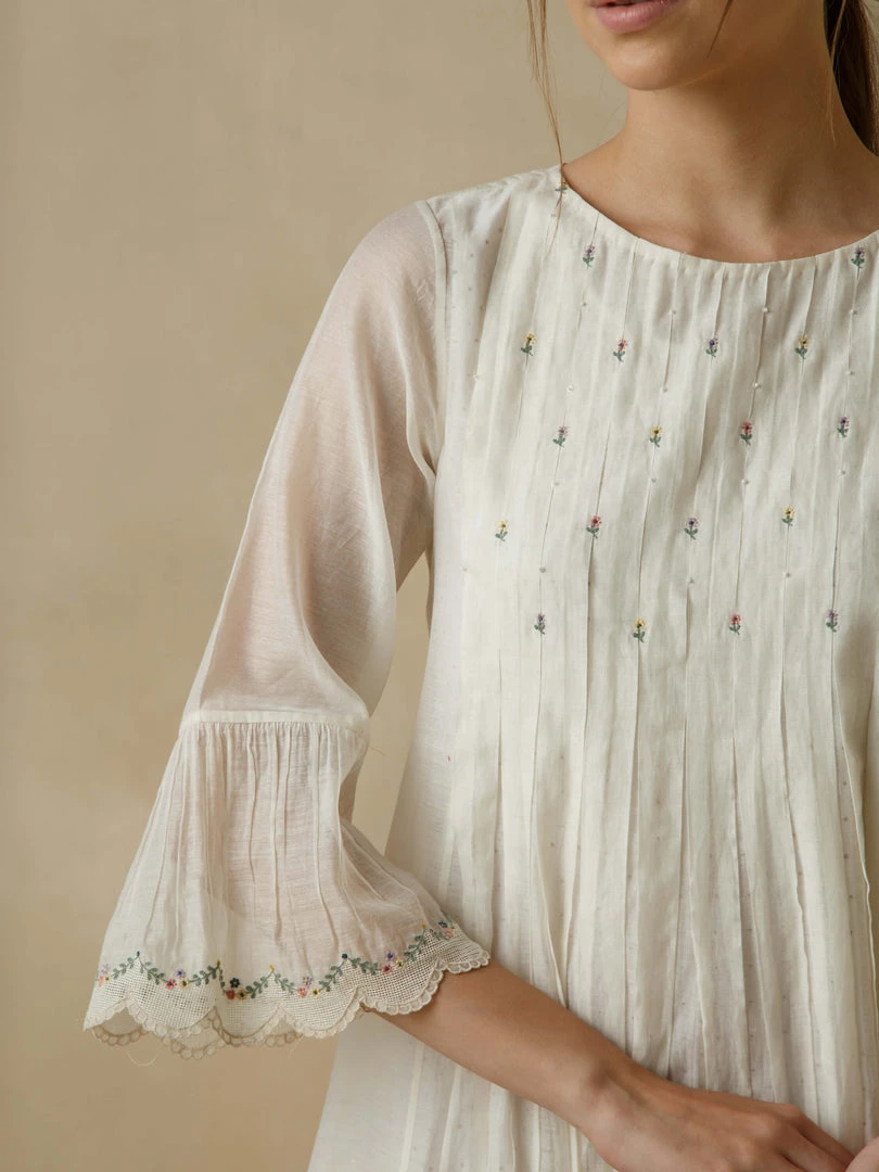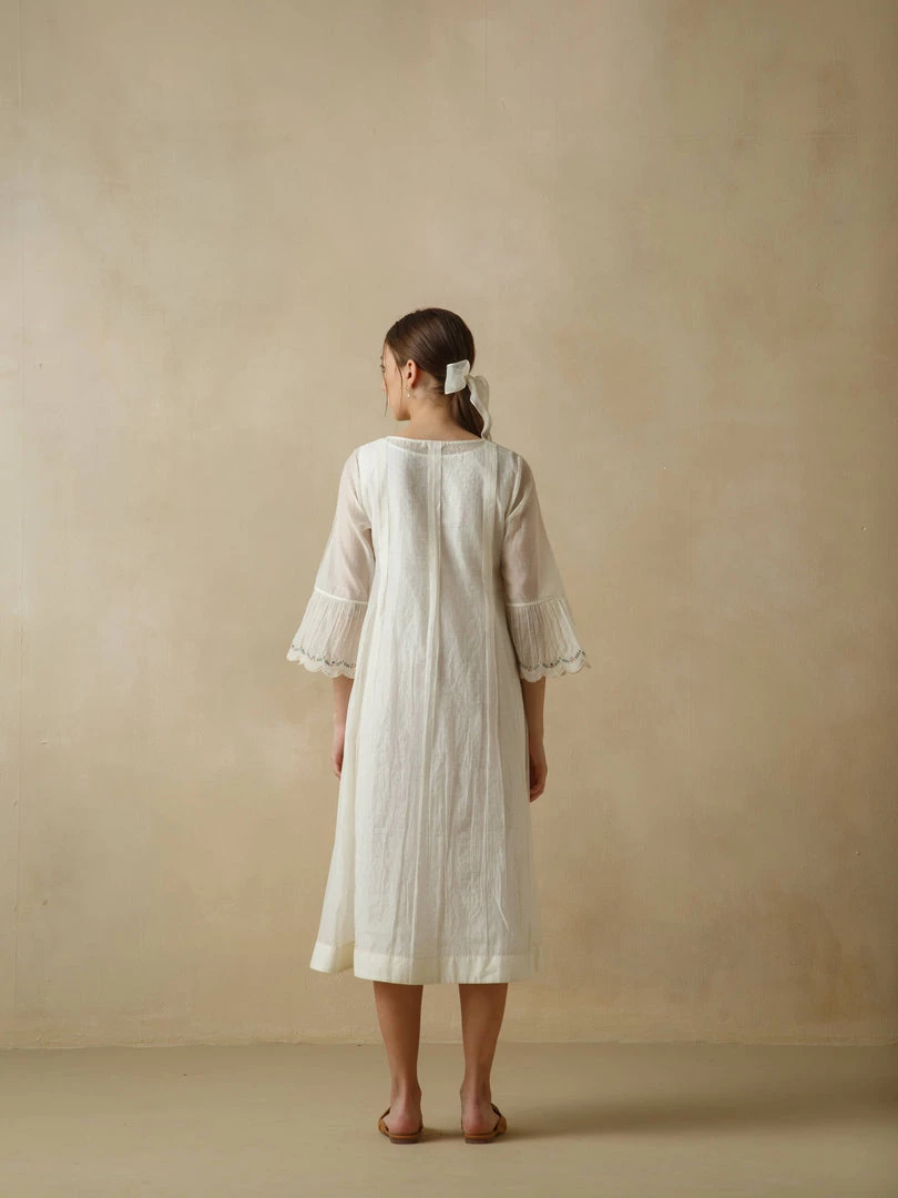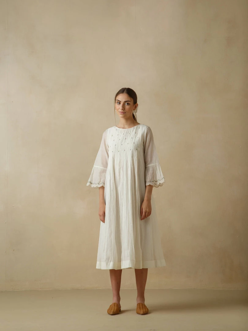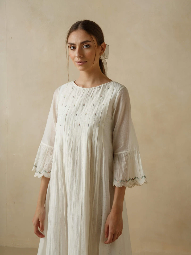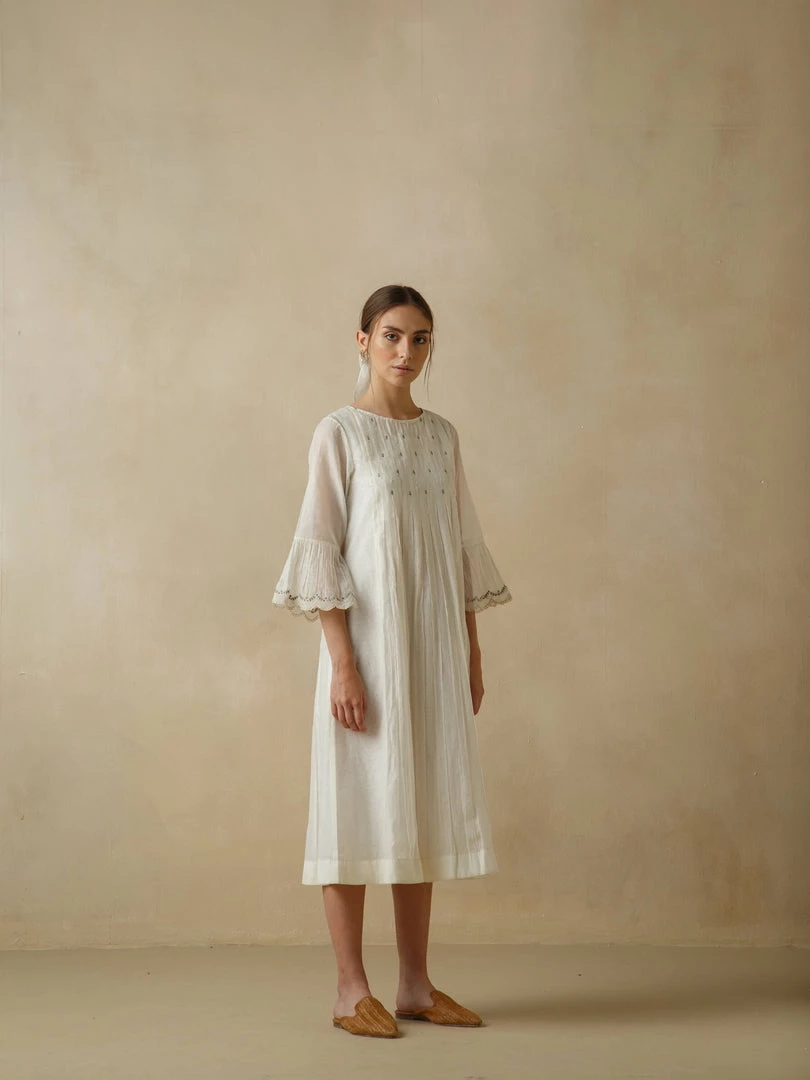 In a soothing shade of ecru, this dress comes with box pleats on the front and back yoke and cutwork lace embroidery with trailing florals on the sleeves. A summer staple for days out with friends and family.