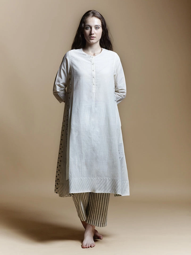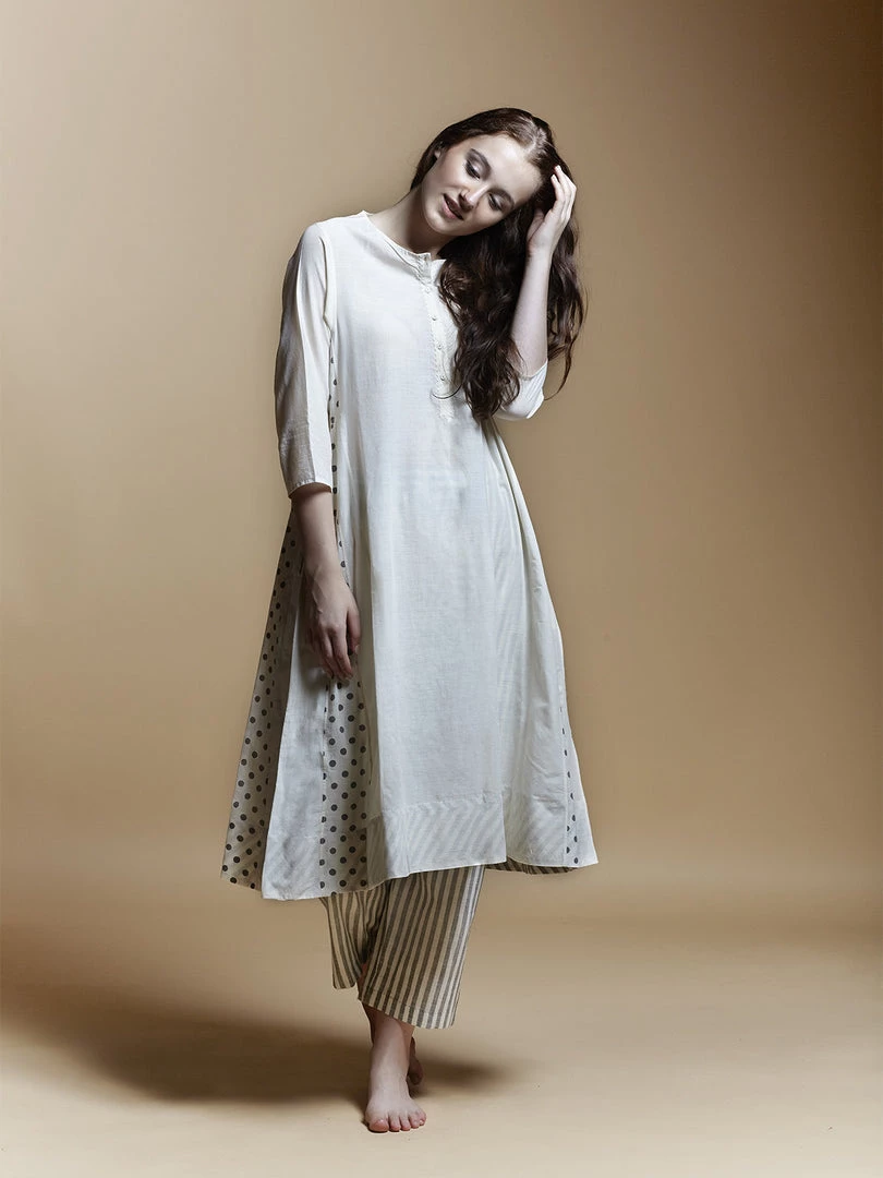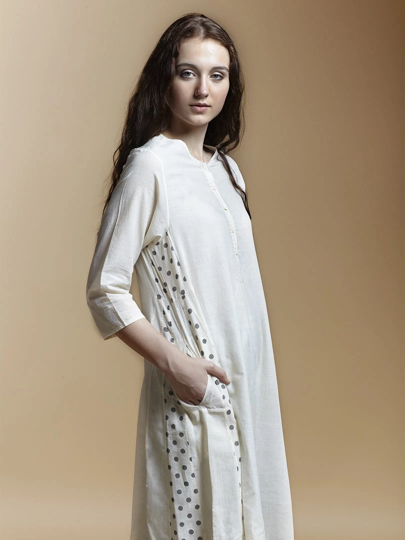 This modern kurta/dress, stitched from soft hand spun fabric, is light and breathable. The front placket, panelling and pockets add functionality to this simple yet indispensable summer classic.