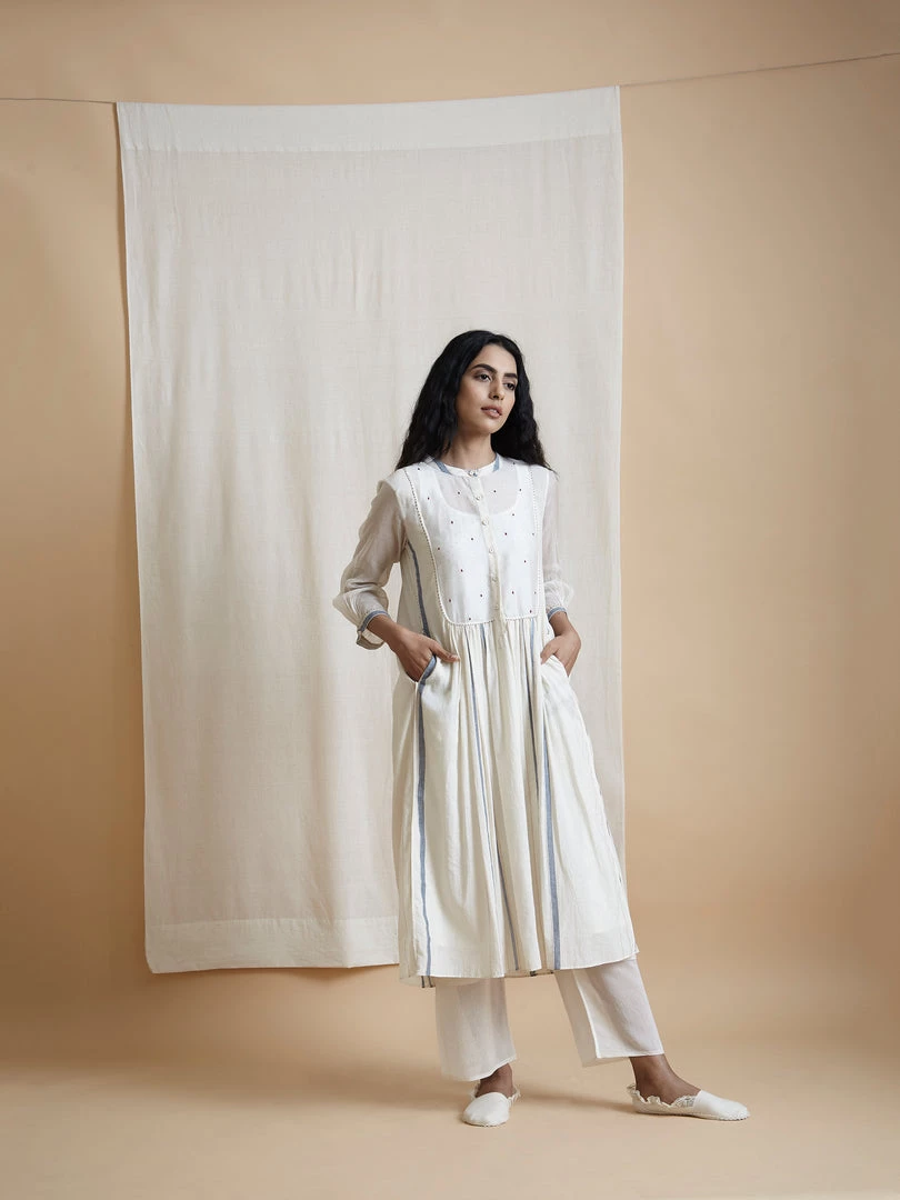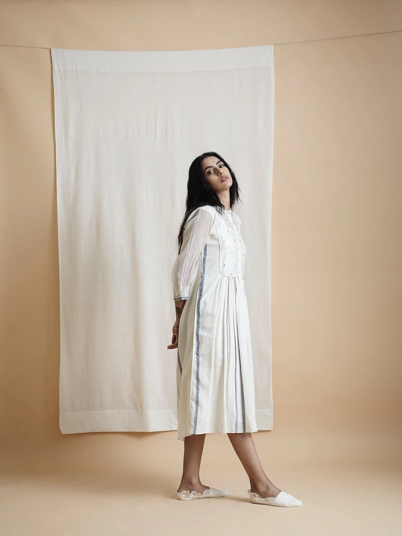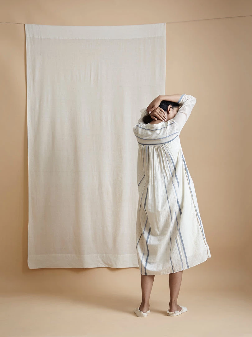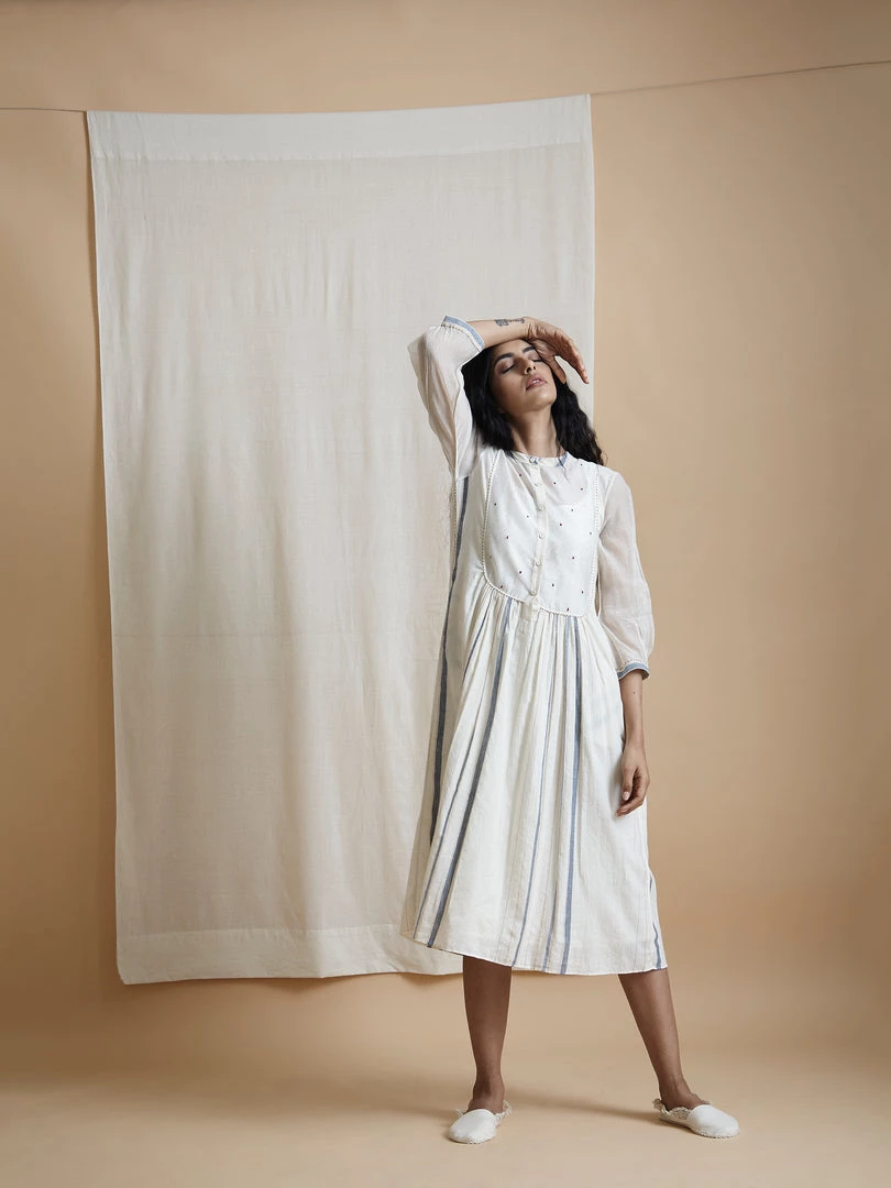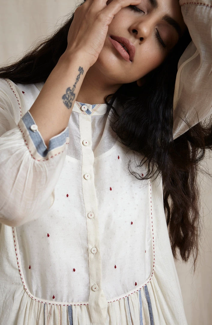 Slip into this dress of comfort and elegance to beat the scorching summer. Exquisite detailing on the yoke and a subtle play between sheer and opaque lends it depth. Time to bask in your own glory! It comes with a block printed dot slip.