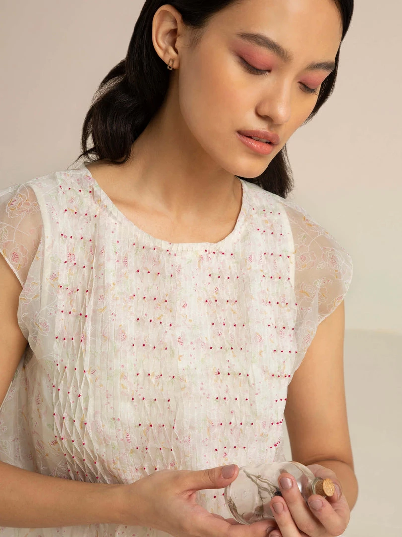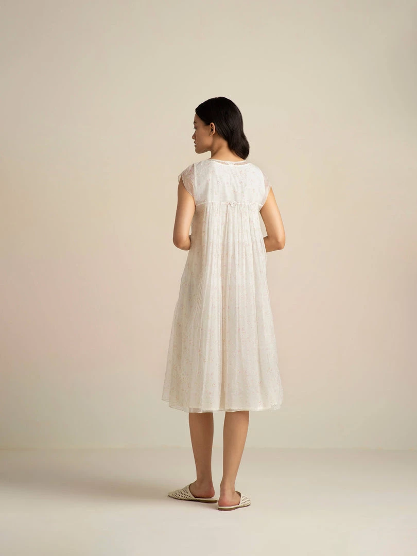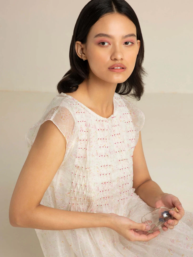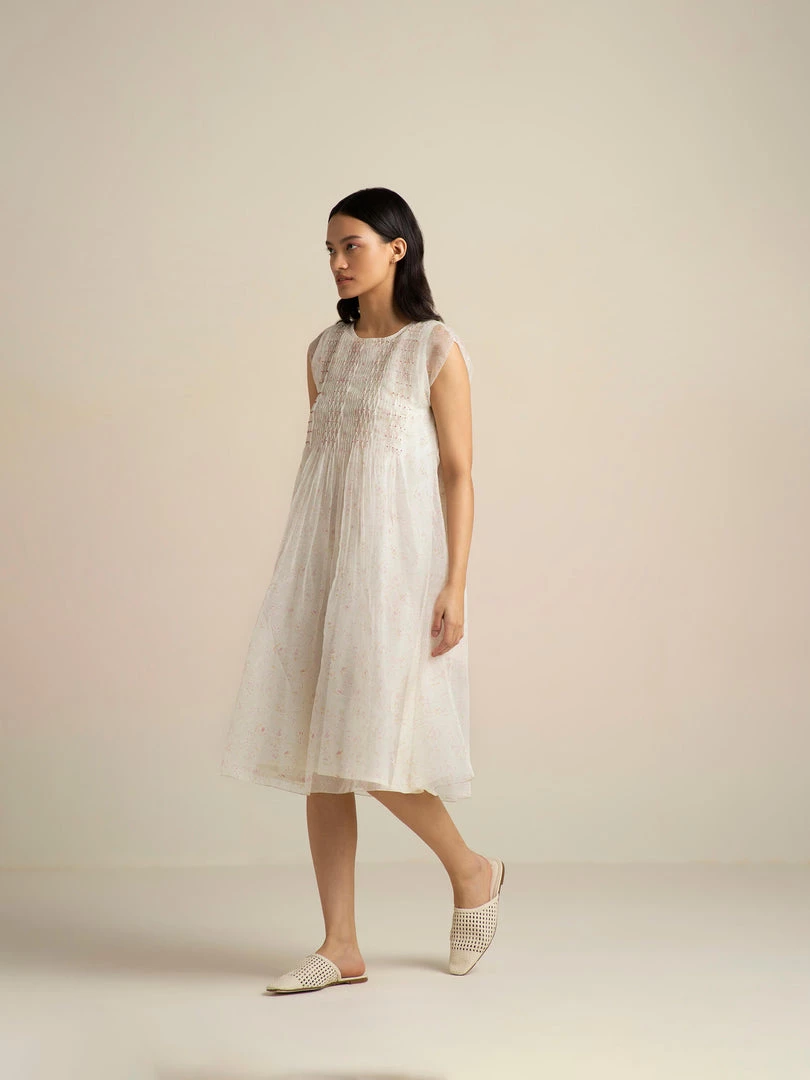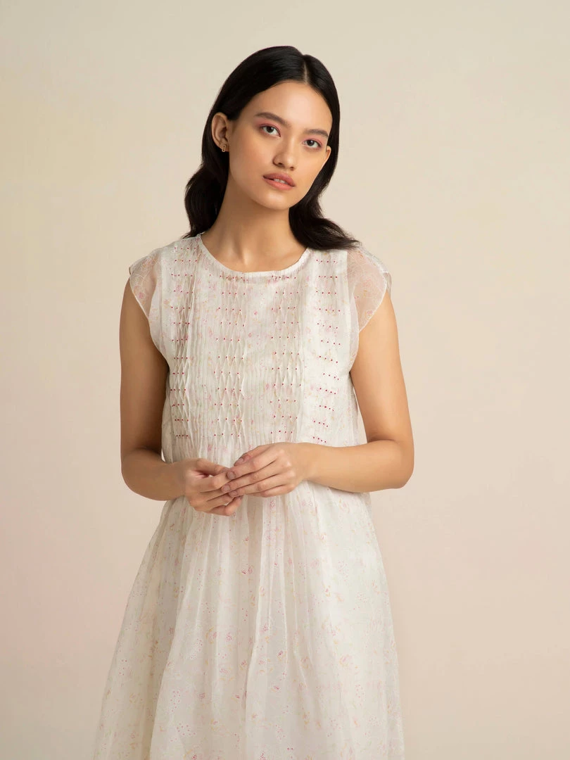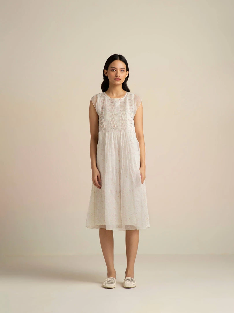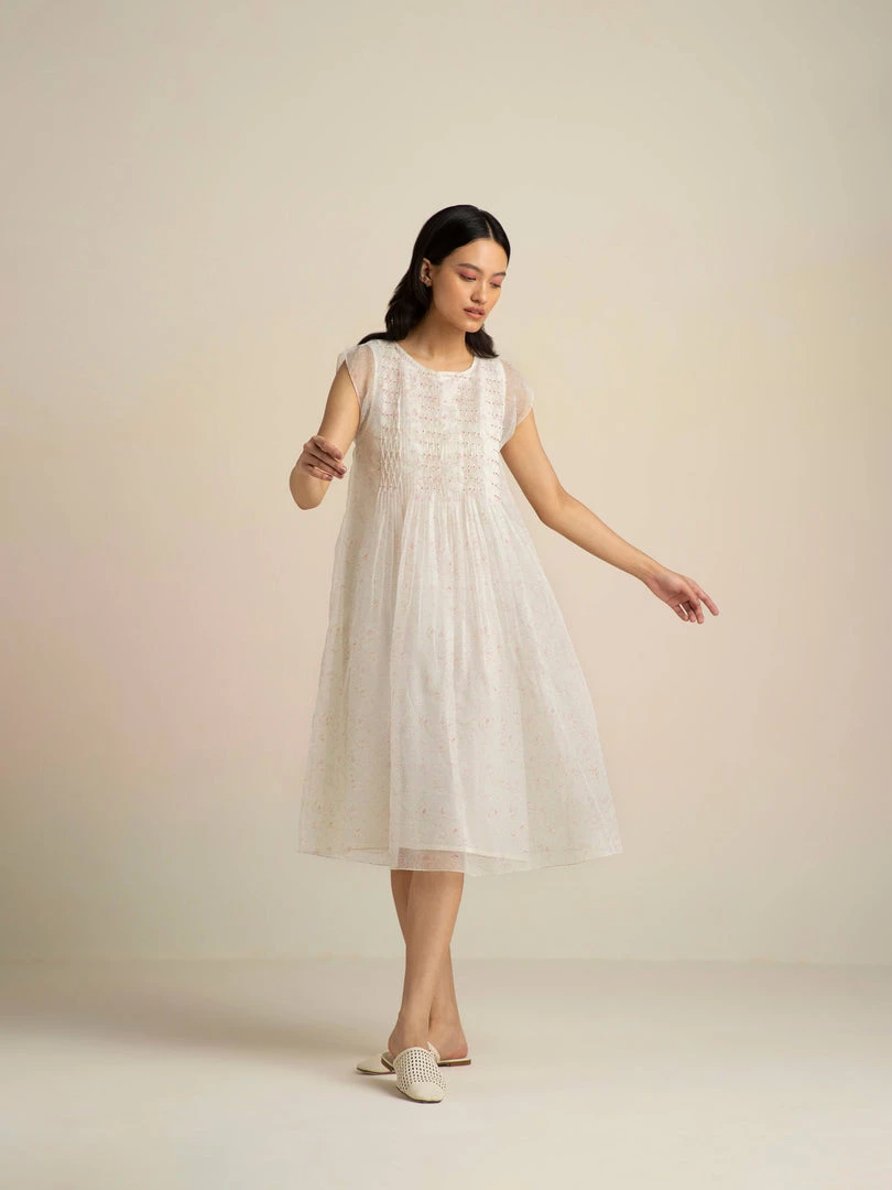 Dainty and clean, our Faded Rose Organza Midi Dress in handwoven organza comes with pin-tucks and smocking details, dropped sleeves and an A-line silhouette. The glowing ivory with delicate nature prints lends it timeless charm.