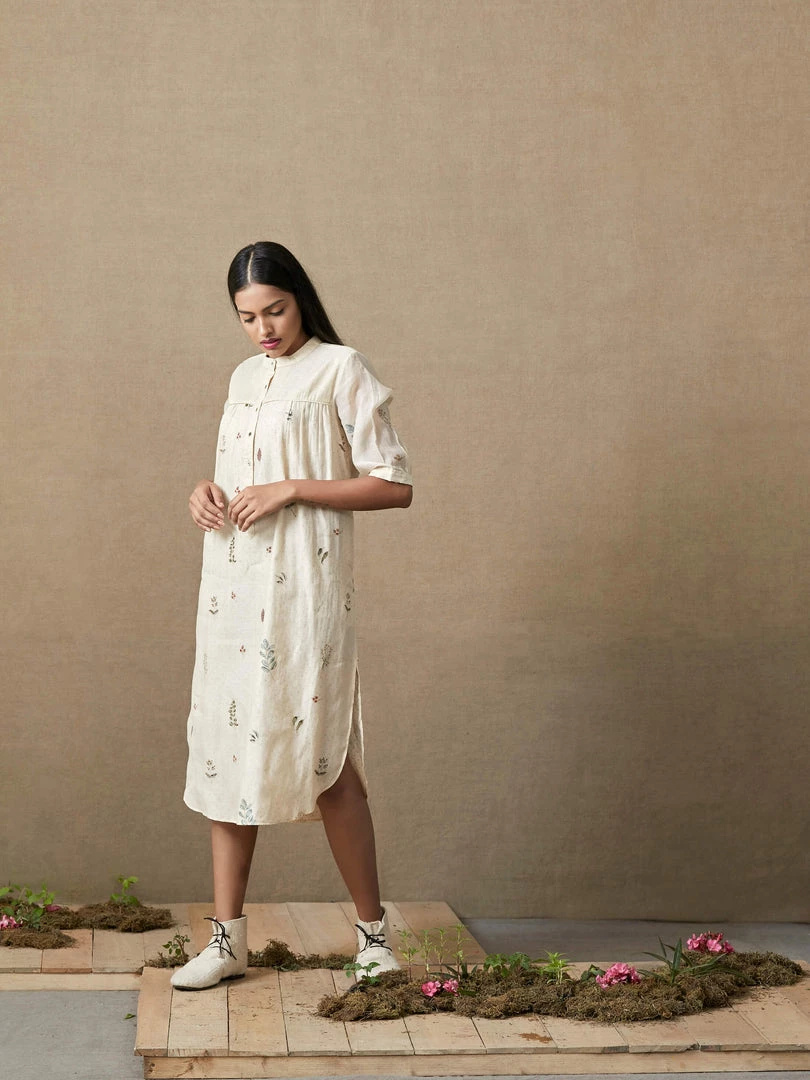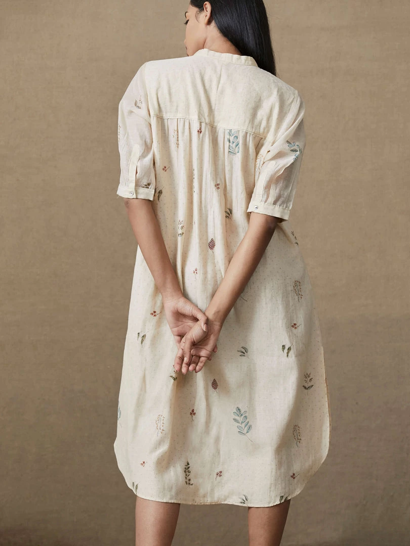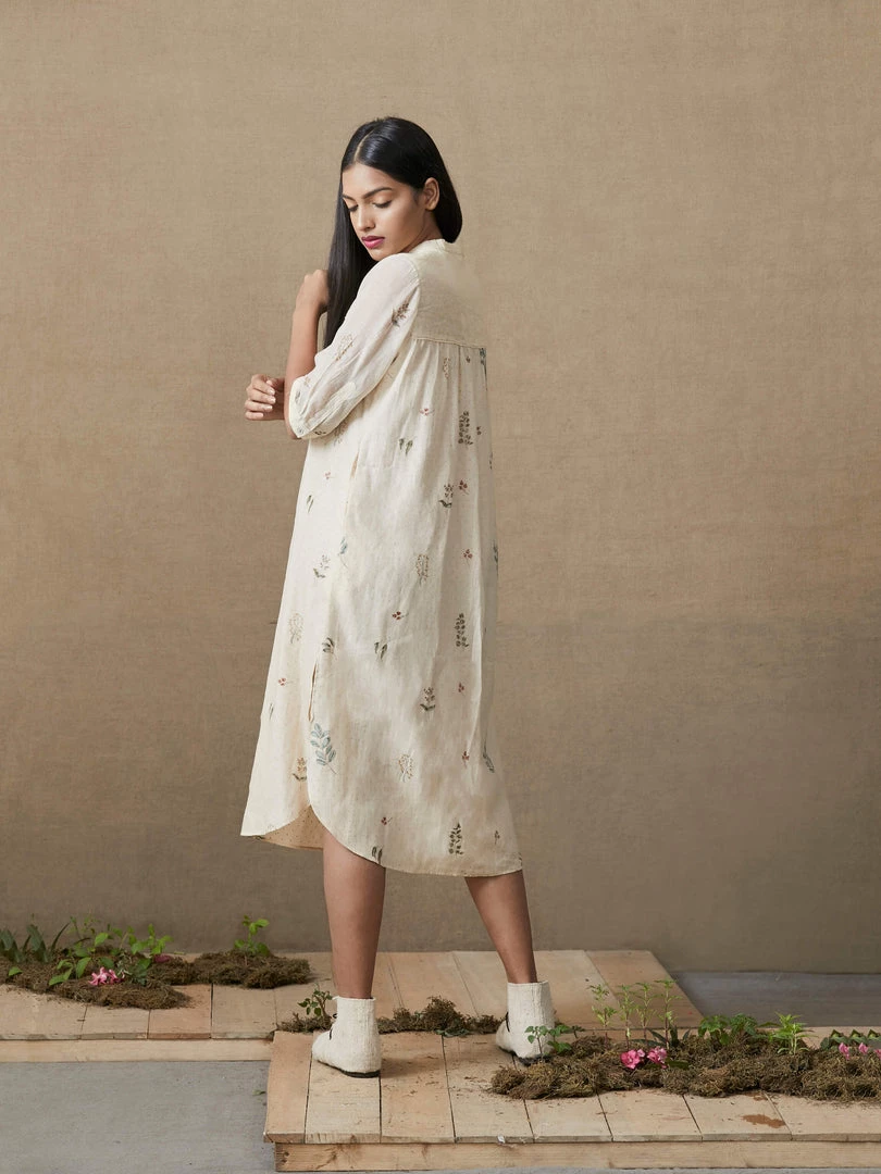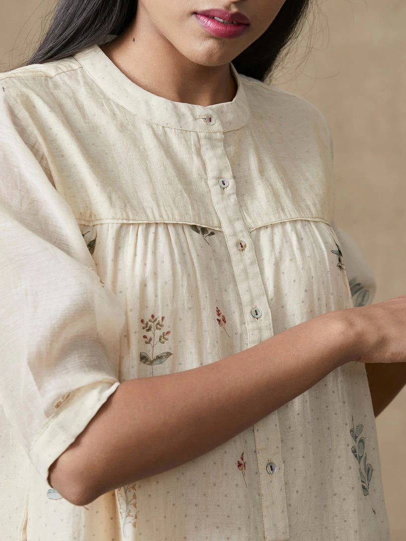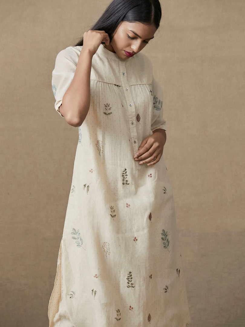 This mandarin collar kurta has a round hem and slits on side. It is made in luxurious chanderi, delicately hand block printed with flora motifs. Pair it with our linen pants (E21) or float dot pants (E09).