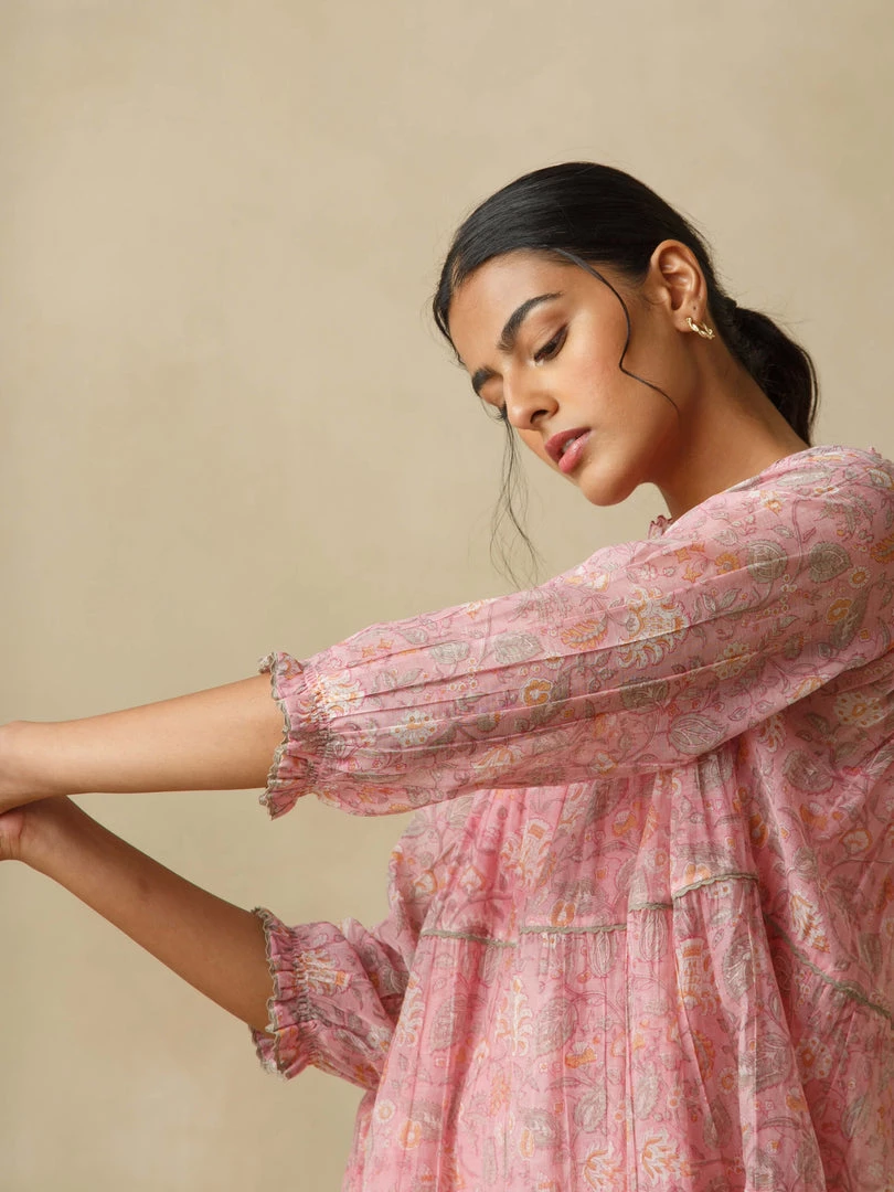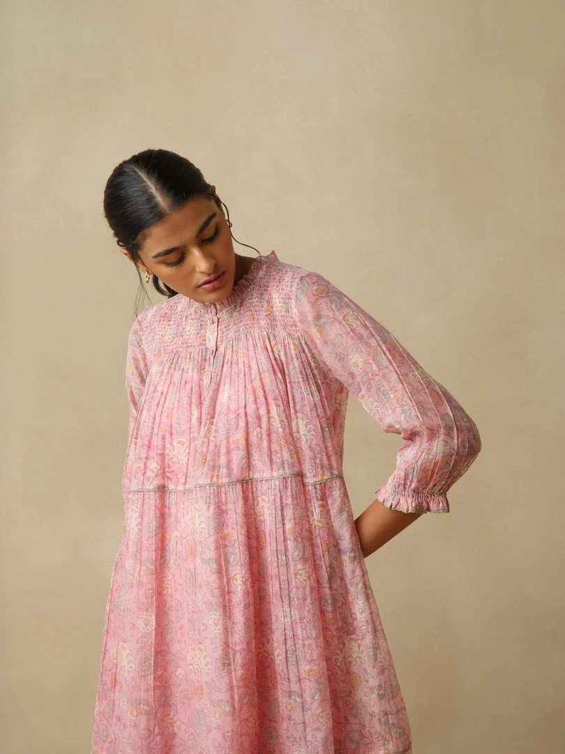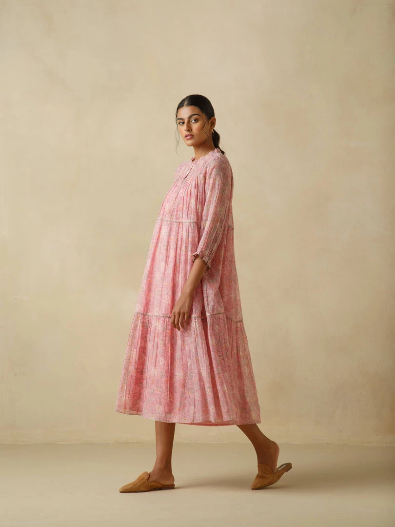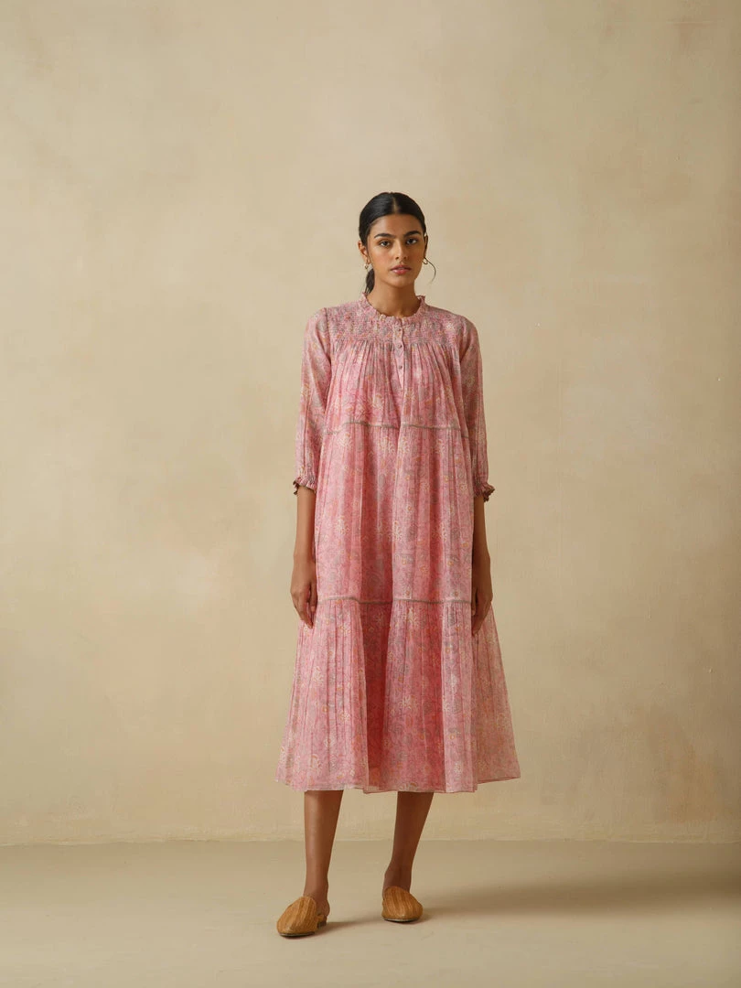 Light as air and redolent of the best days of our lives, our Loganberry dress is delicately hand block printed and comes with exquisite details such as dainty smocking details on front and back yoke, multiple tiers with light gathers and hand embroidered buttons.