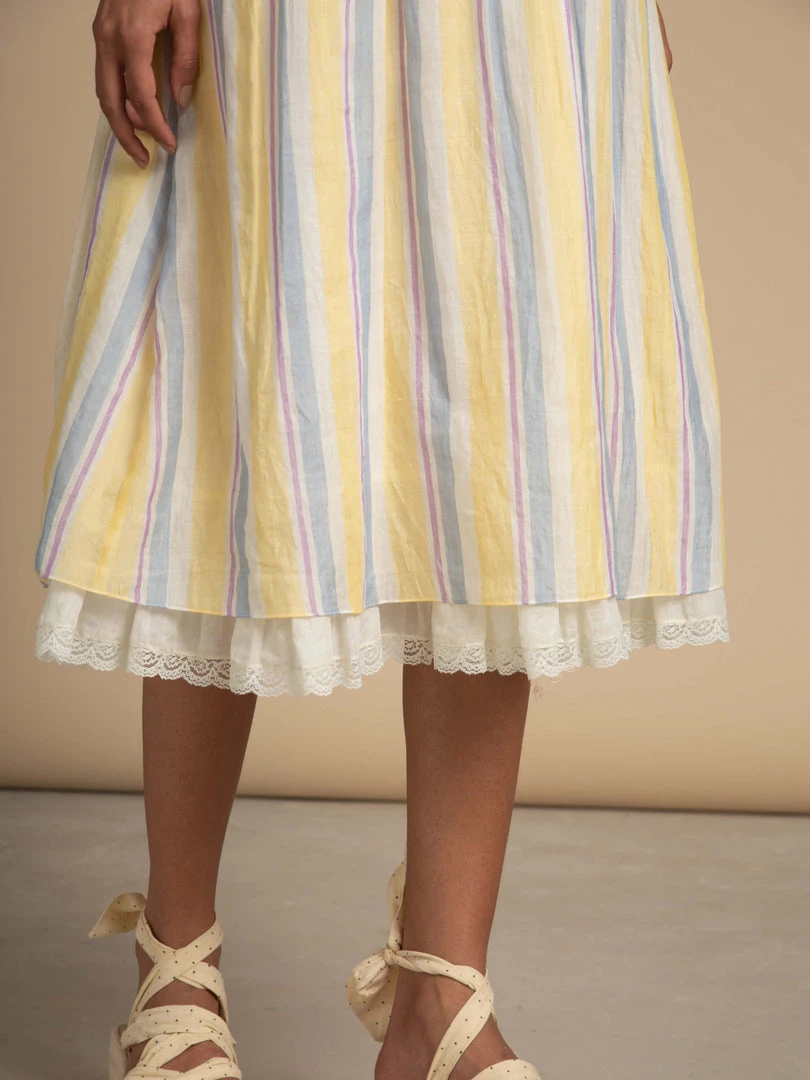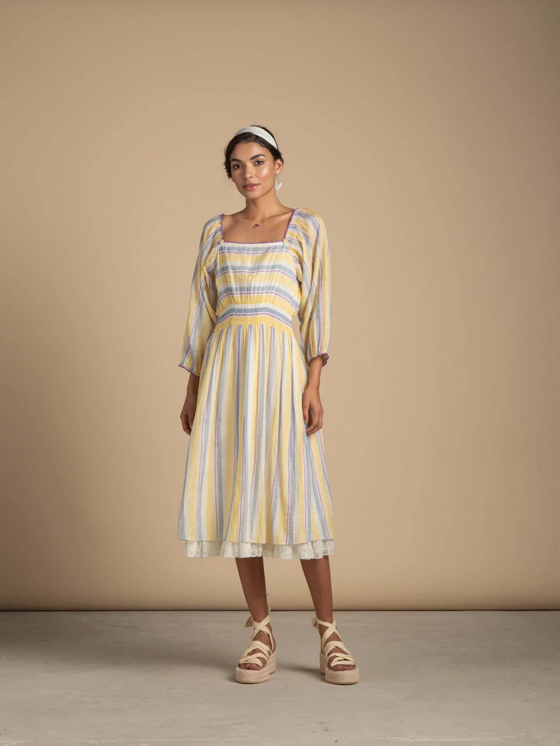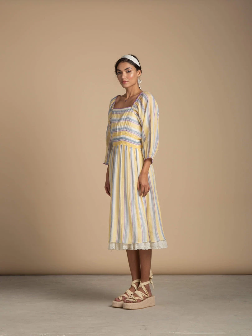 Evoke a positive mood in our signature sunshine rainbow stripes made in lightweight and breezy handwoven cotton silk fabric. The smocked waist and a square neckline is complemented with balloon sleeves. The dress can be worn on and off-shoulder and is fully lined with a ruffled tier underskirt.