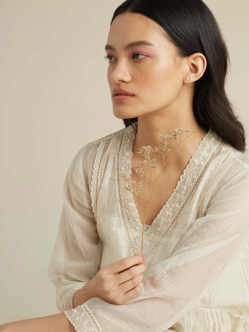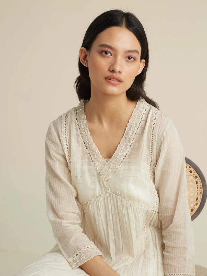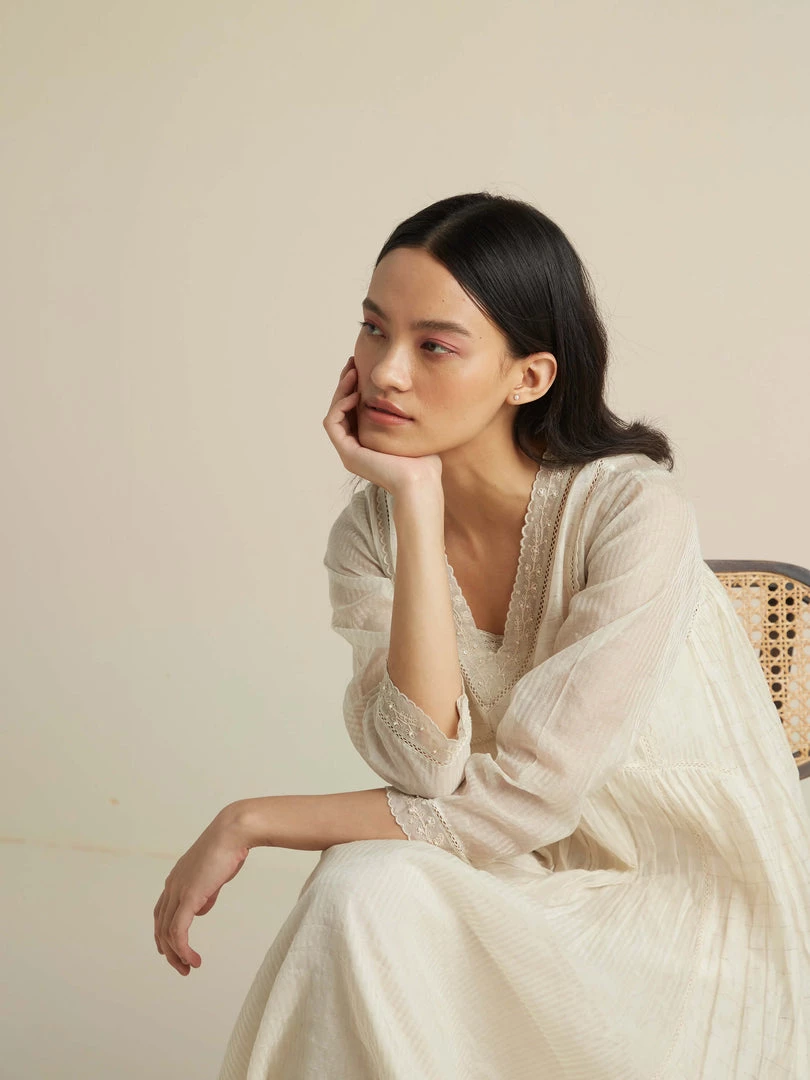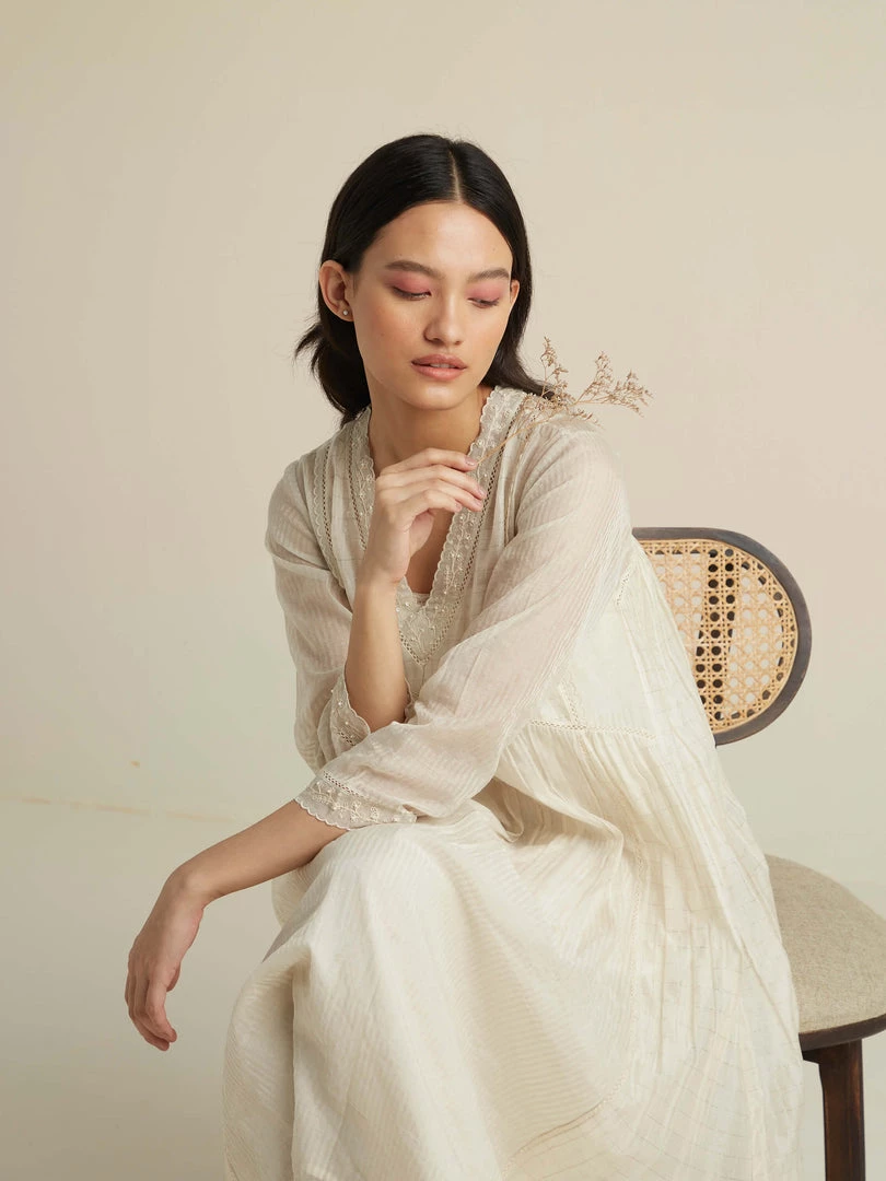 The Midori dress is the perfect mix of comfort, beauty and relaxed sophistication. The medley of tissue cotton fabrics, hand embroidery and lace inserts adorn this dress for an elevated look.