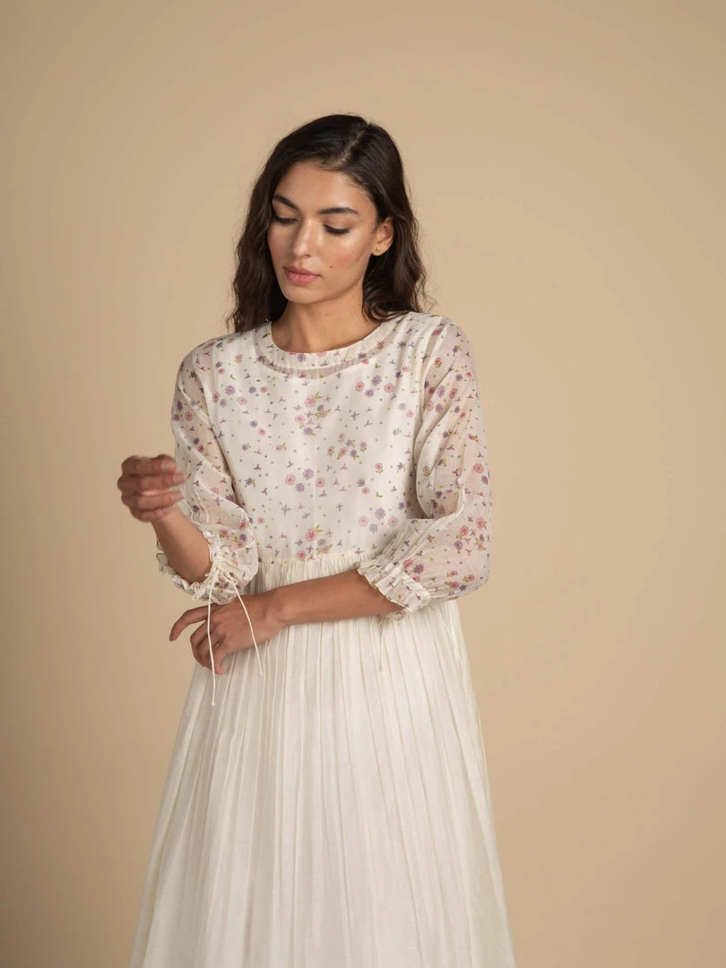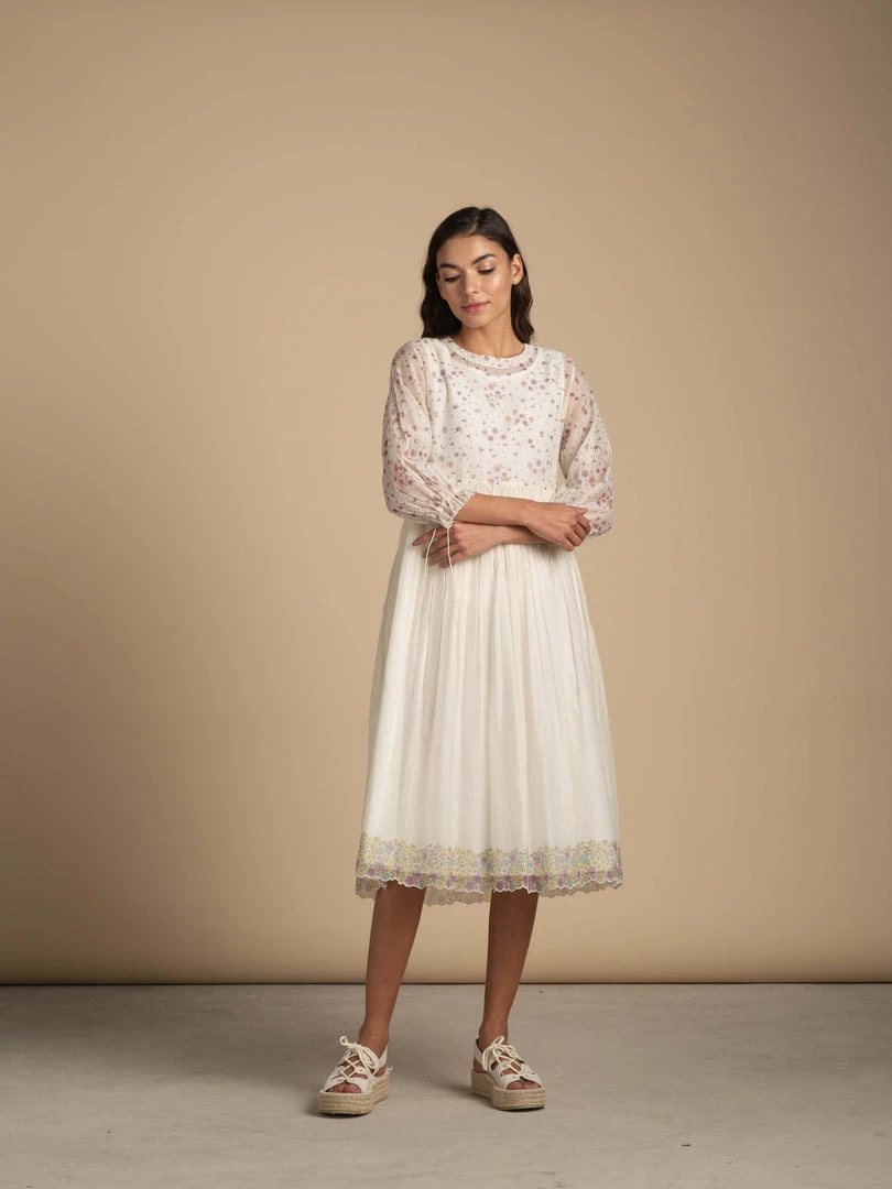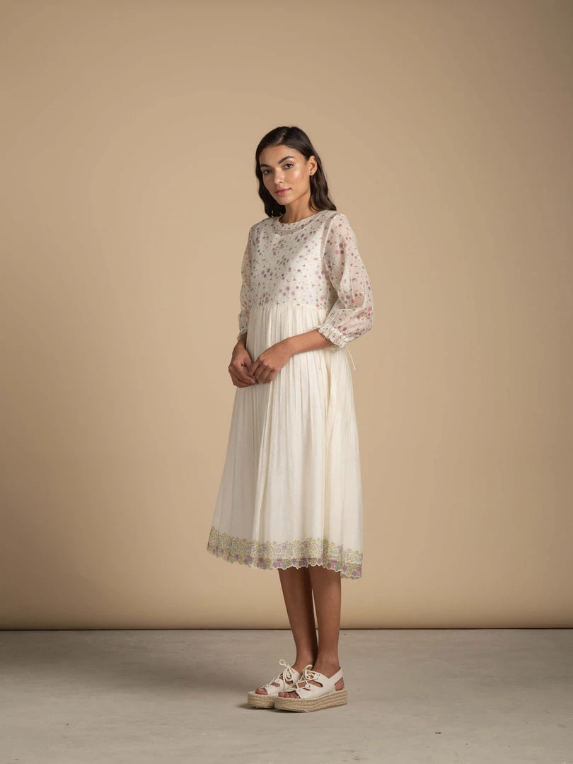 Bring in the spring in our balmy dress strewn with tiny flora prints. Made in breathable and light-weight Chanderi cotton fabric, its finer details include a floral border at hemline finished with delicate scalloped cutwork, a handblock printed upper bodice and sleeves and subtle gathers under the yoke. Your slip-into-anytime and stay-in-it-for-good friend for the coming season.
