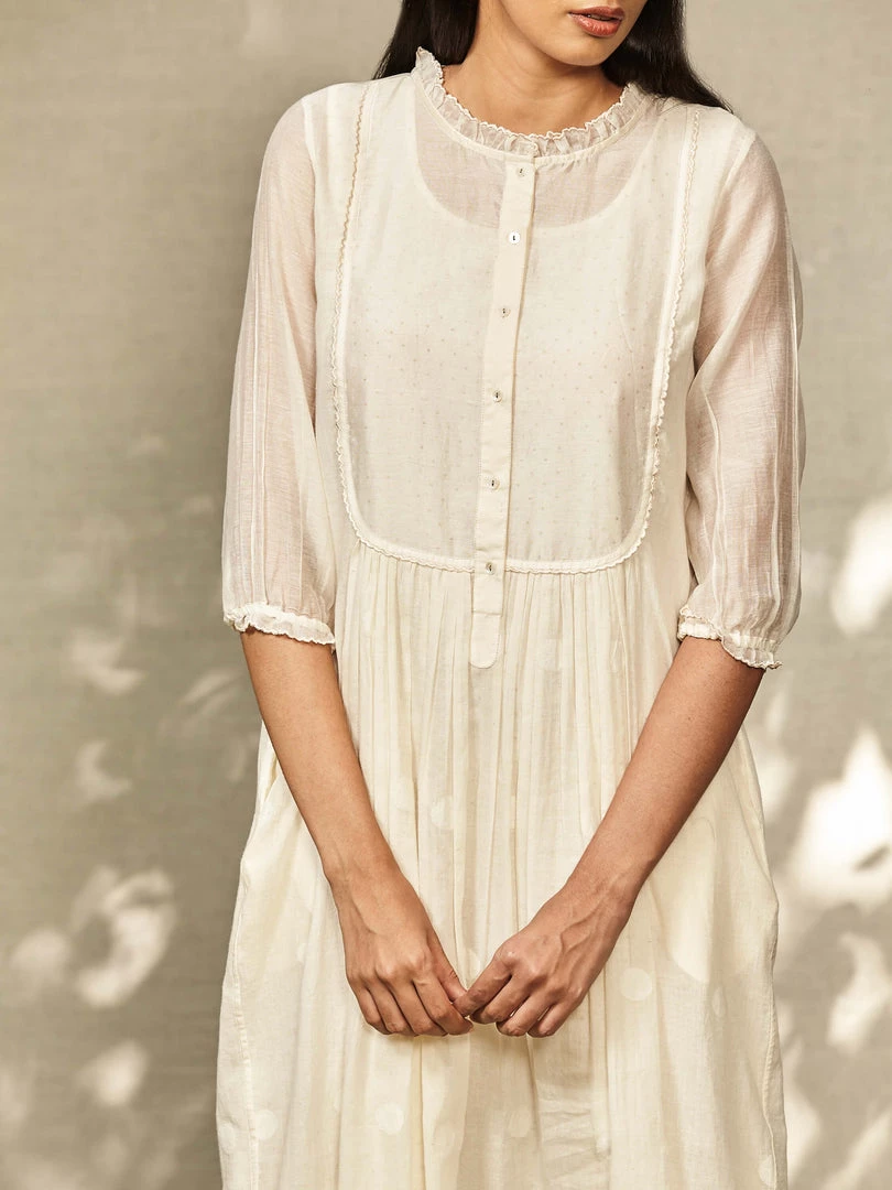 Minimal, graceful and ultra feminine, our Moonbeams Ruffle Dress is our tribute to Alice in Wonderland! Bold dewdrop motifs float luminously over an ivory white muslin base. A fitted yoke with delicate scallop details and a relaxed fit with soft gathers makes this dress versatile for formal or casual outings. Made in the finest handwoven Jamdani cotton of India, this dress is for keepsakes.Â
