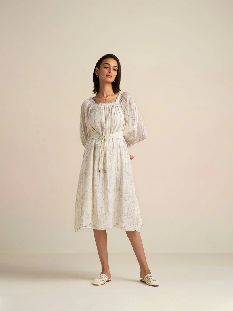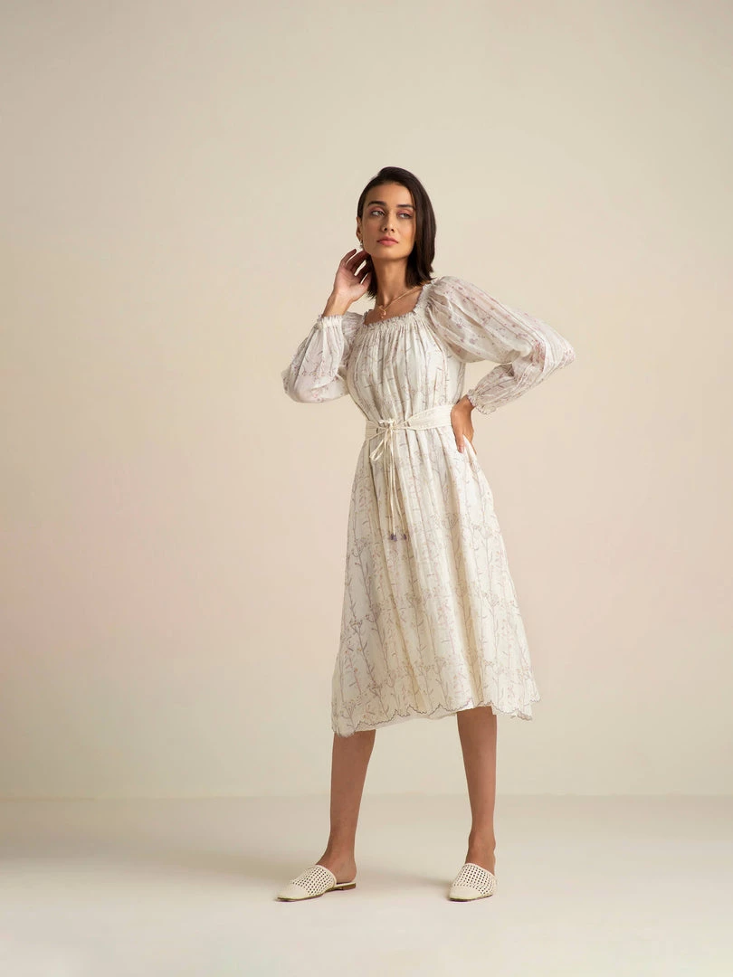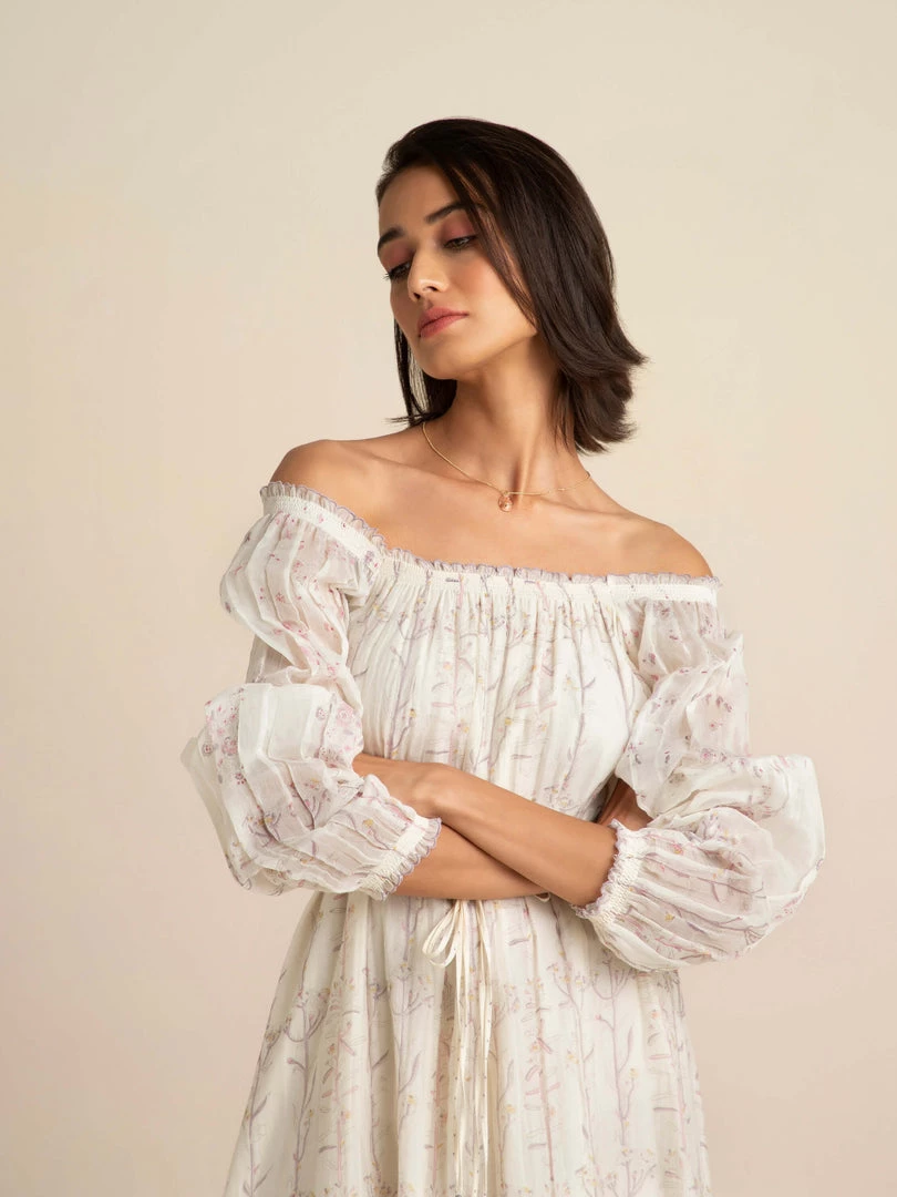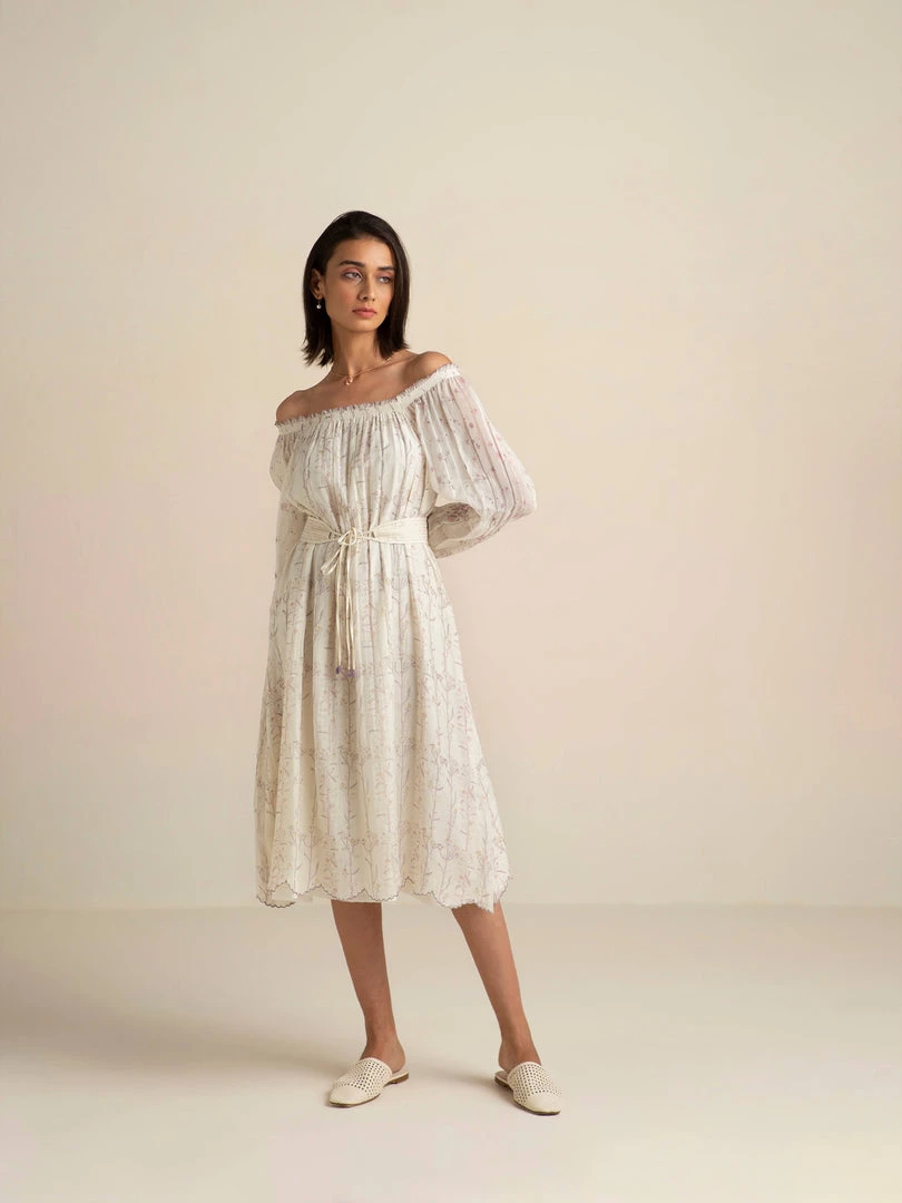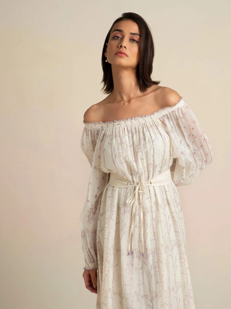 Our vintage inspired off shoulder Kaftan dress with elasticated neckline and full sleeves can be clinched at the waist for a slim look. The petal hemline and all over hand block prints, inspired from craft and collectibles, evoke nostalgia.Â