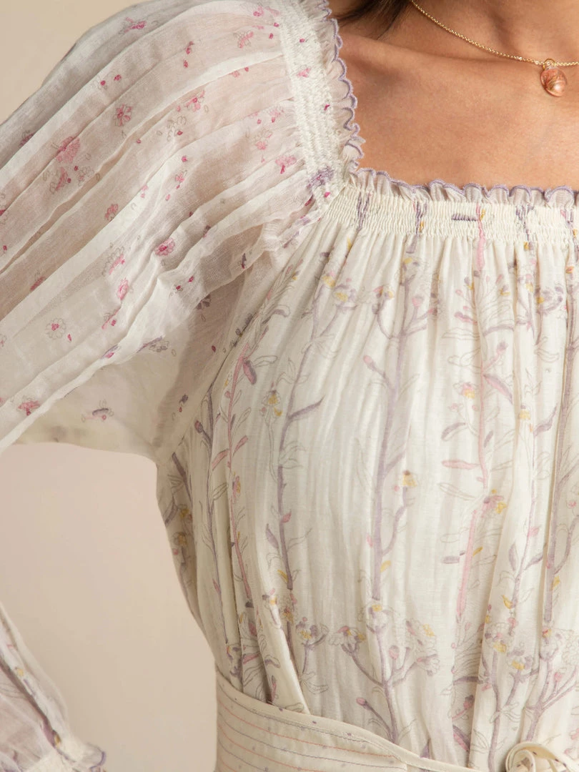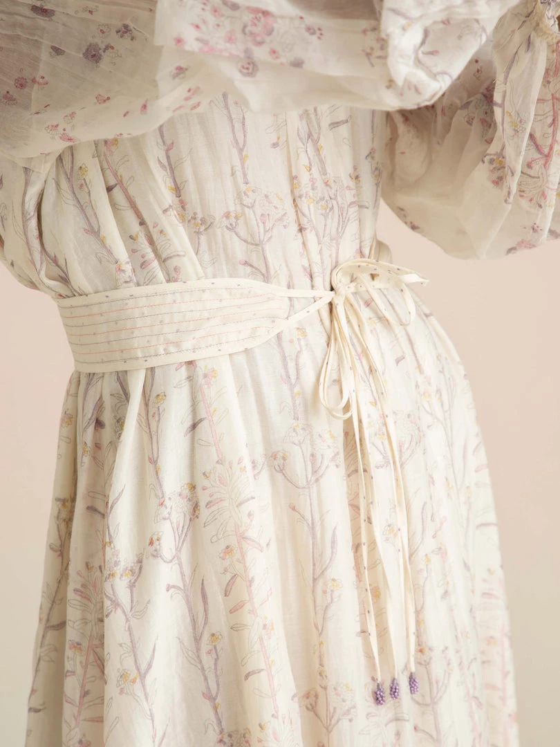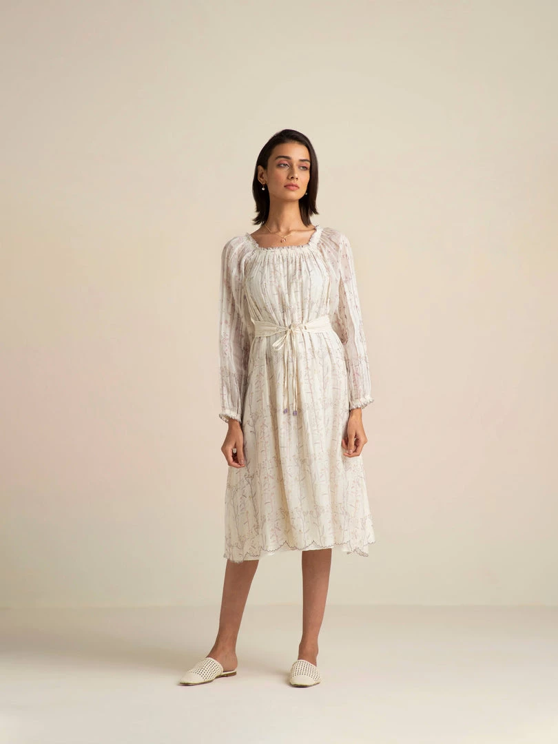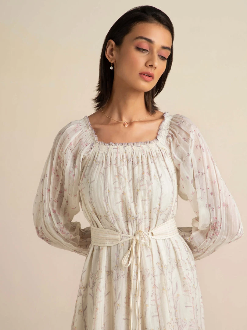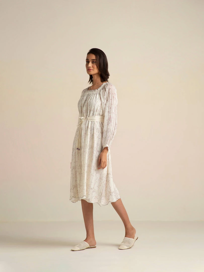 Our vintage inspired off shoulder Kaftan dress with elasticated neckline and full sleeves can be clinched at the waist for a slim look. The petal hemline and all over hand block prints, inspired from craft and collectibles, evoke nostalgia.Â