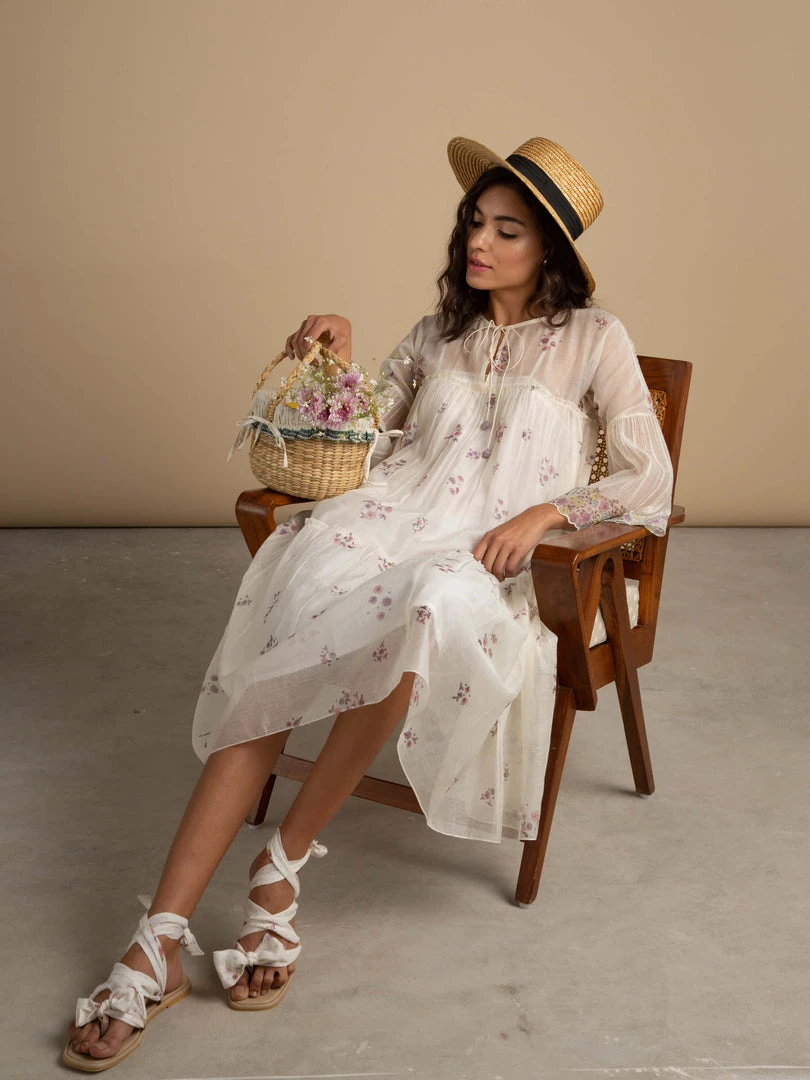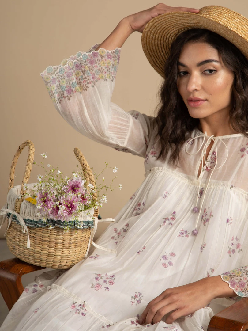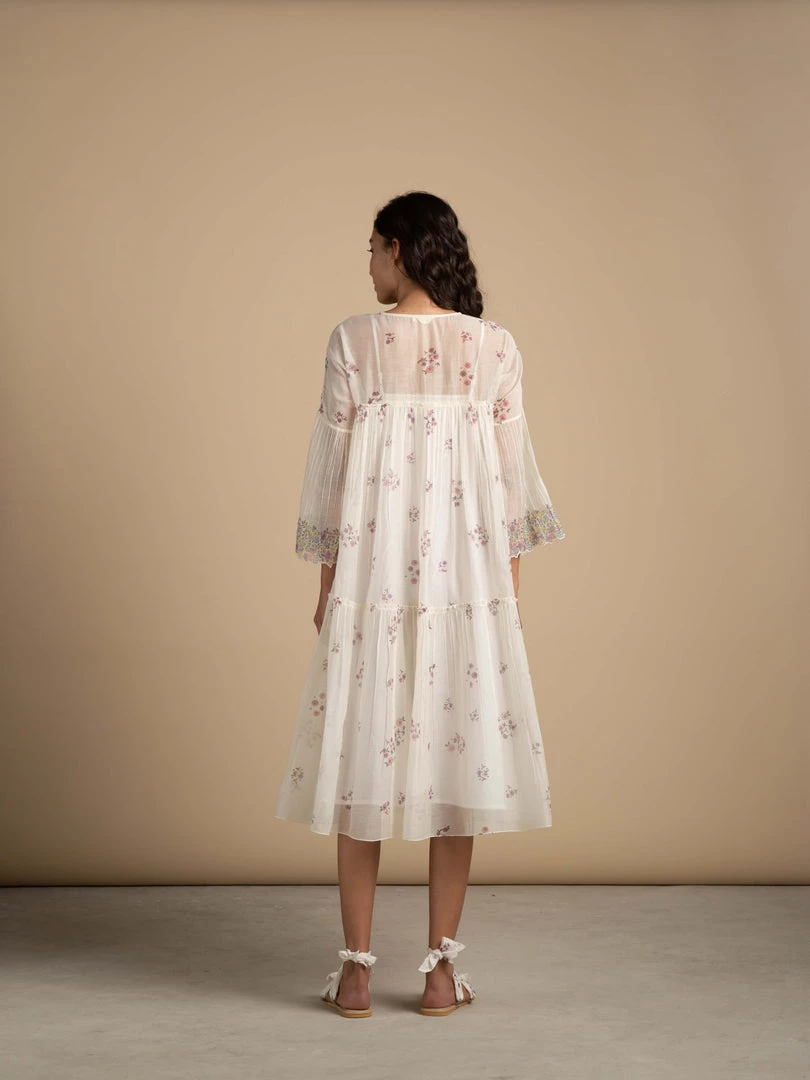 Celebrate spring in our voluminous tiered silhouette with accents of purple, cerulean blue and lemon yellow. It comes with fluted sleeves with a floral border finished with delicate scalloped cutwork, generous all-over hand block prints and crochet tie-ups at neckline.