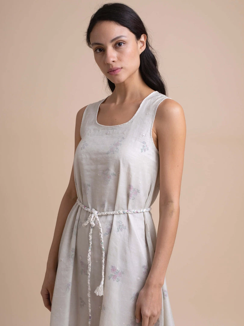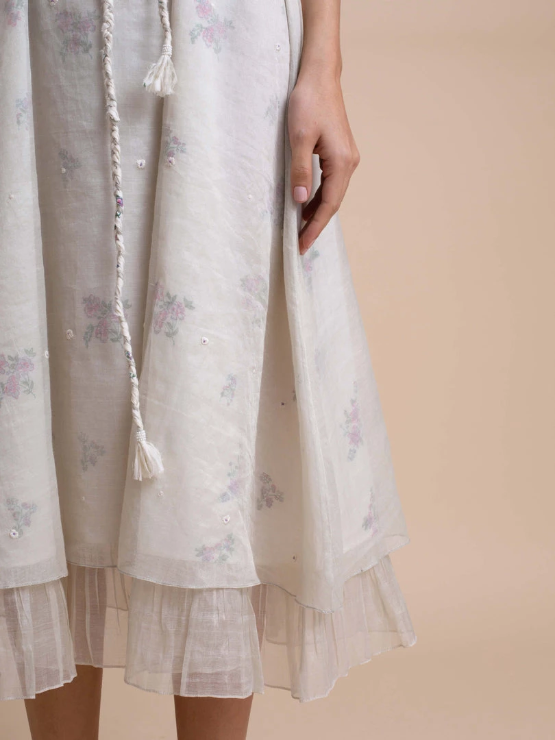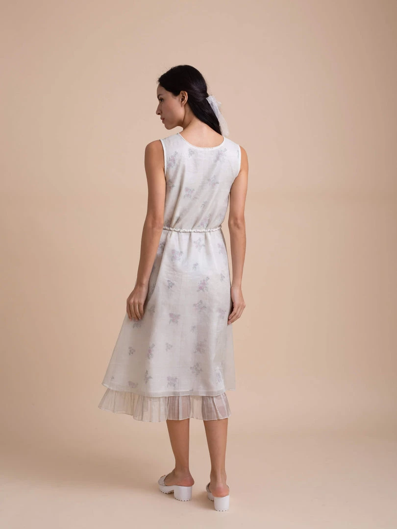 AÂ summer must-have, this layered dress is comfortable with an easy fit. The inner layer is hand block printed in ditzy floral motifs and the overlayer is made in sheer cotton-silk.