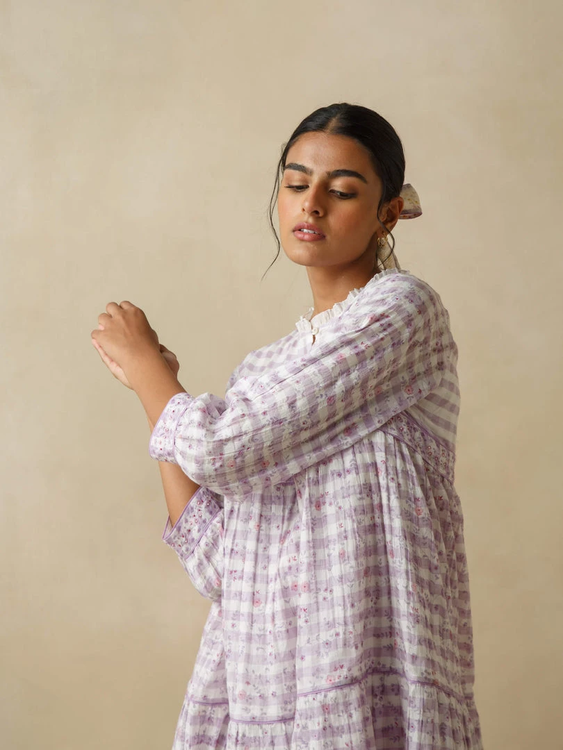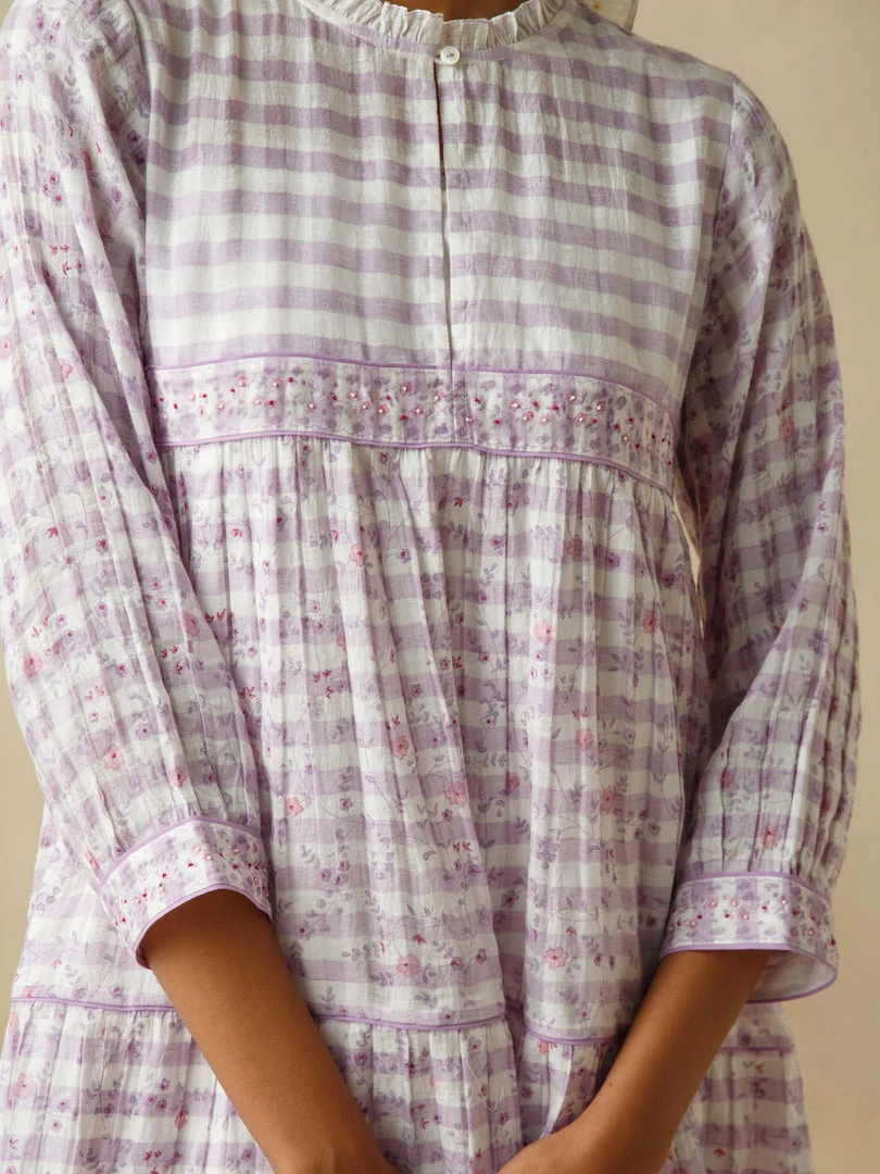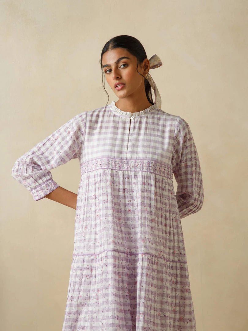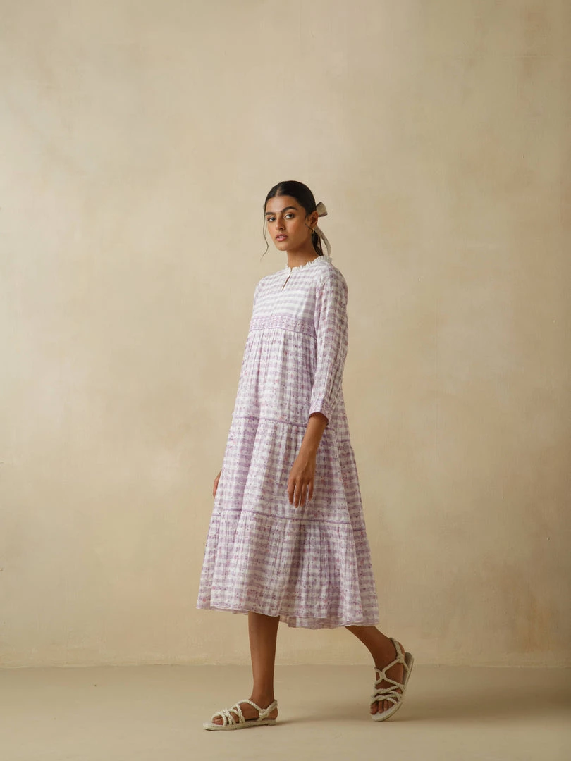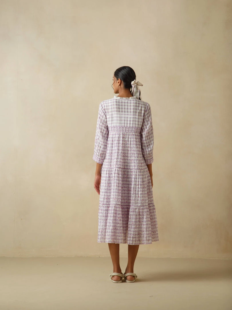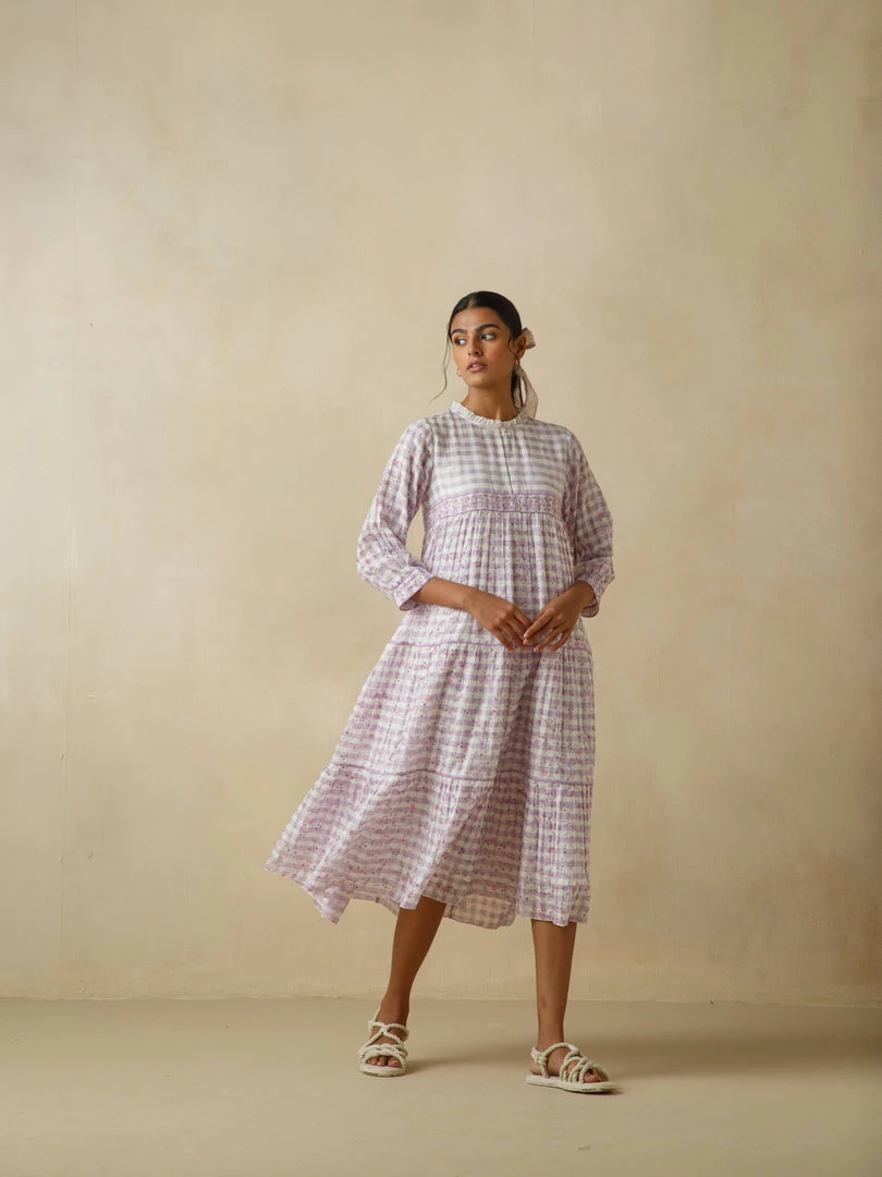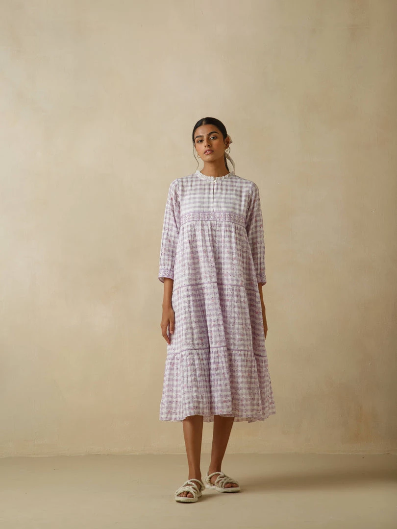 Bask in the feeling of the ground holding you up and the hills lifting you when you climb them in our Sallyrosa Cotton Check Dress made in handwoven mulmul cotton with yarn dyed checks. It comes with delicate hand embroidery and bead work on the yoke and sleeve openings.Â