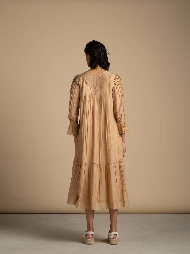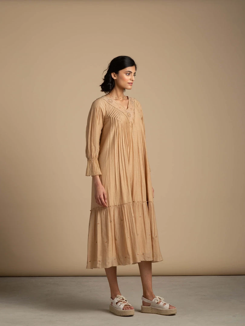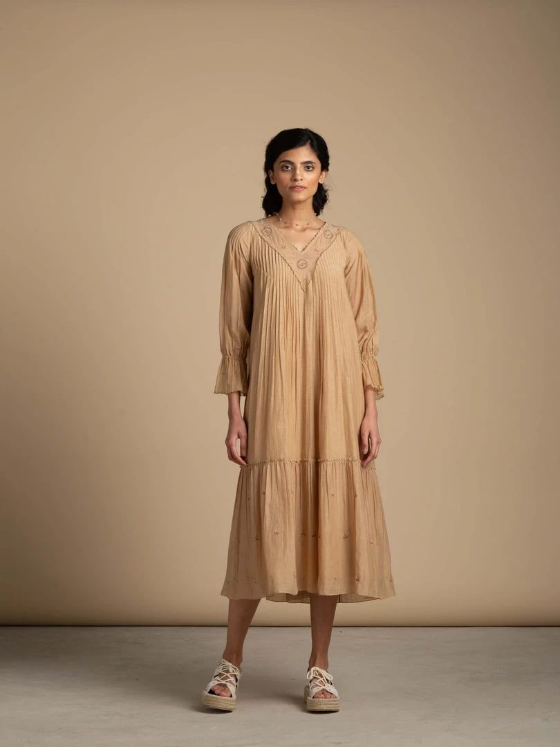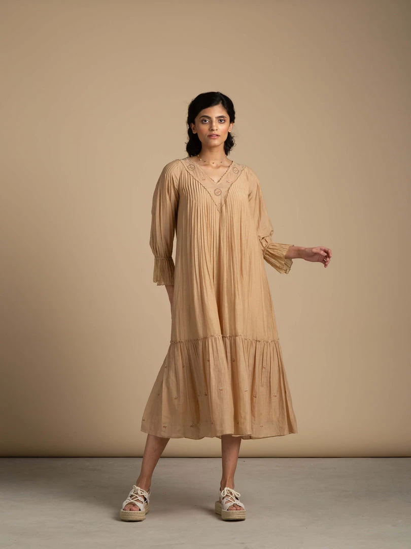 This vintage inspired, sepia toned, free flowing dress reminisces of idyllic stories from eras bygone. It comes with abundant tiers and a v-neck with delicate floral embroidery.