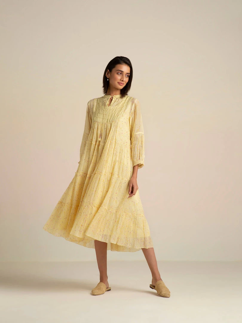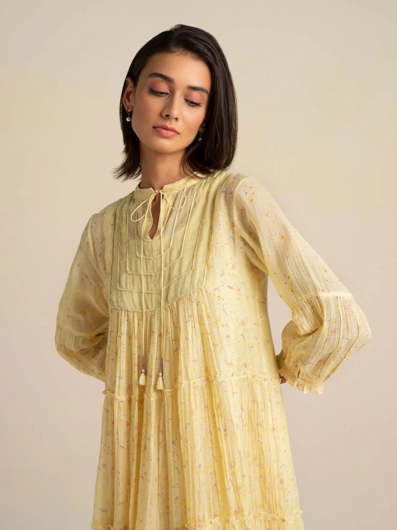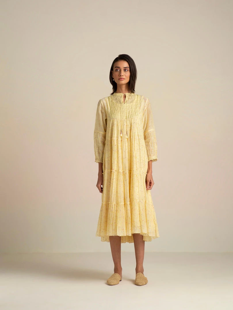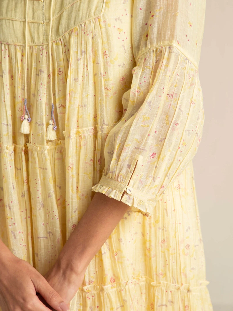 The artistic dreamscape of Buna’s design vocabulary comes alive in a vanilla shade with painterly prints, abundant tiers, a tissue yoke with dori patchwork and tassel tie-ups. Luxurious layers and pleats with delicate patchwork on yoke make this billowy dress a summer staple.Â
