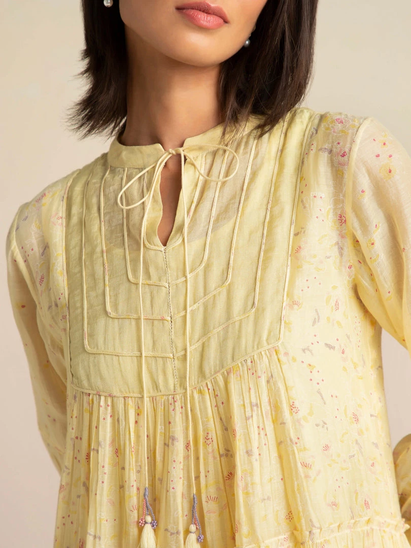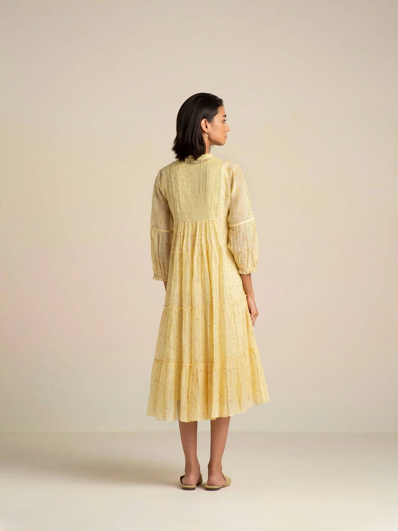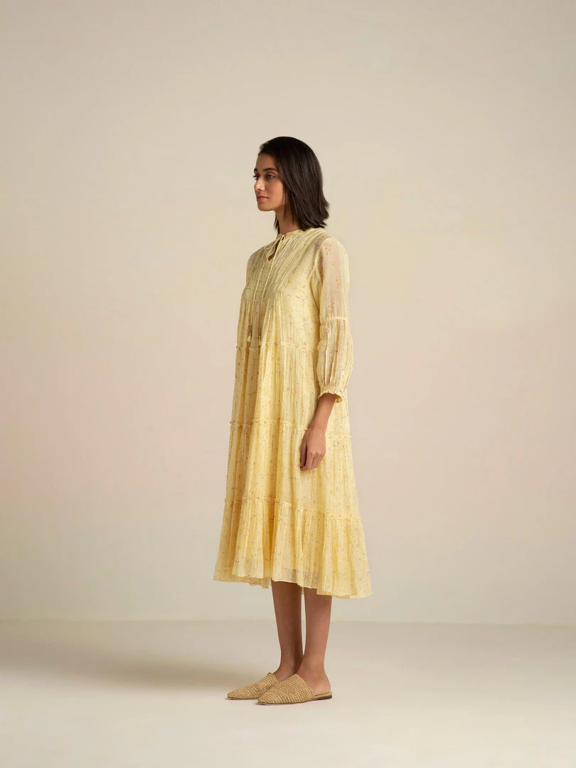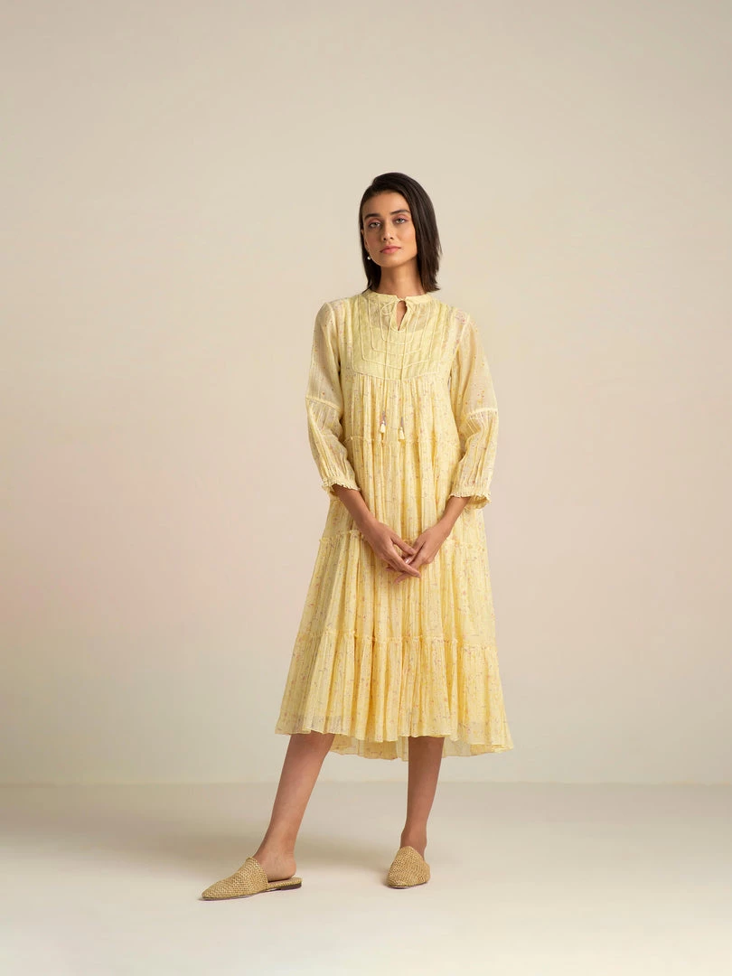 The artistic dreamscape of Buna’s design vocabulary comes alive in a vanilla shade with painterly prints, abundant tiers, a tissue yoke with dori patchwork and tassel tie-ups. Luxurious layers and pleats with delicate patchwork on yoke make this billowy dress a summer staple.Â