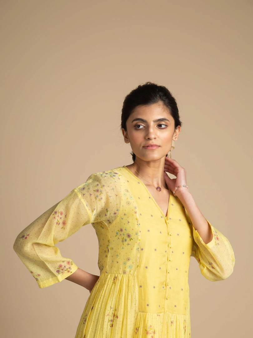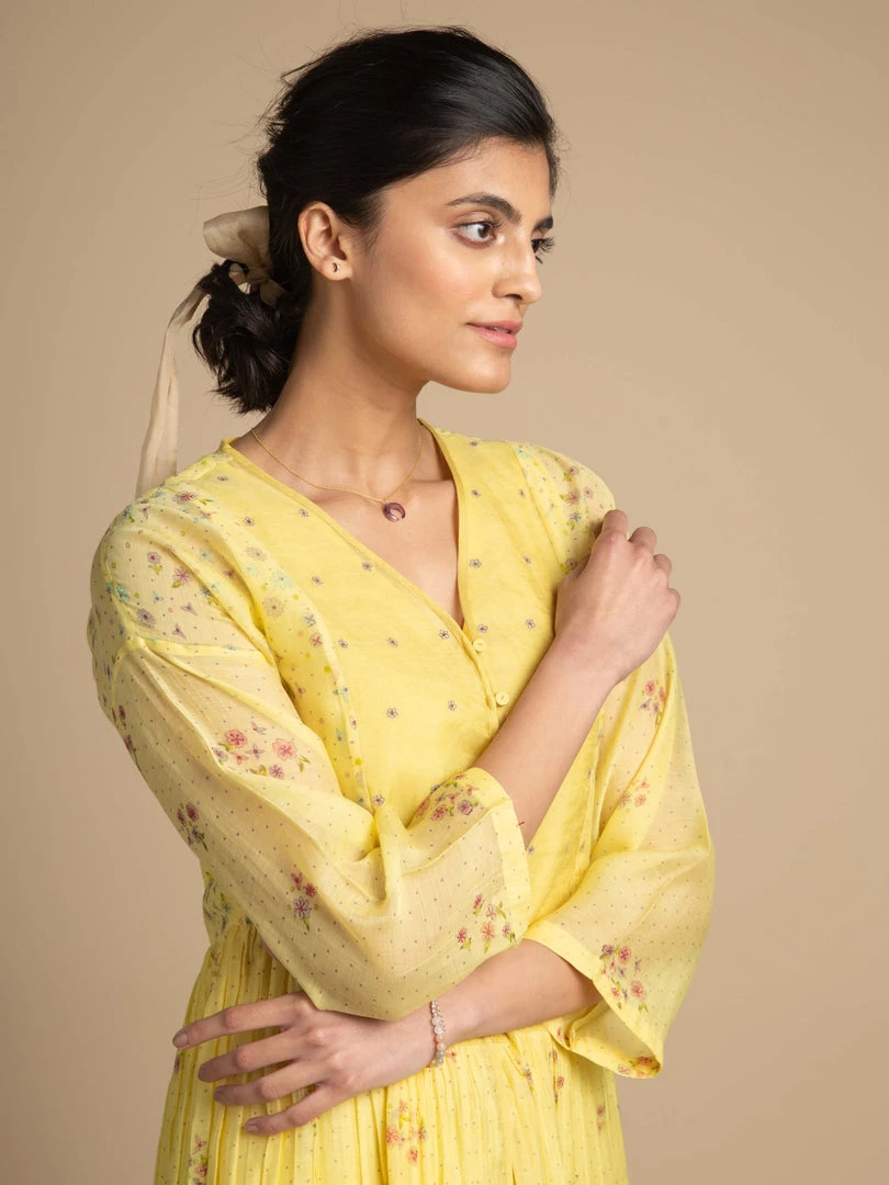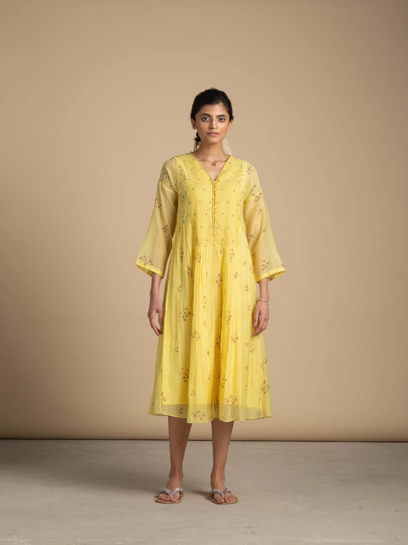 Handcrafted in gossamer Chanderi in a bright shade of yellow, this dress is strewn with our signature garden prints. Subtle waist gathers, v-neck, and an embroidered bodice with dropped sleeves lend it timeless charm.