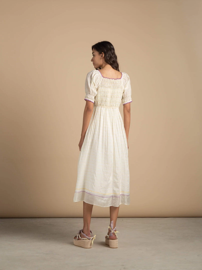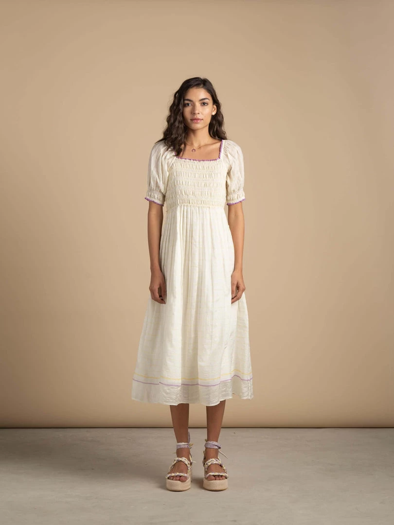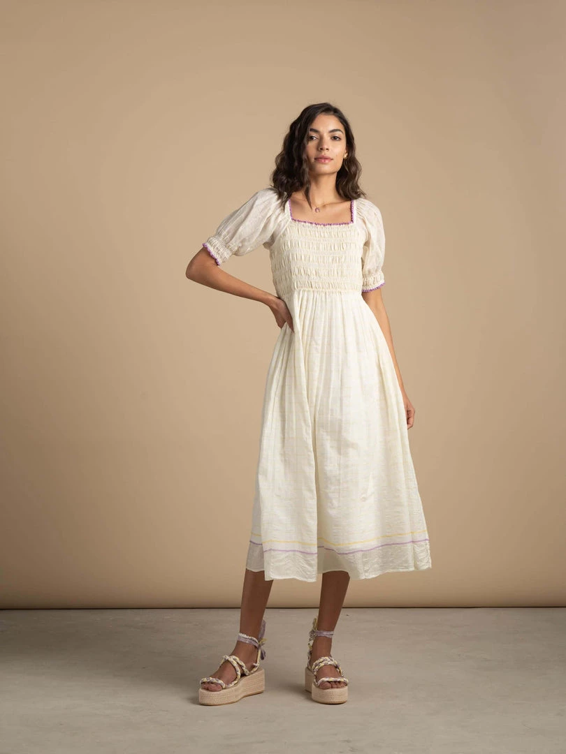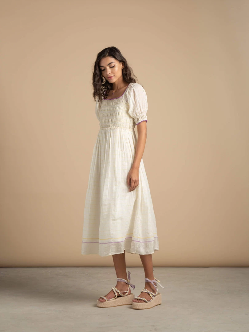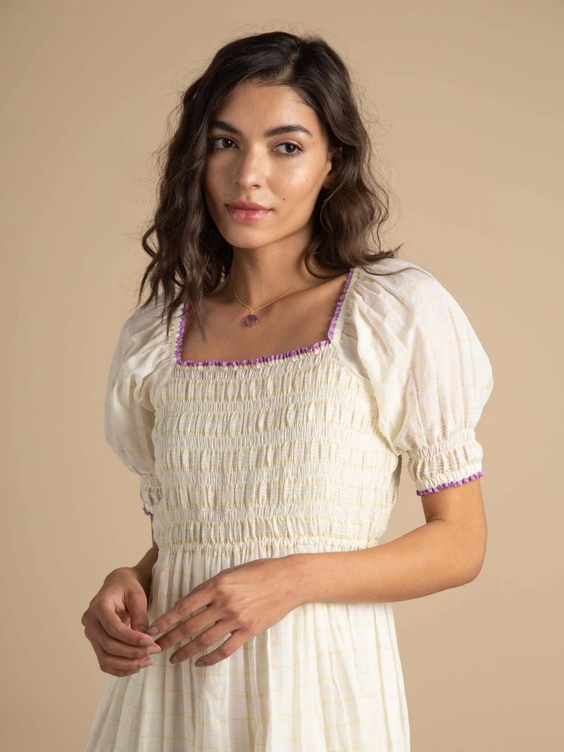 Our sublime Sunbeam Smock Dress features an elasticated bodice, square neckline, short puffed sleeves and a contrasting hemline. Make it your perfect partner for a small get-together or a picnic at your favourite spot!