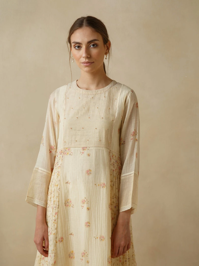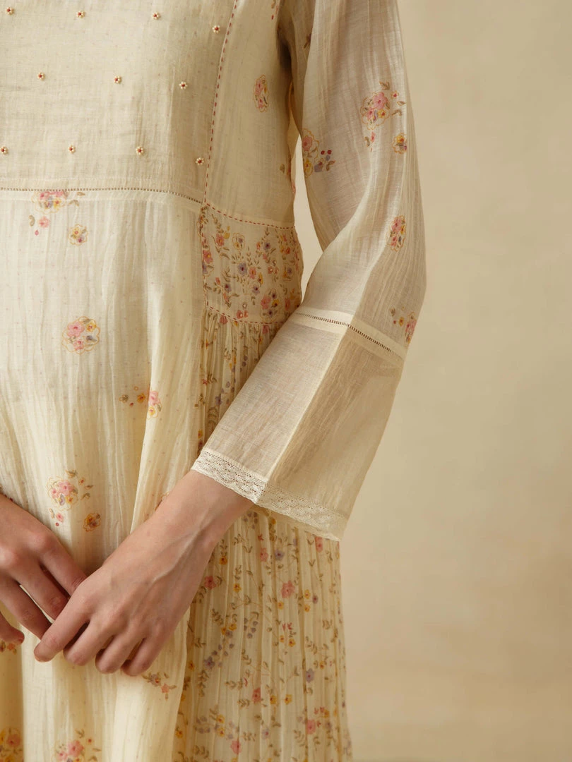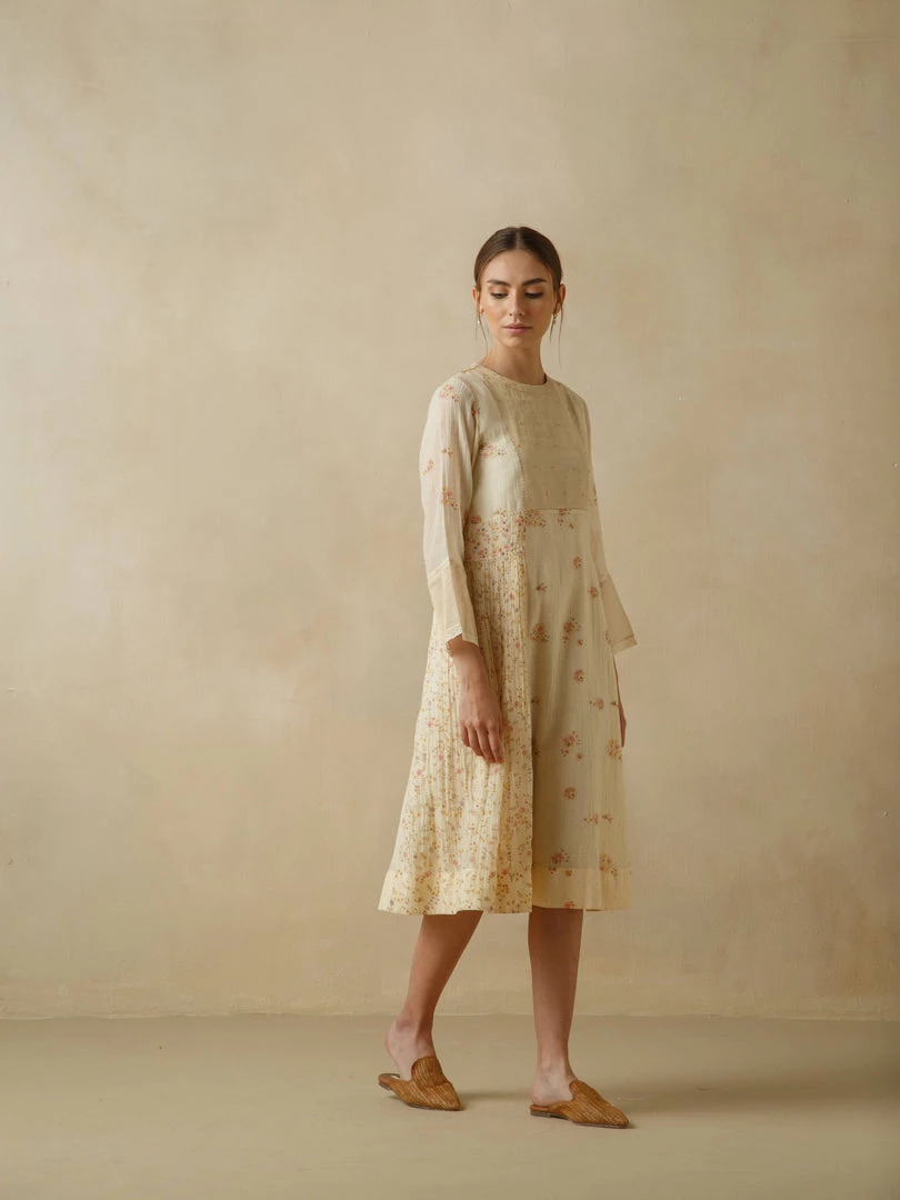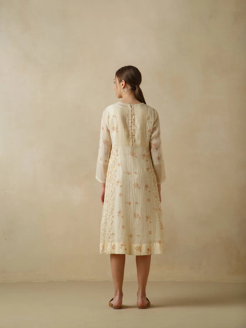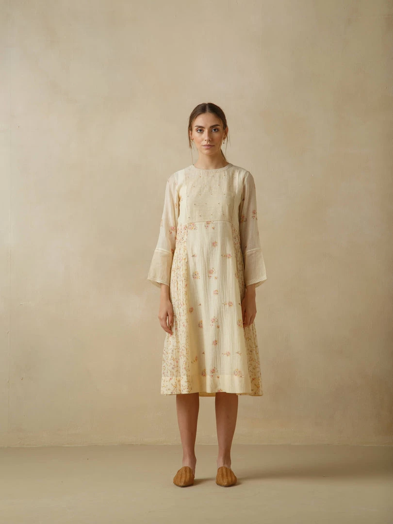 Hues of chrome yellow and fiery crimson serrating the heavens. Slanting sunrays illuminating corners and hidden crevices… Mirroring the hues of the setting sun, our Voice of Nature Dress comes with floral beaded embroidery on the front yoke, faggating stitch detailing on the waist and sleeves and delicate hand block placement printing.