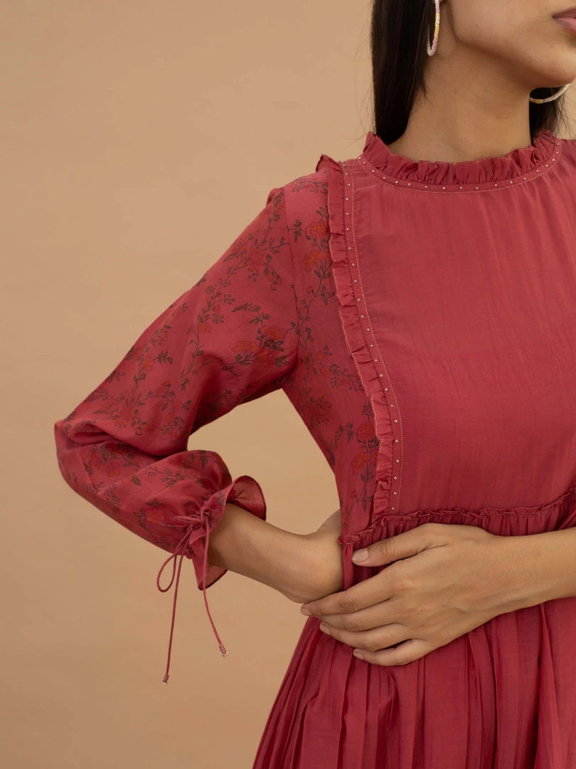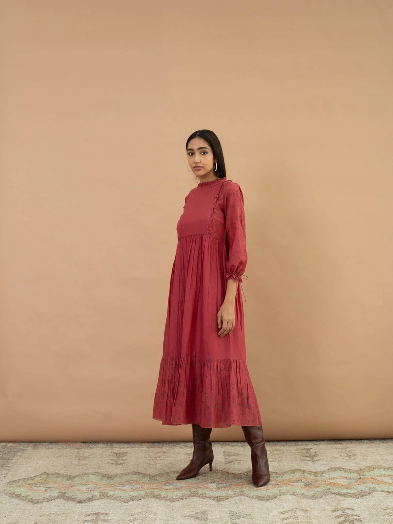 Feel light and breezy in this scarlet midi dress with floral block prints and ditzy details.Â
