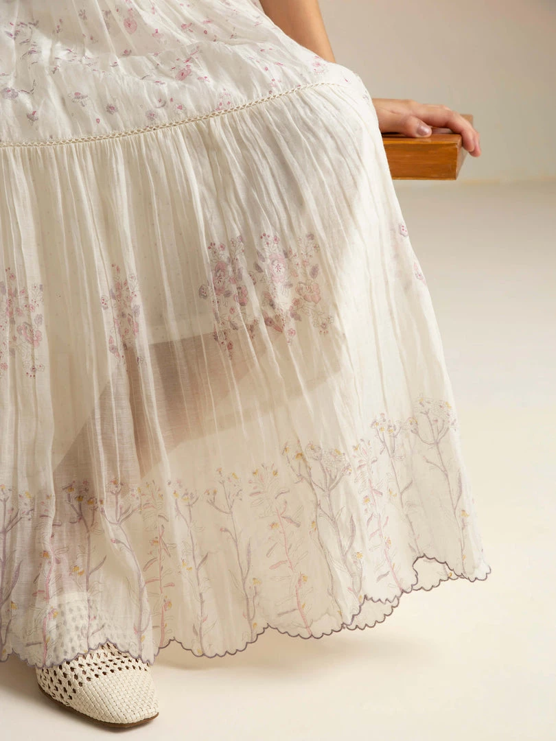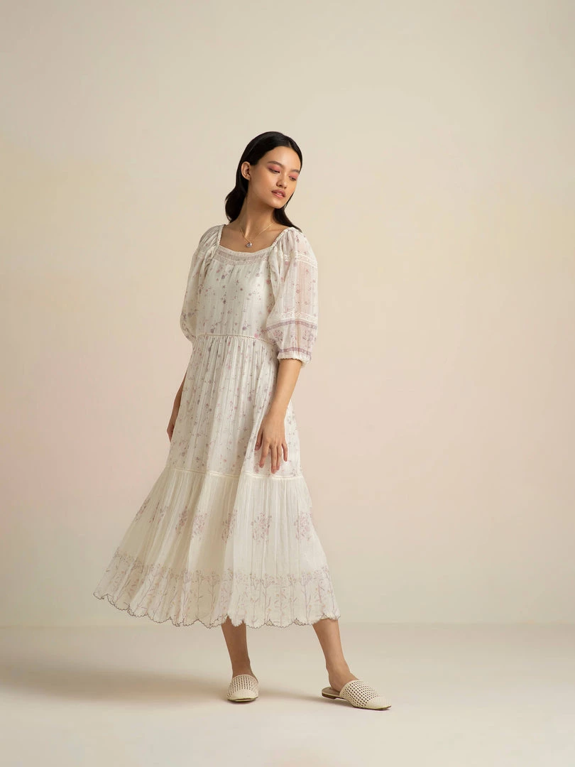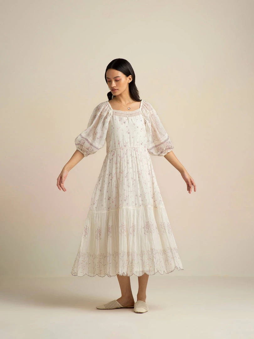 Sun soaked afternoons call for our empire line dress with billowy sleeves. Details  of our Woven Pearl Dress include a sweetheart neckline with lace inserts and elasticated shoulders, subtle gathers on the sleeve armhole and a scalloped hemline.Â