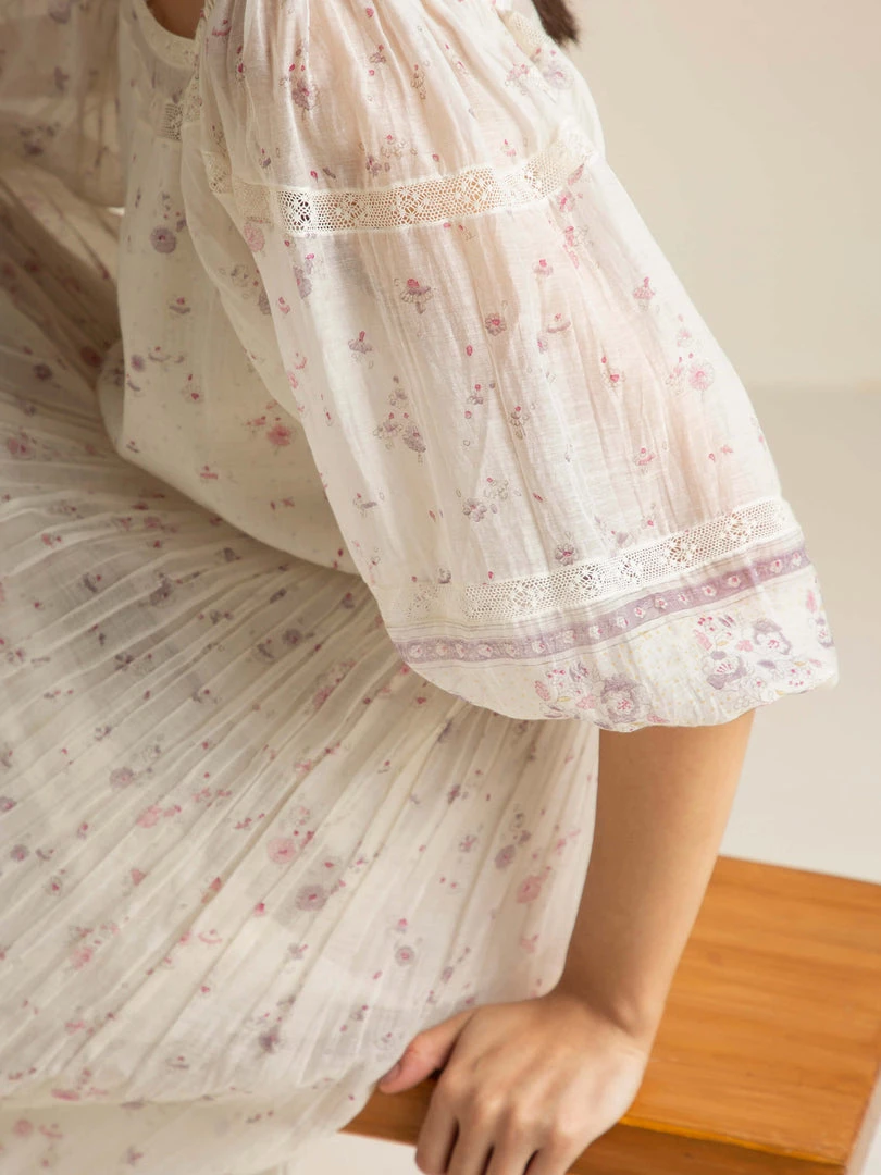 - Subtle gathers on the sleeve armhole with multiple lace inserts