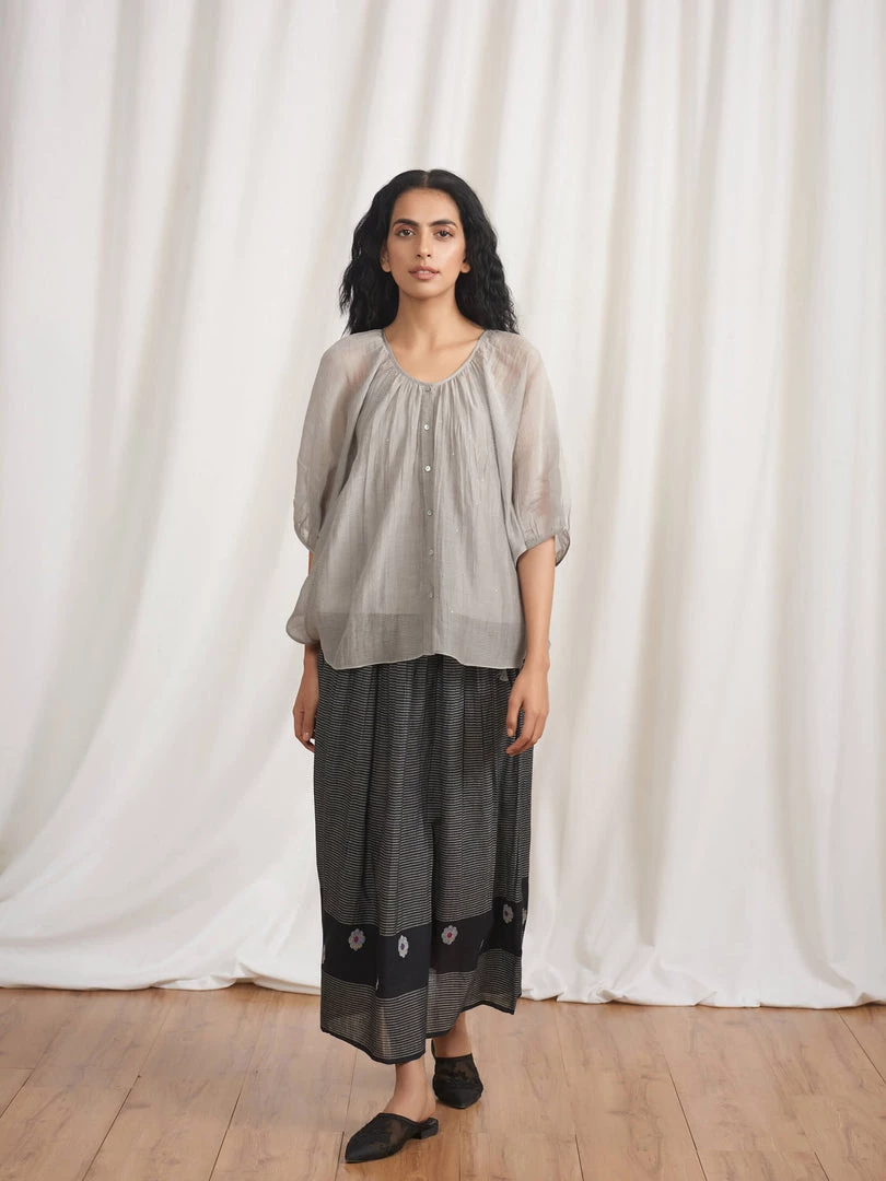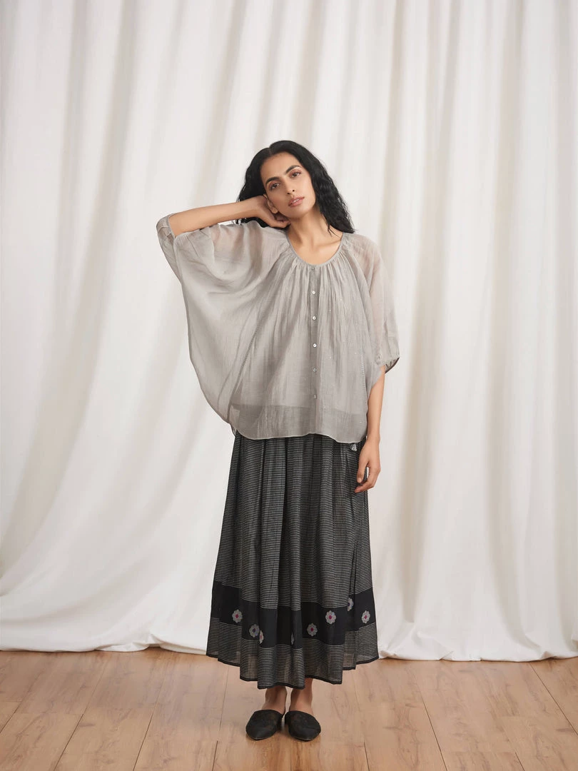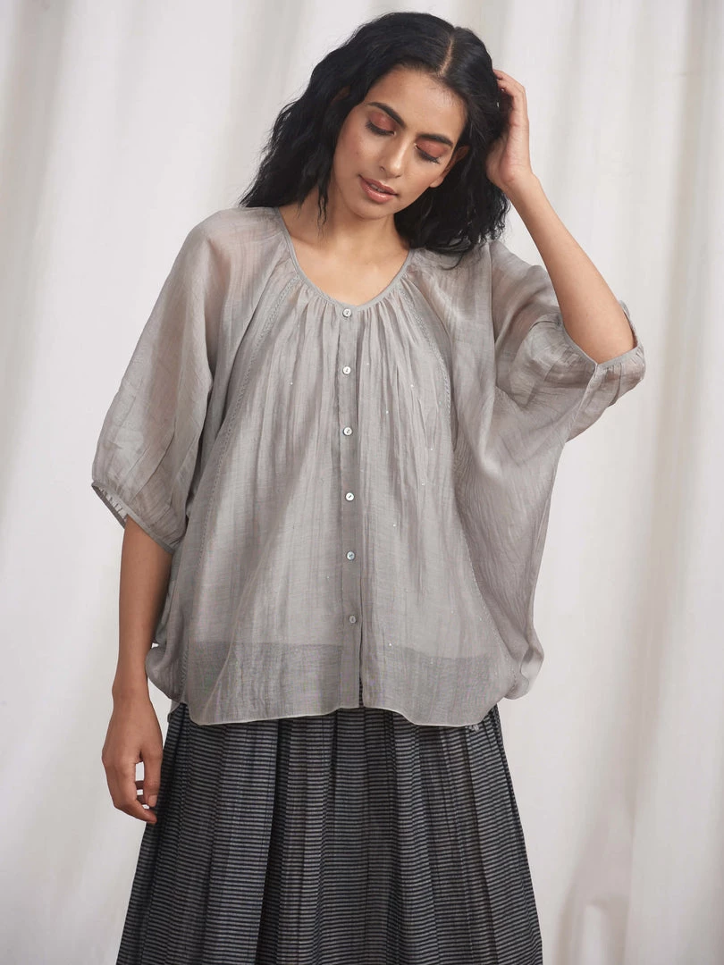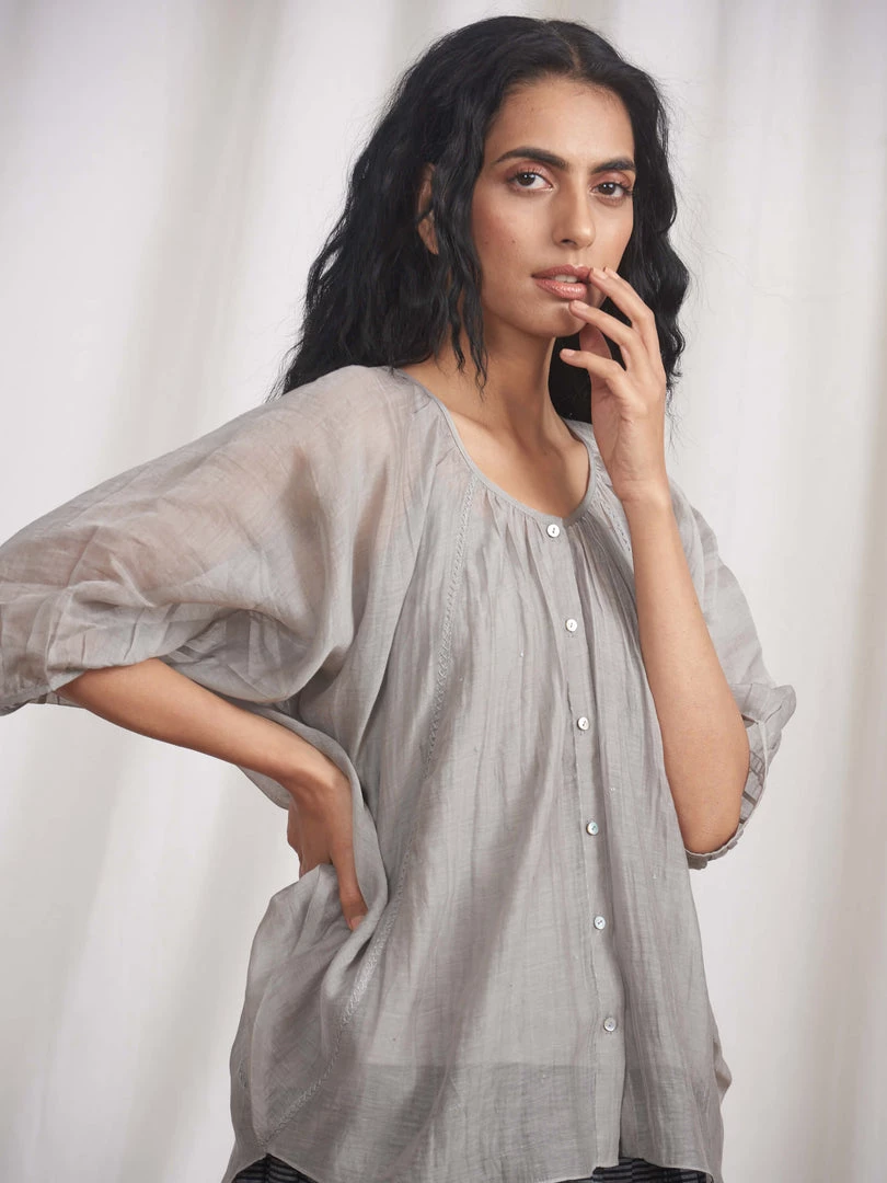 Add some fun to your wardrobe with our light grey top with raglan balloon sleeves and delicate gathers sliding down the length of the front. It has a round neck and can be paired with our Yozora Midi Skirt (K05).