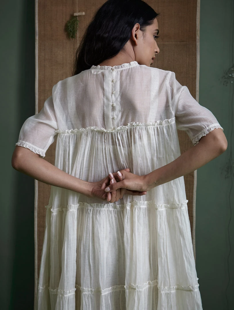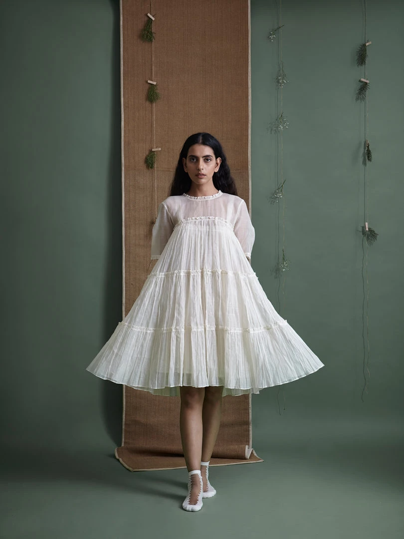 Rediscover that quintessential girly feeling with our three tiered classic dress. It is billowy, charming and fun. The layering is meticulous and precise, and the finishing exquisite, making it ideal for special occasions.Â