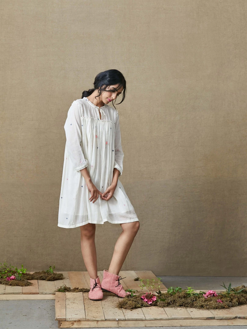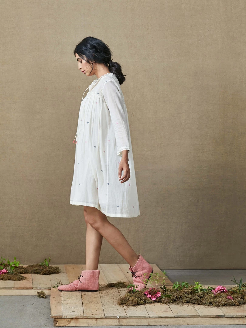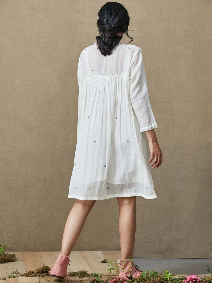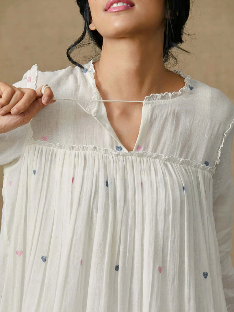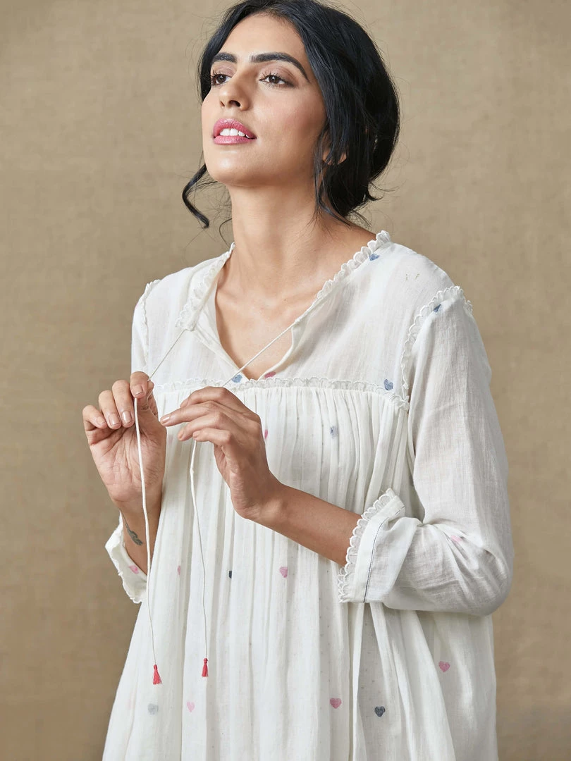 This tunic with subtle gathers, scallop edgings and dainty interwoven heart motifs is a pretty companion for all occasions. The tiny dots on the inner slip peep through the outer layer.