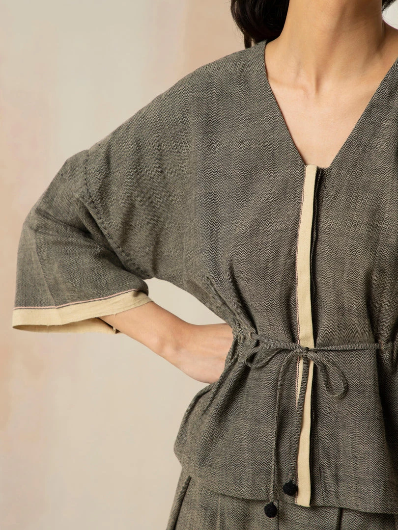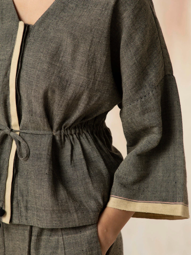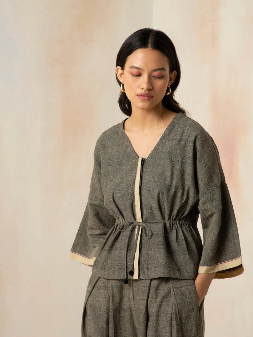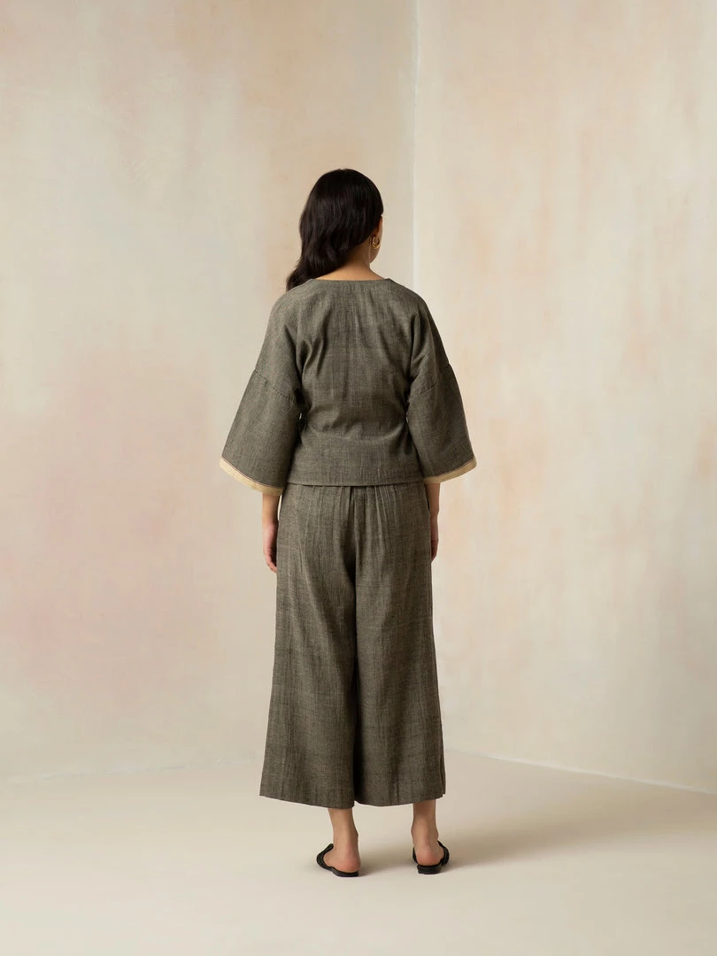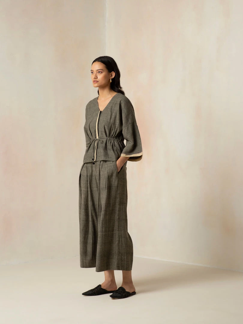 The Nightingale kimono is crafted from handloom cotton, detailed with wide flared sleeves and a drawstring waist. Pair it with our Nightingale Pleated Pants.