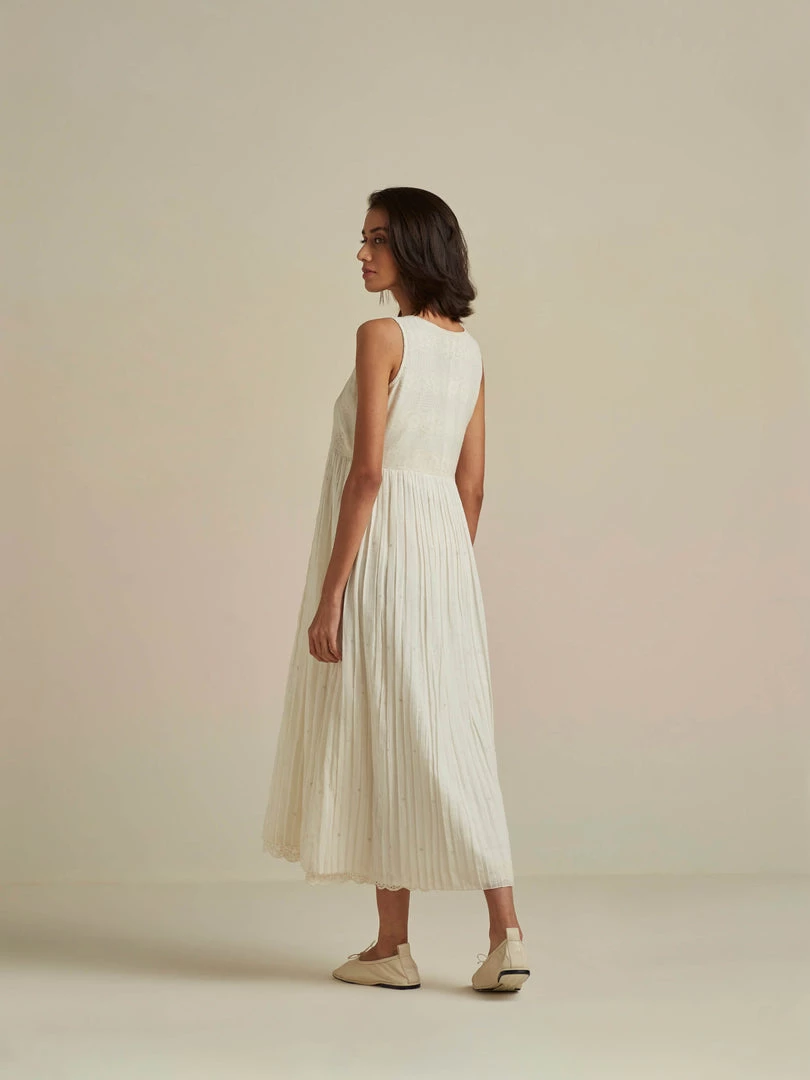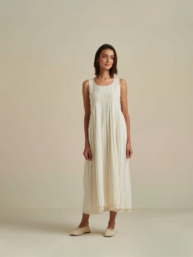 Our elegant Orna Beaded Lace Dress is a piece of pure elegance. The ecru color makes for a timeless hue, and the handmade cotton jamdani fabric is soft and luxurious, a fabric known for its exceptional craftsmanship. A lace panelled yoke, scalloped neckline with pearl beading embroidery and soft gathers on the waist make this dress unapologetically feminine! Â