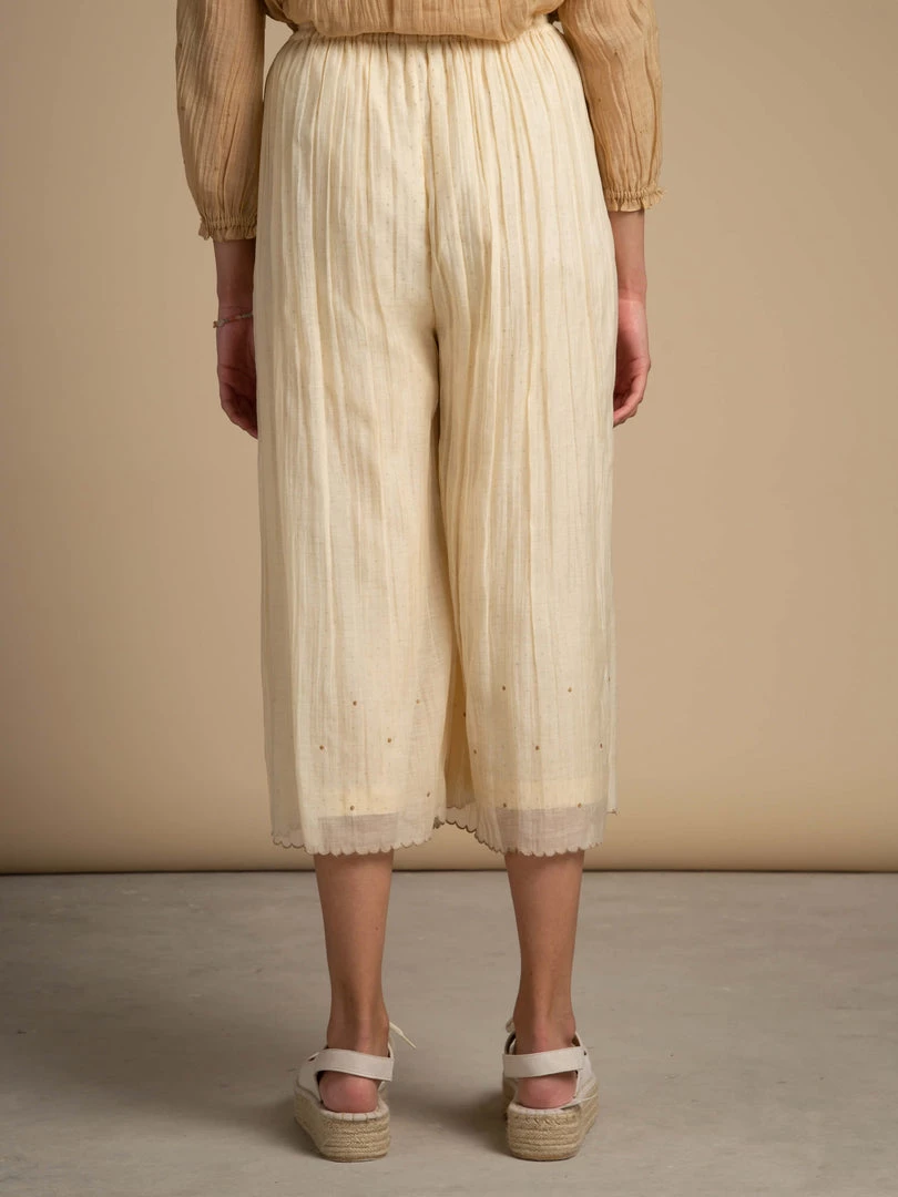 Our honey culottes, made in airy Chanderi fabric have an easy pull-on silhouette with a wide elasticated waistband. Pair it with our Keepsake Tunic for a layered look.Â
