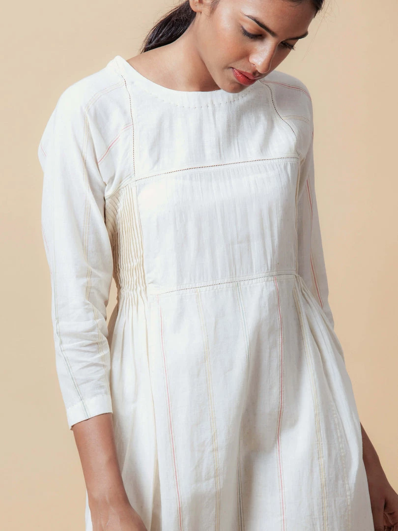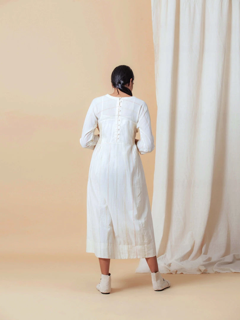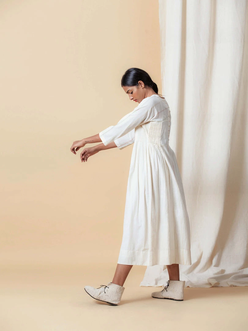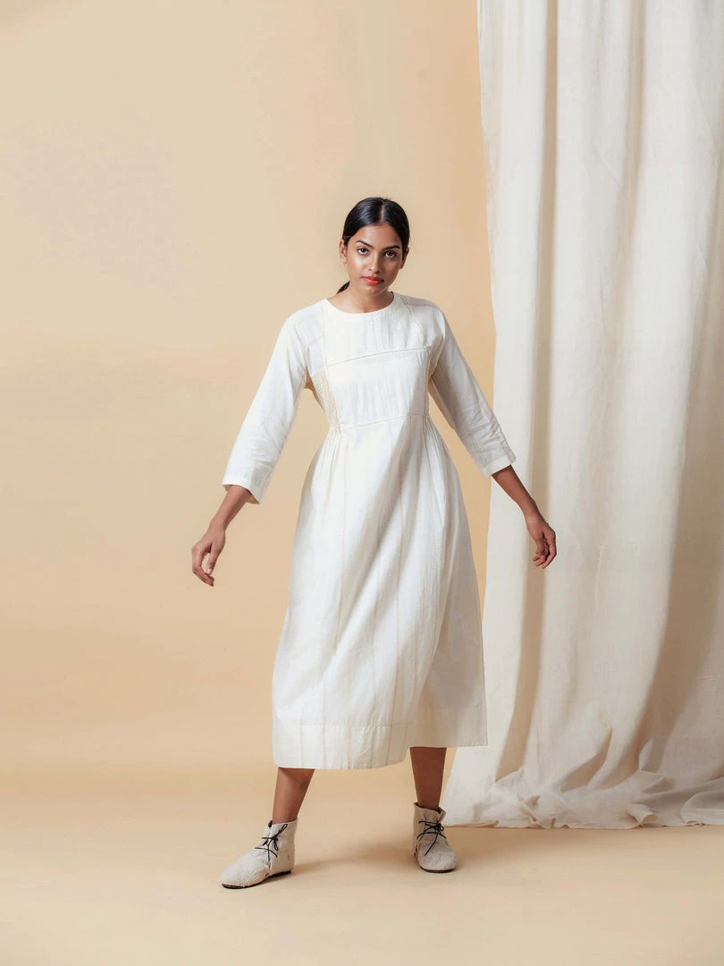This dress is feminine and subtle. Made in ecru coloured handwoven fabric, it features patchwork, beading and side pleat details. Understated with subtle points of interest, it epitomises the Buna ethic. Â
