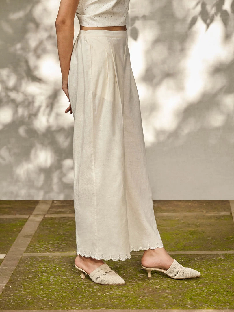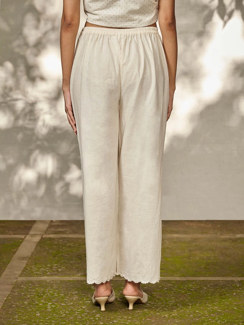 These pants in unbleached handwoven fabric with scalloped edgings have a rich texture and easy fit. Team them up with any of our Jamdani dresses or tops.