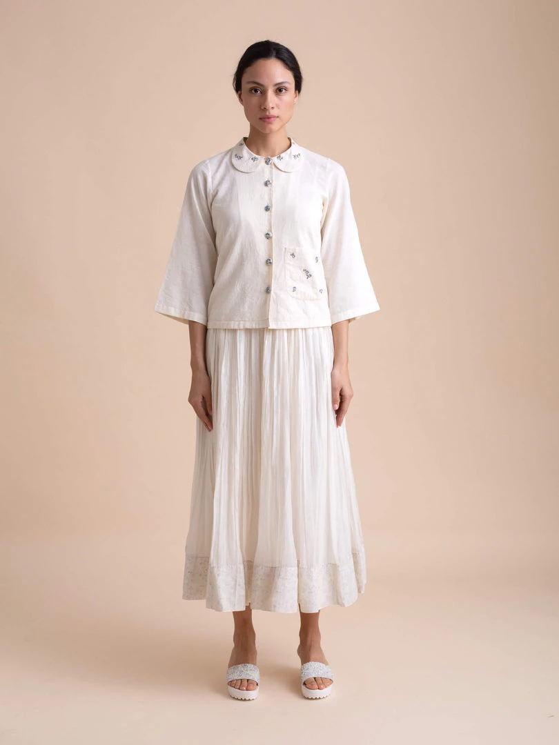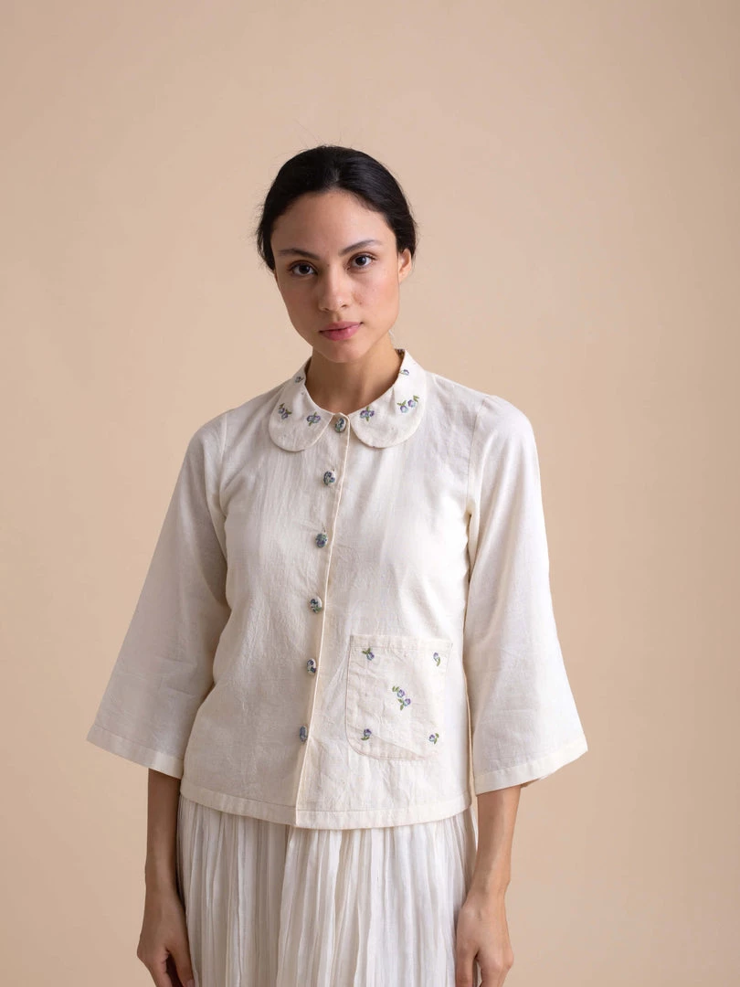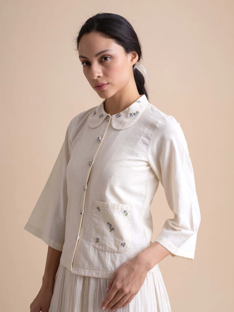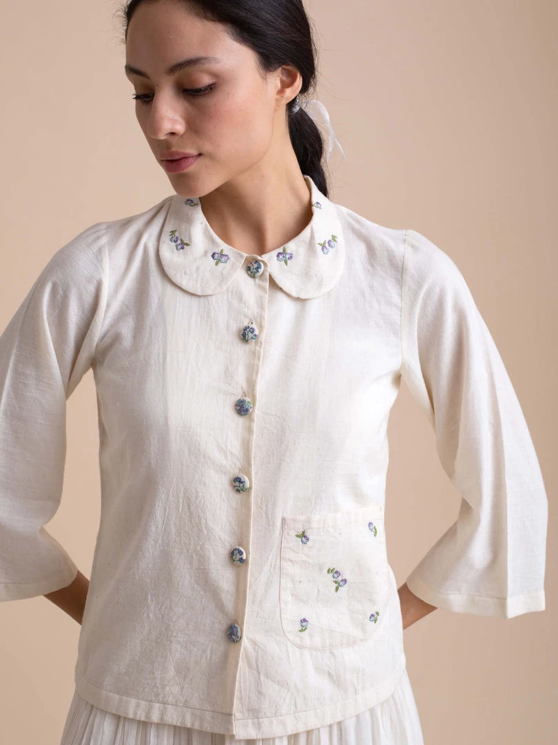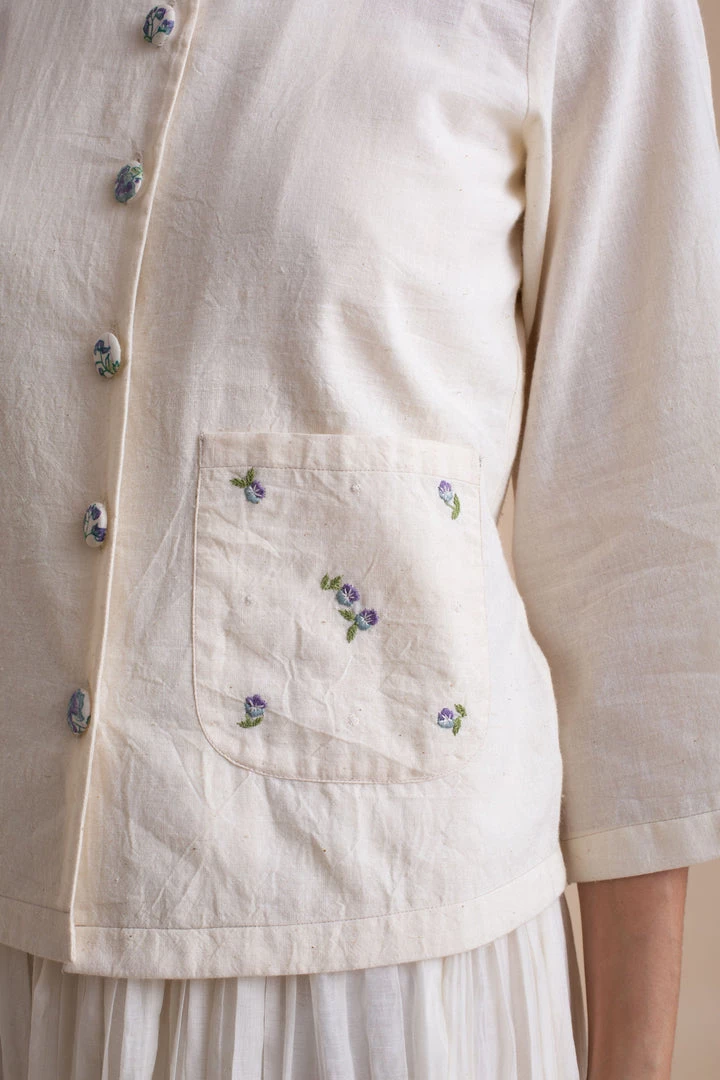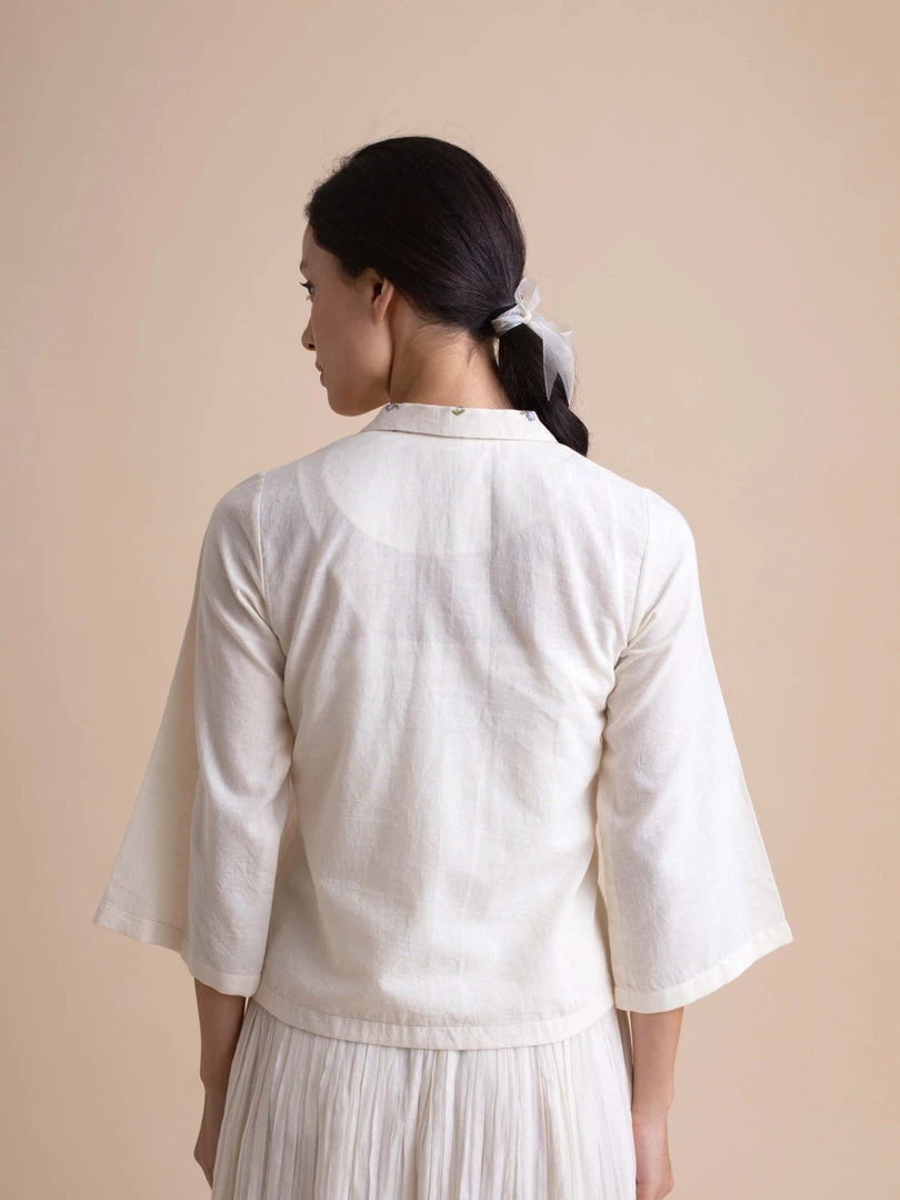 Add charm to your summer dresses and tops with this jacket in ivory colour with delicate embroideries on the collar and handmade buttons.Â