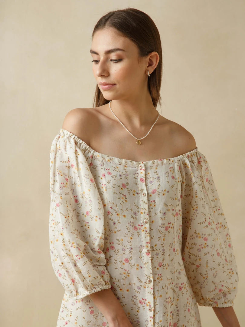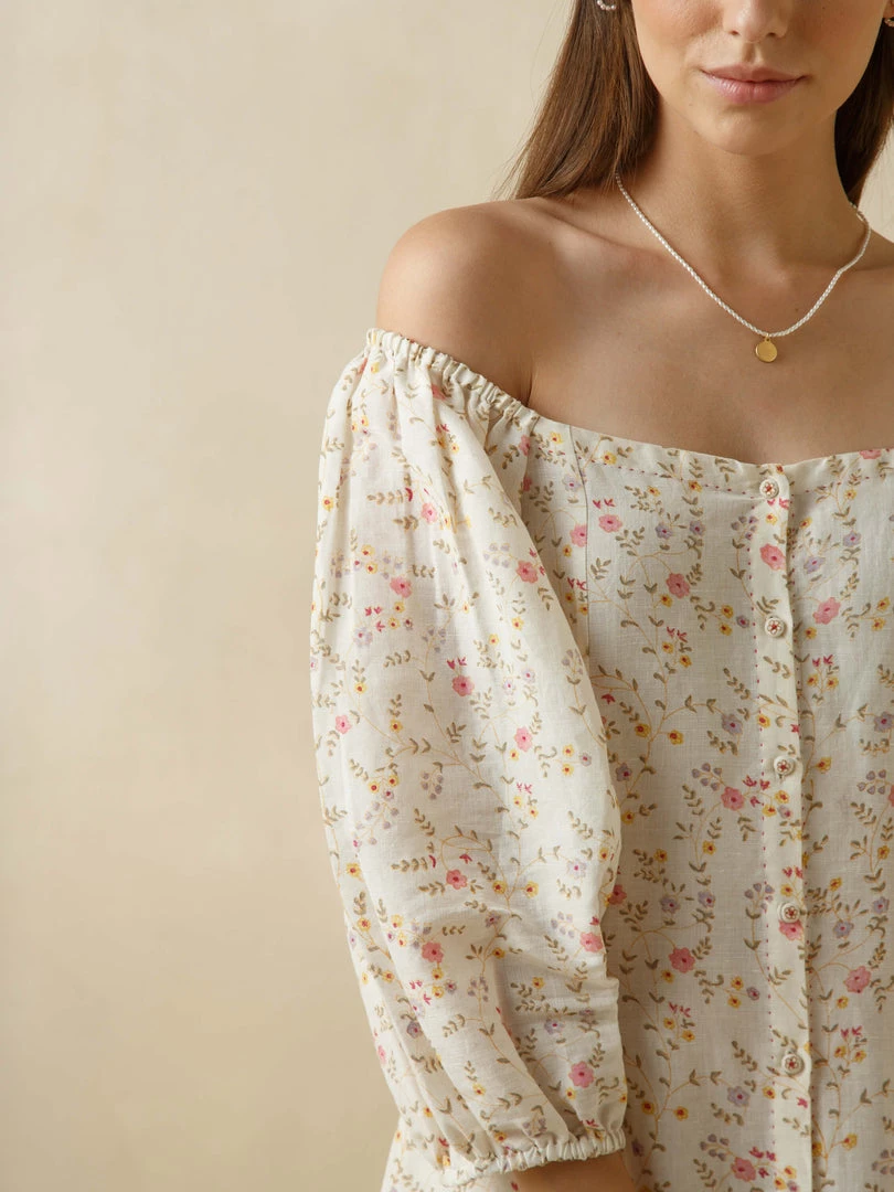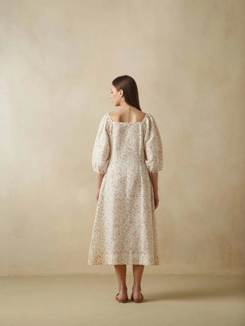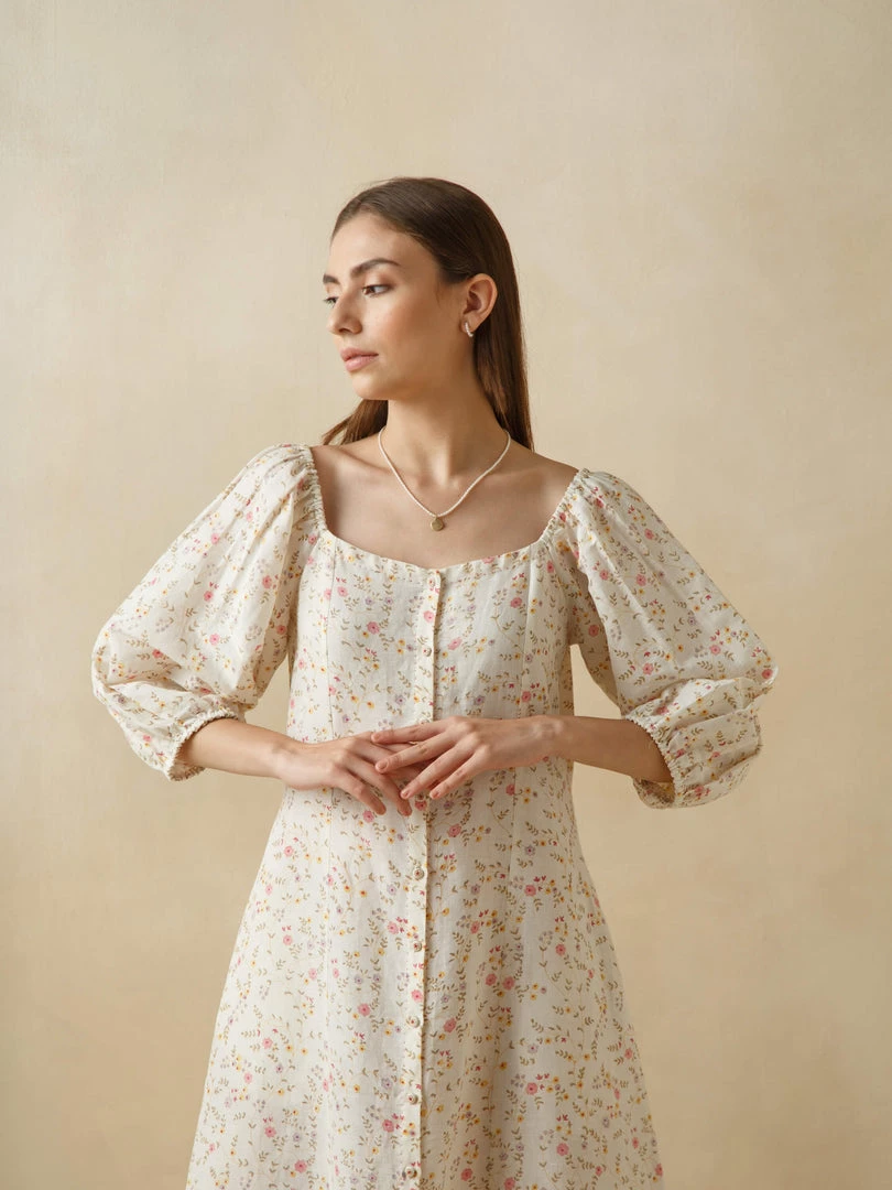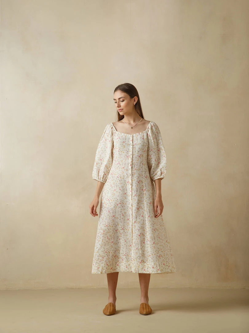 A summer delight, our Periwinkle Linen Dress features a hand block printed floral net on natural linen shade, a sweetheart neckline, elasticated 3/4th puff sleeves, front button enclosures throughout the length of the dress and an a-line silhouette.