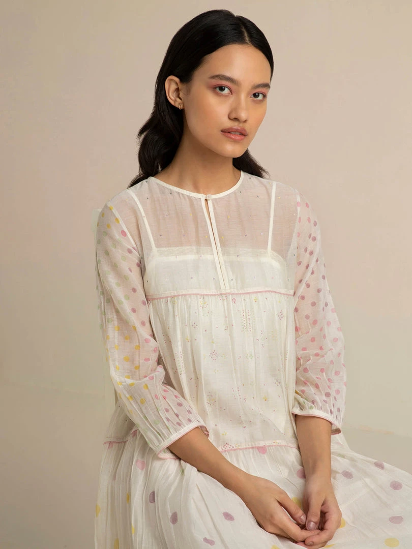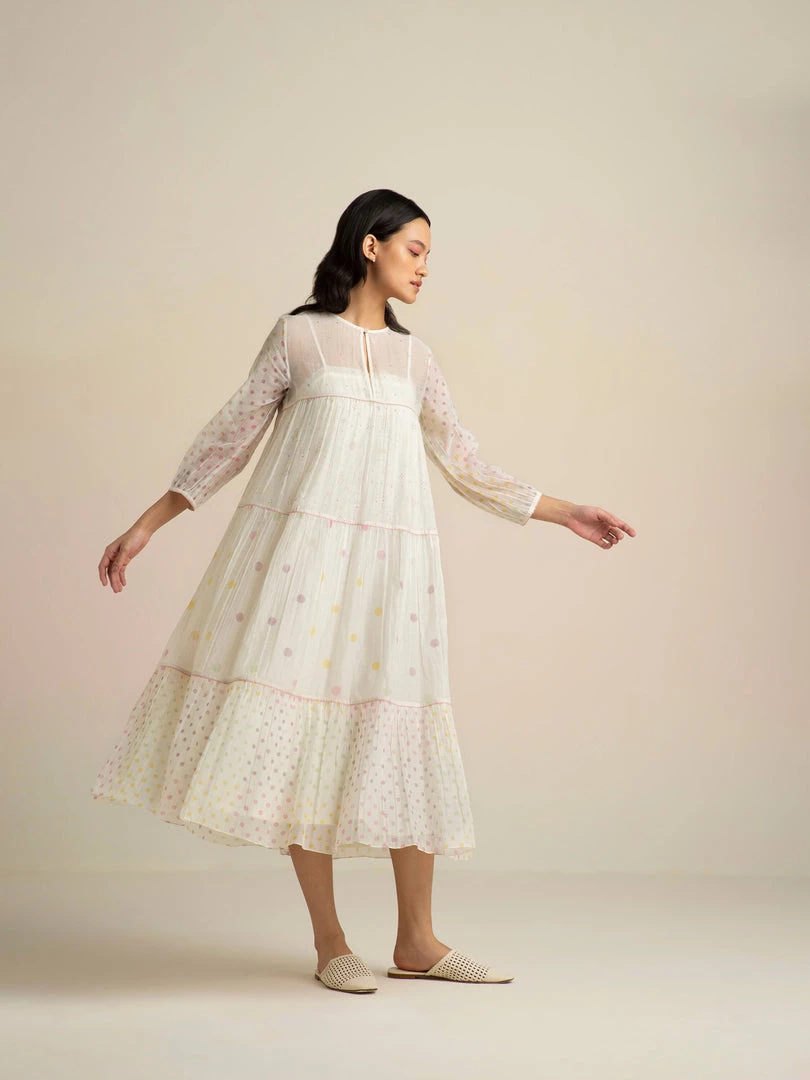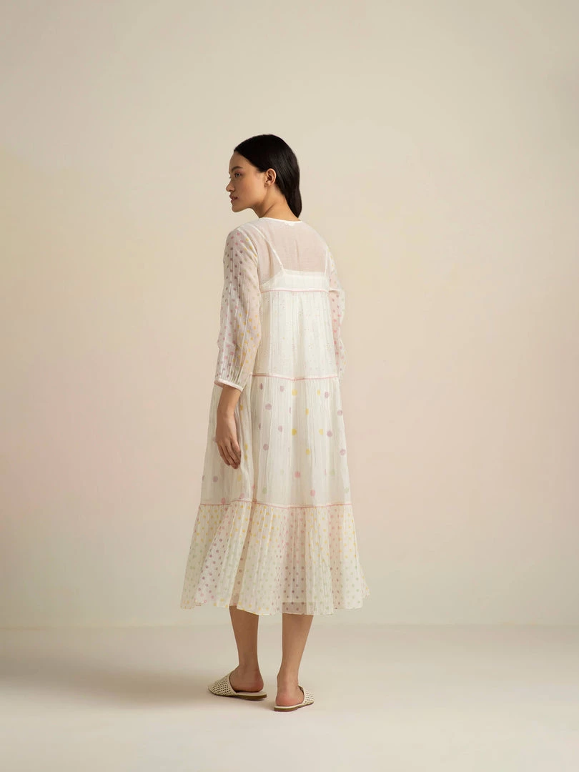 Feel spirited in our Phosphenes Tier Dress hand block printed with pastel polka dots in accents of fuchsia, olive and mauve. Constructed in three tiers with soft gathers, this dress is an everyday spring staple.Â