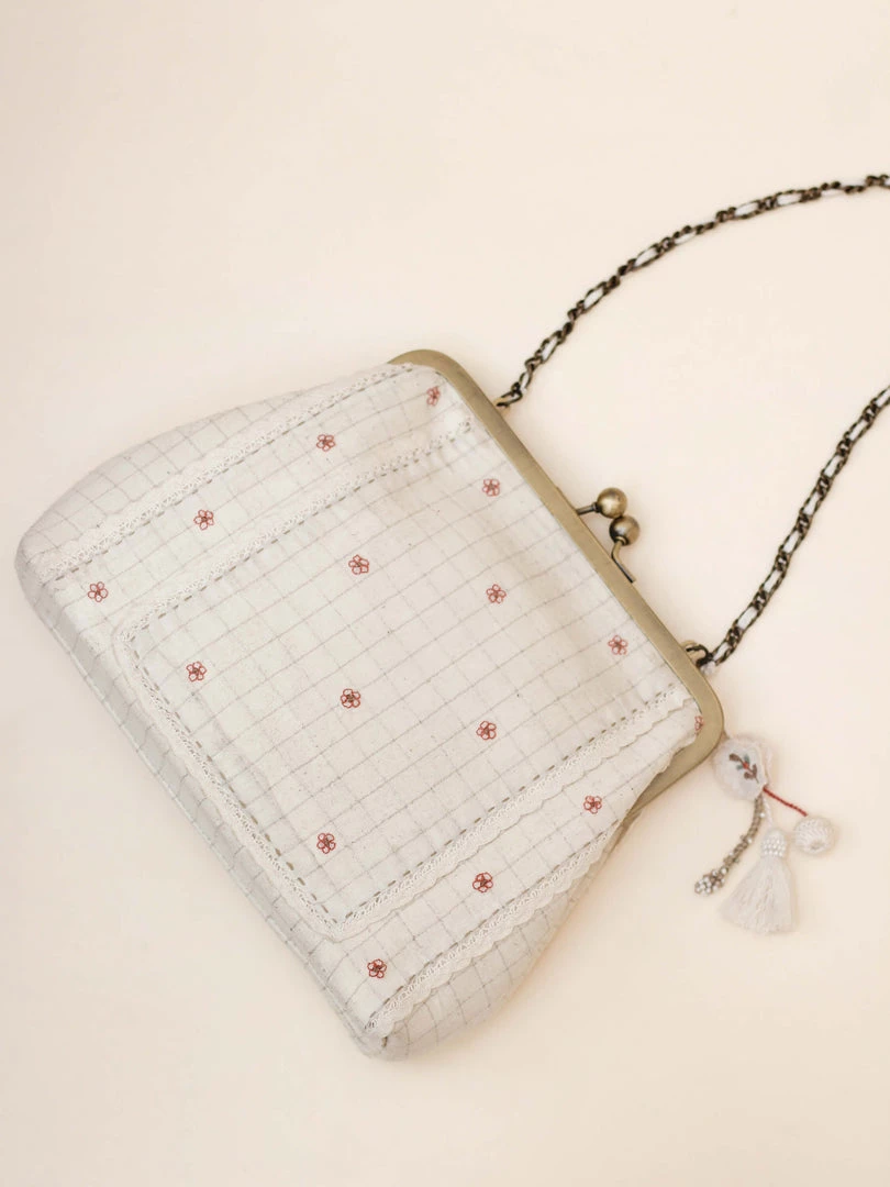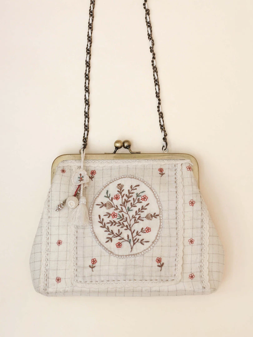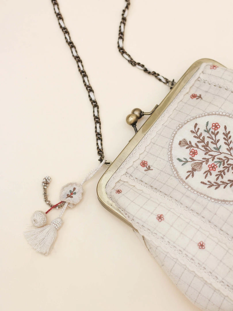 This vintage inspired bag features embroidered medallion and delicate floras, chain handle with tassel hanging and a kiss lock clasp with lace edgings.Â