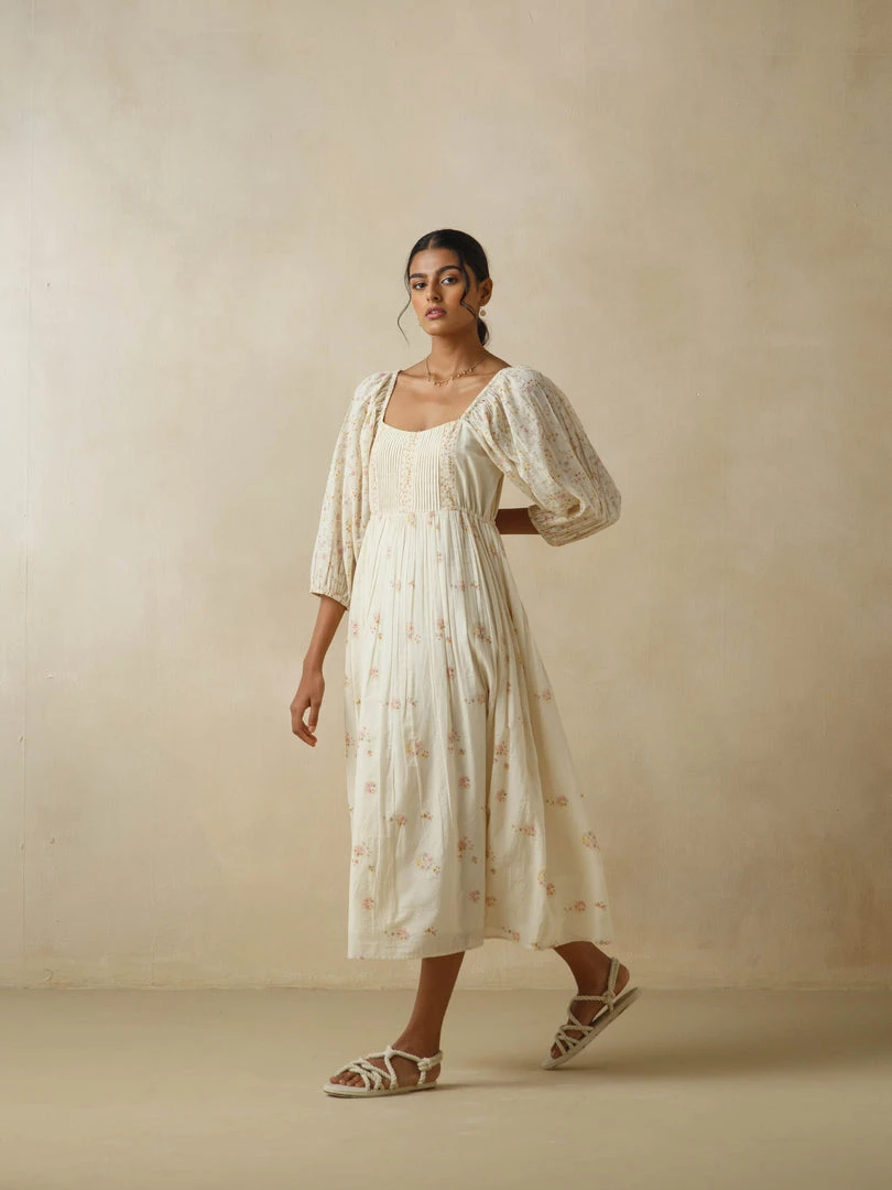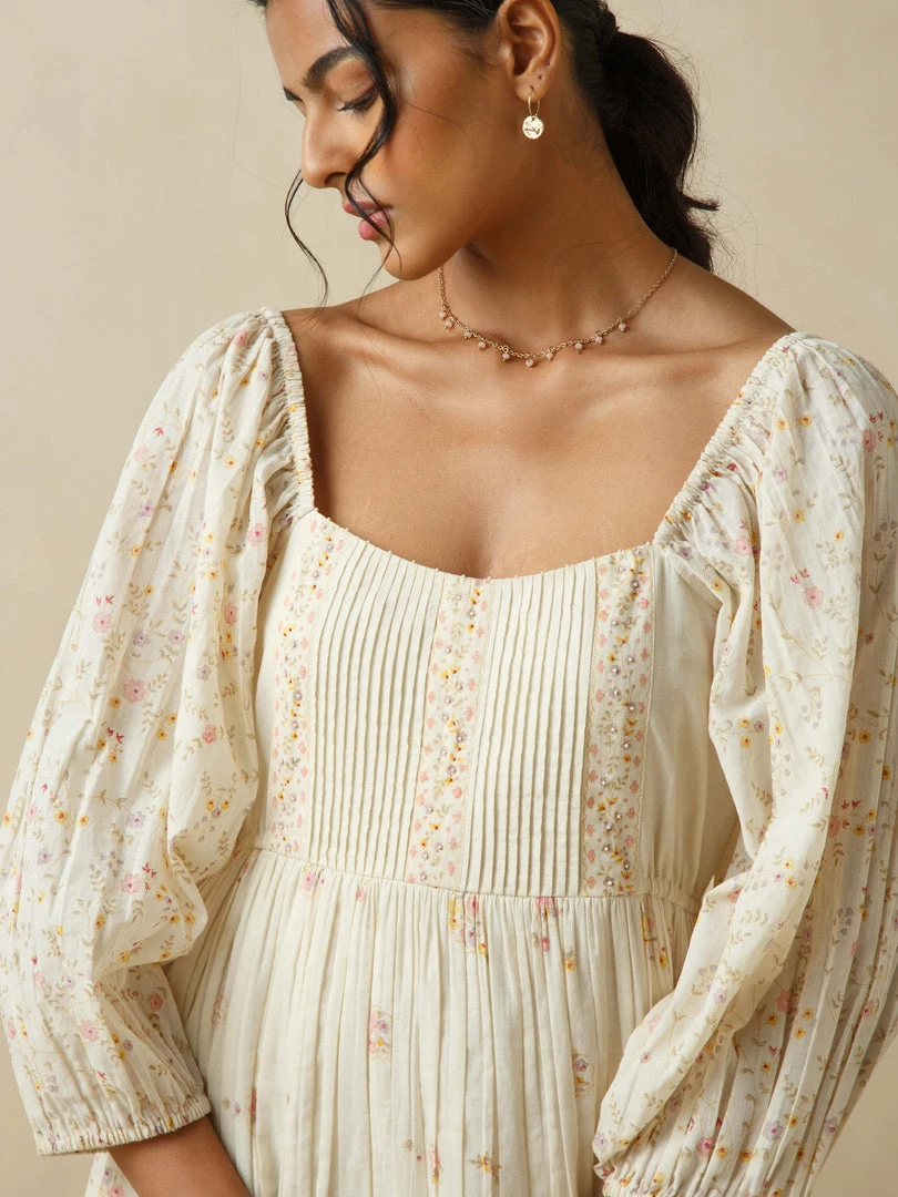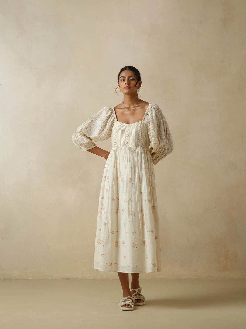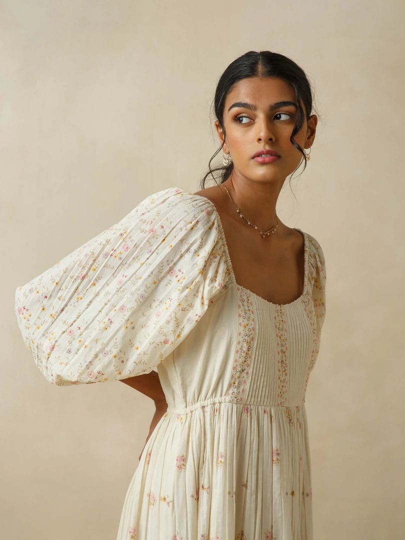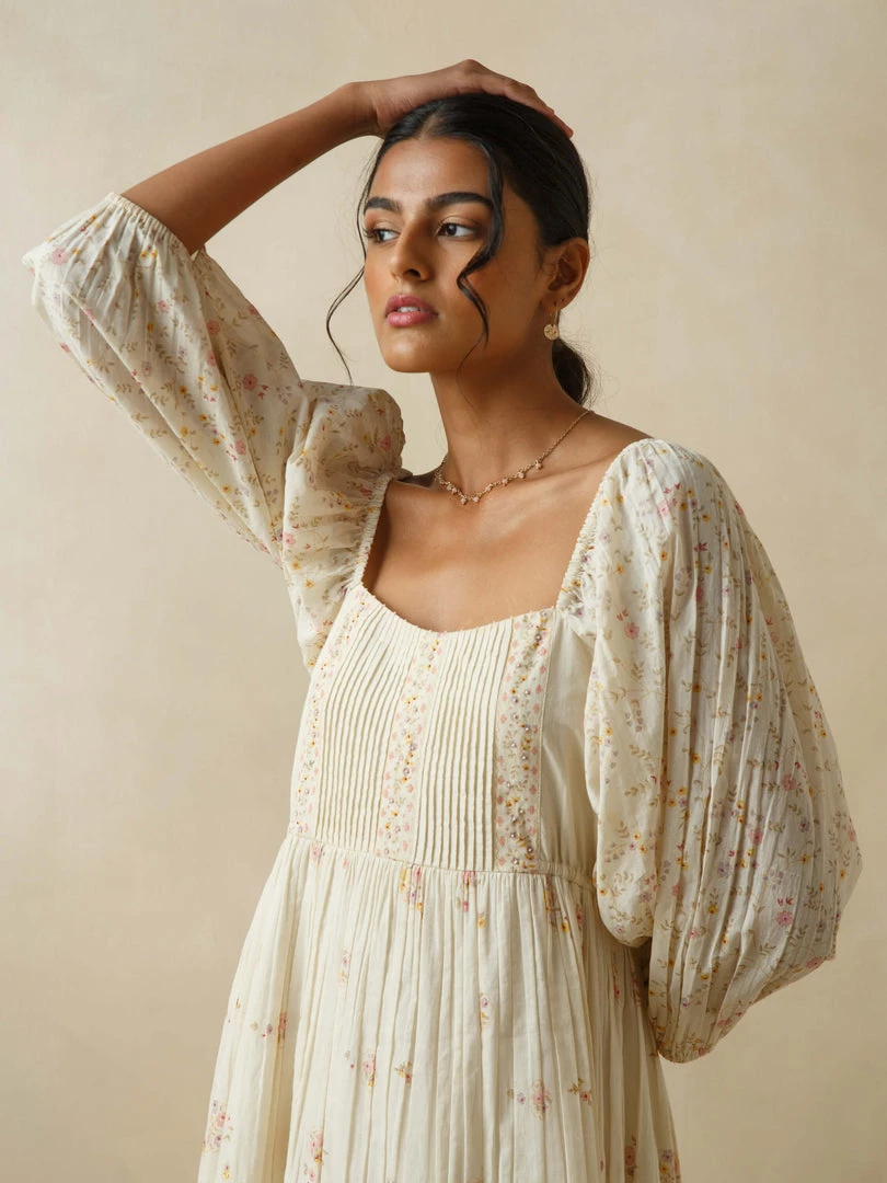 This cotton dress in a shade of ecru features a semi fitted pleated bodice complemented with elasticated balloon sleeves and a tiered skirt.Â