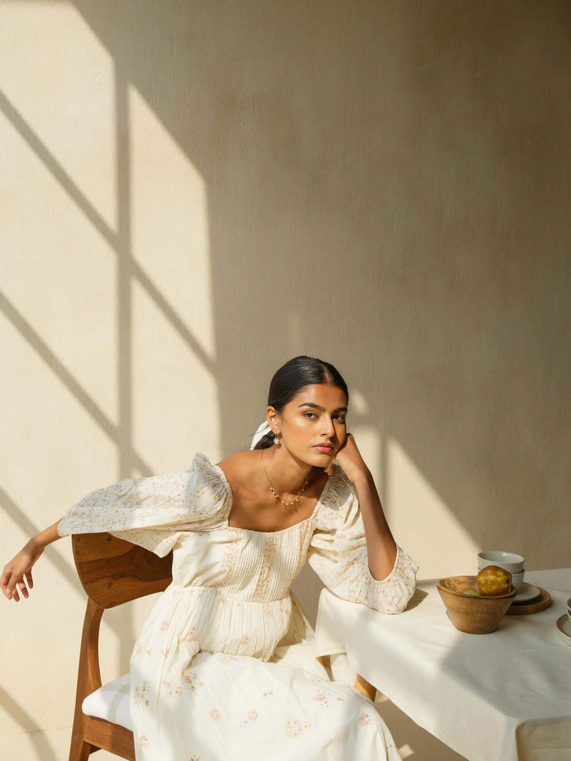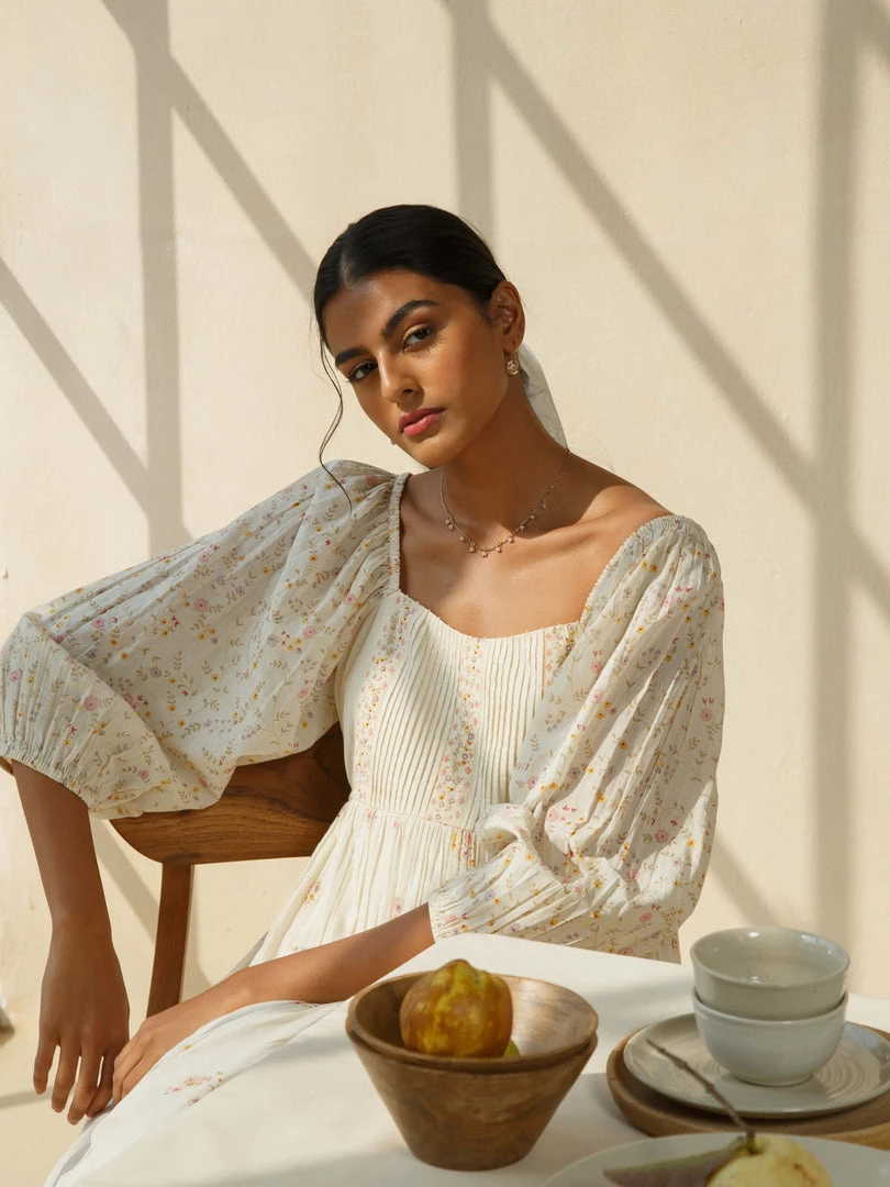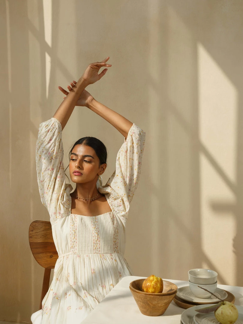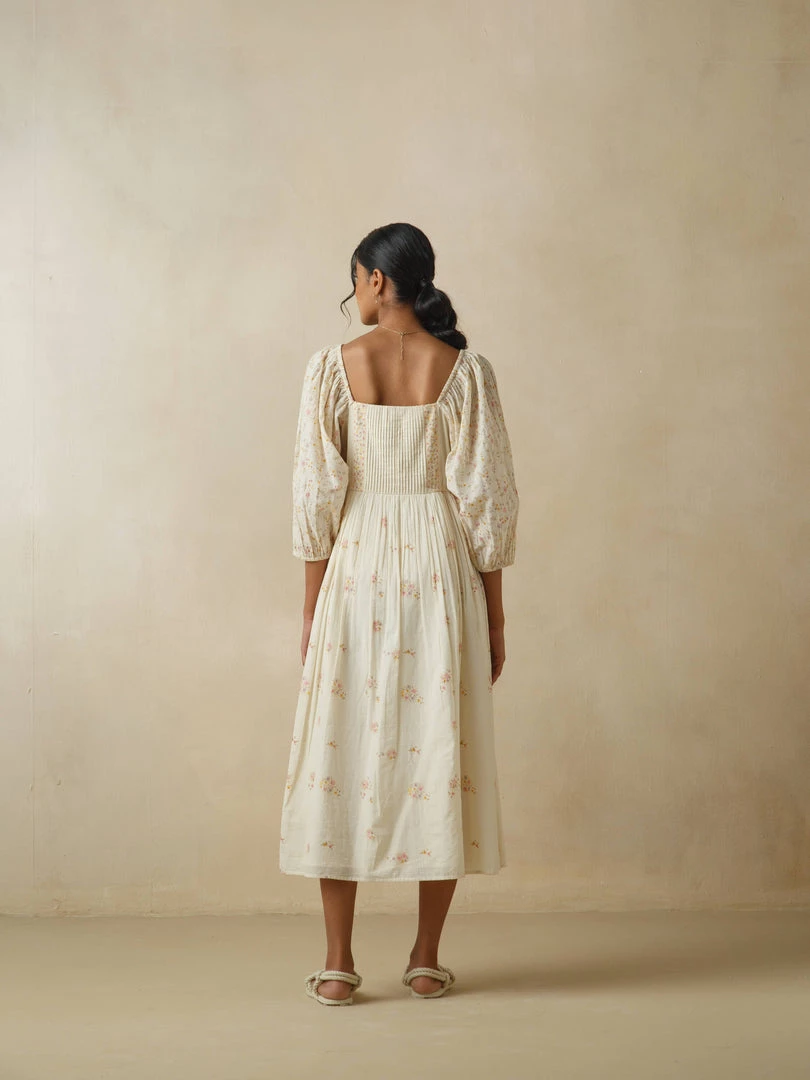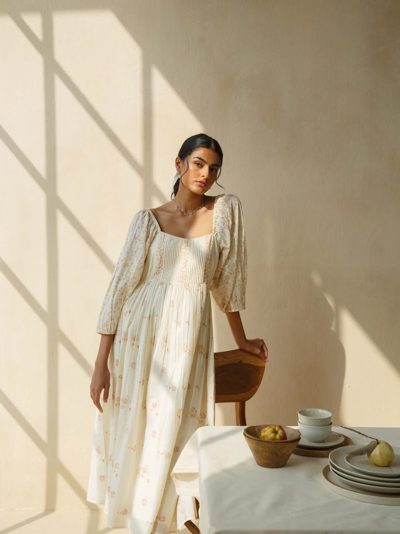 This cotton dress in a shade of ecru features a semi fitted pleated bodice complemented with elasticated balloon sleeves and a tiered skirt.Â