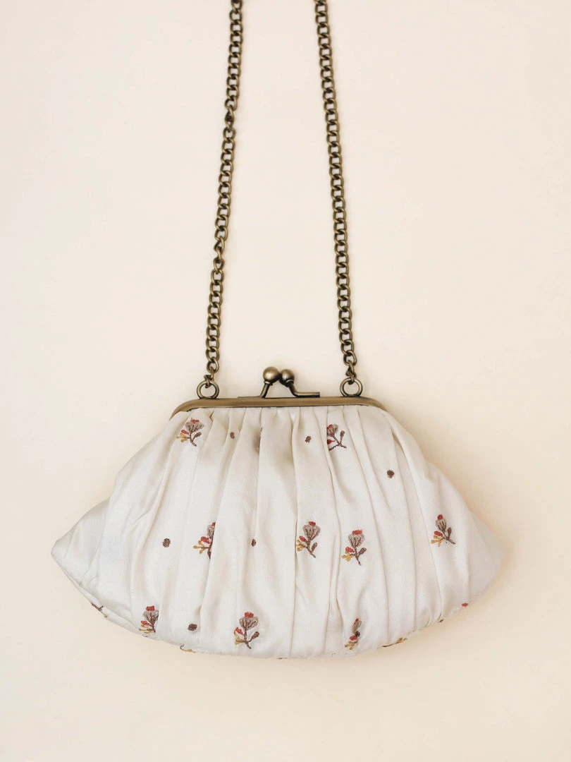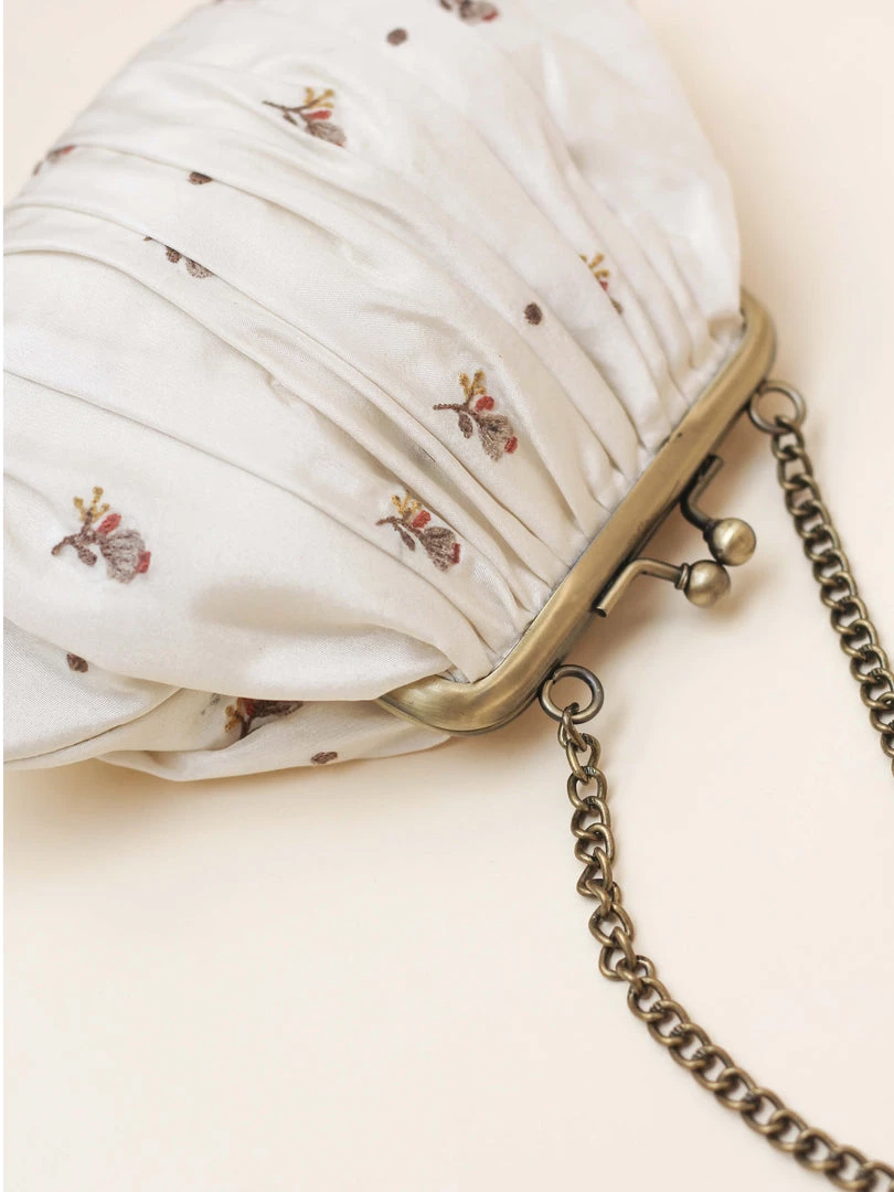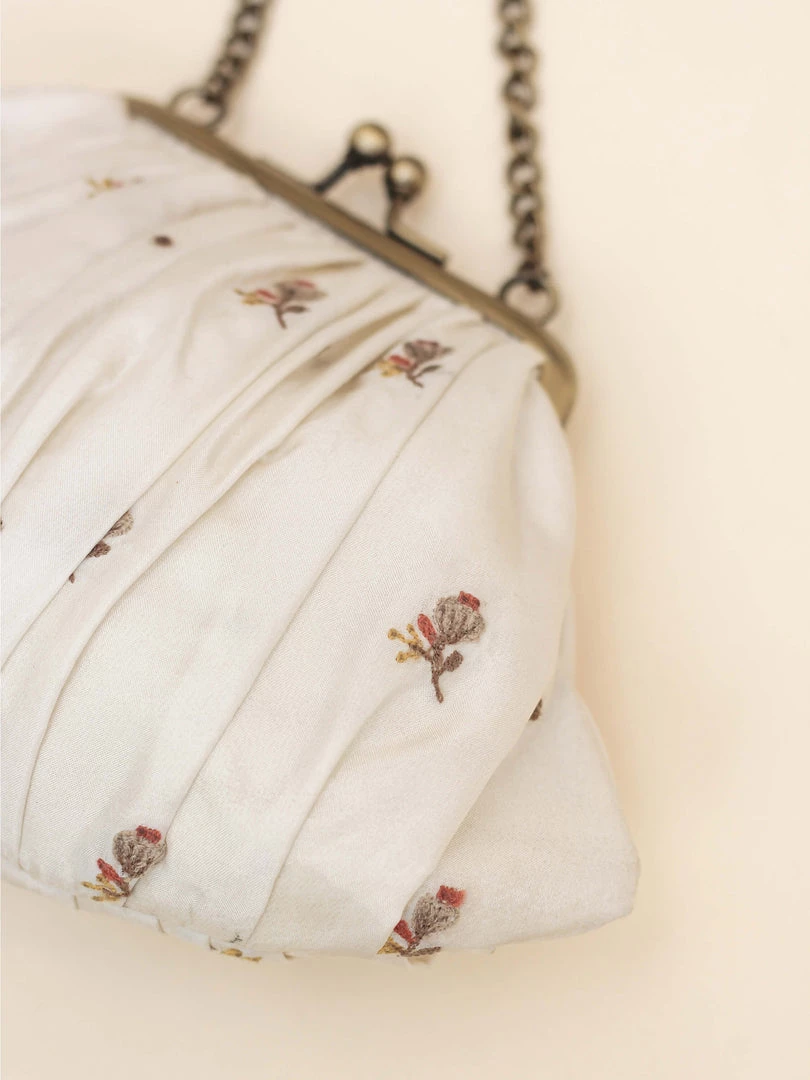 This is a vintage clasp bag in muted cream, layered with luxurious silk, floral embroidery all over and gathered along the clasp.