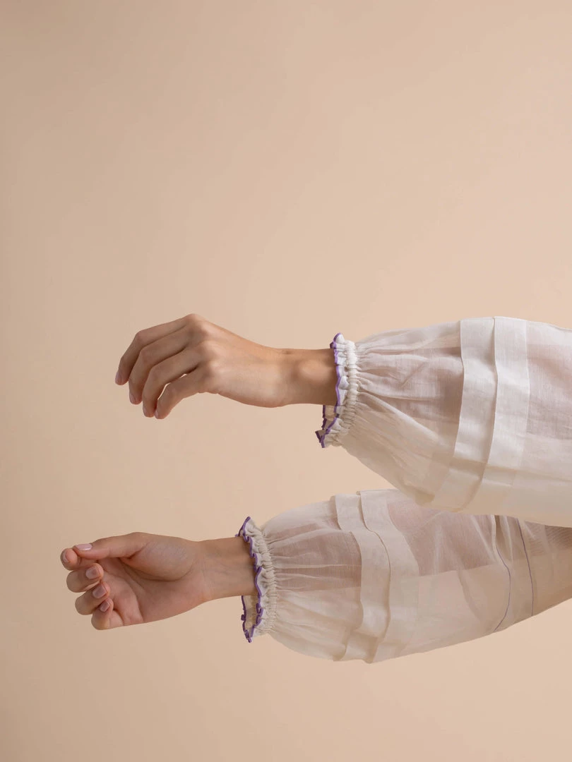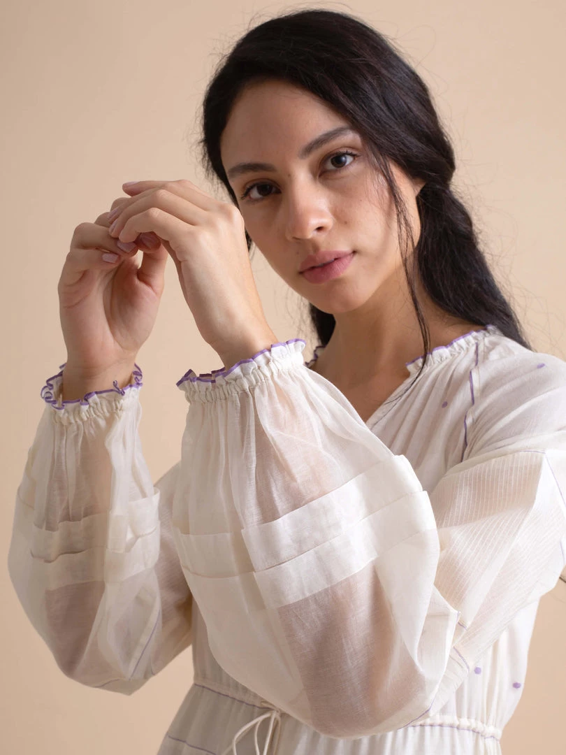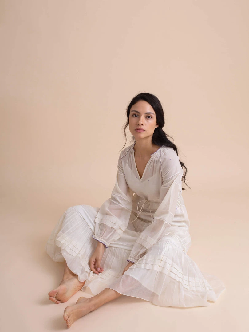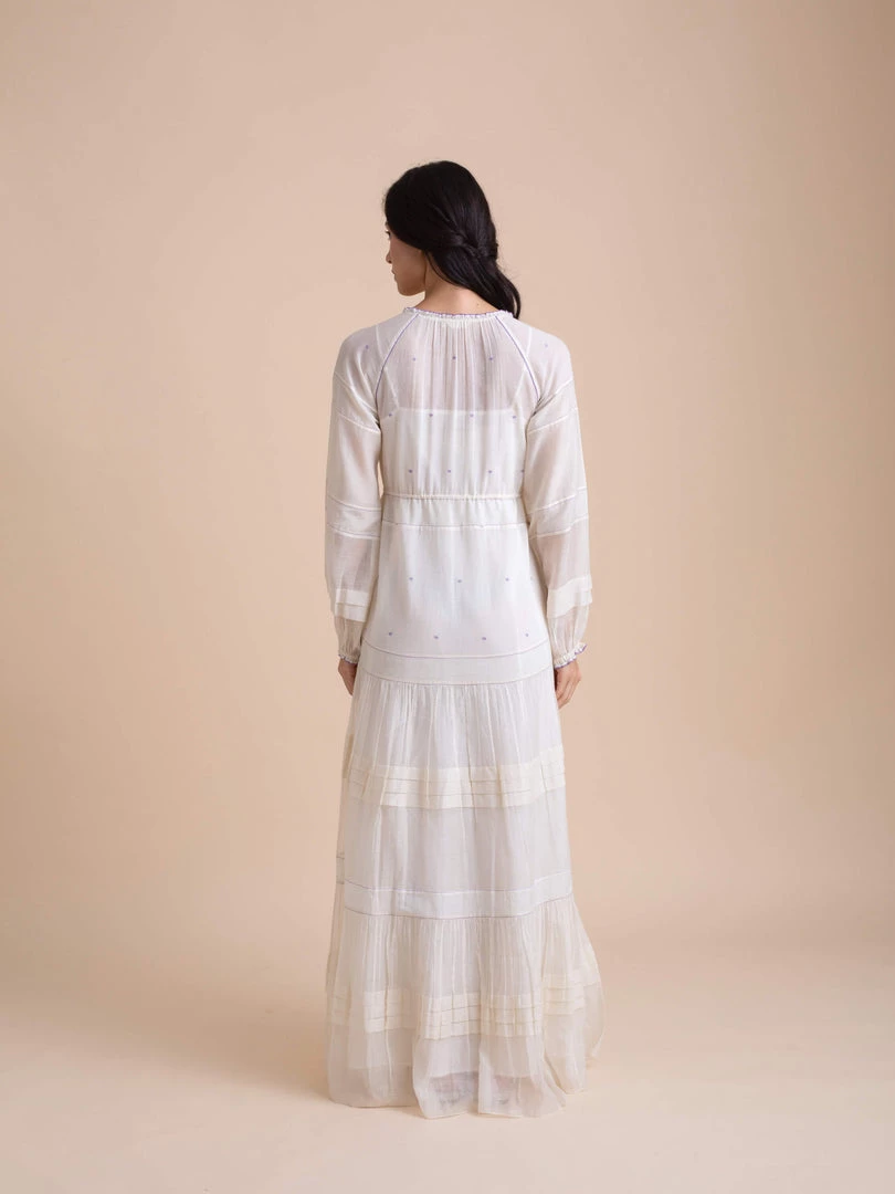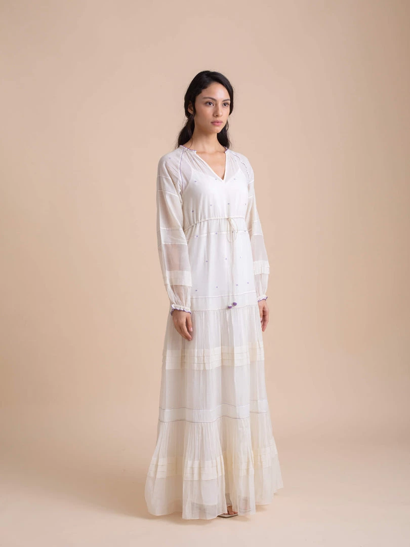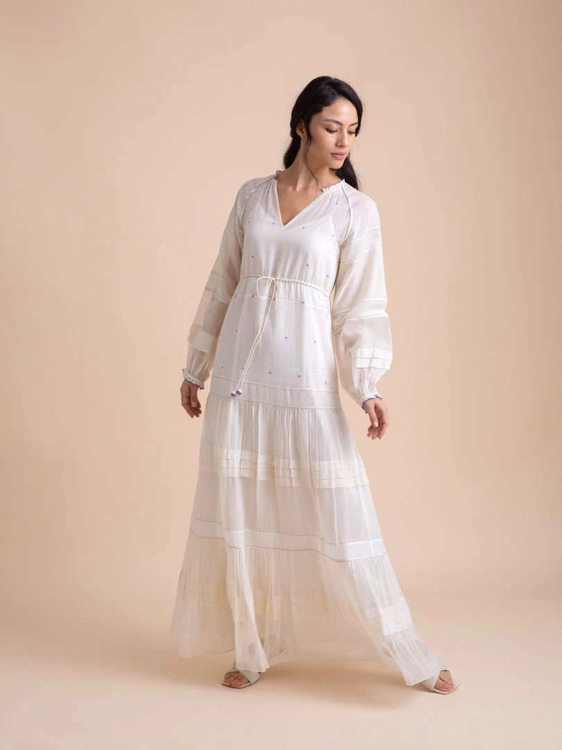 Pieced and patched together from different weights of handwoven cotton silks, this light and breezy maxi is a potpourri of happy dreams! This cream midi dress with full sleeves, tie up waist and full, tiered skirt.